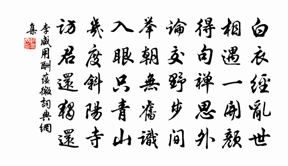 詩詞名句歷史字典書法欣賞書法字典國語詞典說文解字康熙字典古漢語字典標 題 作 者 詩 句 酬蘊微作者:李鹹用 朝代:唐代酬蘊微原文白衣經亂世,相遇一開顏。得句禪思外,論交野步間。舉朝無舊識,入眼只青山。幾度斜陽寺,訪君還獨還。詩詞問答問:酬蘊微的作者是誰?答:李鹹用問:酬蘊微寫於哪個朝代?答:唐代李鹹用酬蘊微書法欣賞酬蘊微書法作品注釋全唐詩:卷645-55詩詞推薦享太廟樂章長發舞魏徵〔唐代〕濬哲惟唐,長發其祥。帝命斯祐,王業克昌。配天載德,就日重光。本枝百代,申錫無疆。魏南夫丞相輓詩二首釋寶曇〔宋代〕未必山東相,能留塞北聲。一身扶國是,九鼎重吾盟。水鏡人材地,風流月旦評。早收霖雨去,星角看春耕。滿江紅(北岩寺餞別張子儀,醉歸口占)管鑒〔宋代〕百罰深杯,都不記、歸來時節。仿佛聽、重城更鼓,催成離缺。江上愁心山斂翠,津頭夜色沙如雪。漸中年、懷抱子夜薛能〔唐代〕嫖姚家宴敵吳王,子夜歌聲滿畫堂。此日相逢眉翠盡,女真行李乞齋糧。元夕偶成蘇籀〔宋代〕里唱塗謳鐃吹轟,軟塵梁苑記前生。寶珠穿蟻嬉遊肆,蓮蕊然犀 * 。透碗燈繁人晝繡,隔羅光醖酒澠清。春娃貧女吟薛逢〔唐代〕殘妝滿面淚闌乾,幾許幽 * 話難。雲髻懶梳愁拆鳳,翠蛾羞照恐驚鸞。南鄰送女初鳴珮,北里迎妻已夢蘭。惟有小飲賞菊陸游〔宋代〕菊得霜乃榮,性與凡草殊。我病得霜健,每卻稚子扶。豈與菊同性,故能老不枯?今朝喚父老,採菊陳酒壺。舉袖又記呂岩〔唐代〕數載樂幽幽,欲逃寒暑逼。不求名與利,猶恐身心役。苦志慕黃庭,殷勤求道跡。陰功暗心修,善行長日積。世路絕句四首周文璞〔宋代〕解呼威羽歸丹穴,可縛單于獻漢宮。四面八方籠不住,許來分坐此山中。歲晏無聊收叔氏訊吳潛〔宋代〕豢成凋郡力難任,雪上加霜兩鬢侵。四五更頭猿鶴夢,數千里外鶺鴒心。老來倍覺光陰促,休去方知意味深。陶白觀浙江濤徐凝〔唐代〕浙江悠悠海西綠,驚濤日夜兩翻覆。錢塘郭里看潮人,直至白頭看不足。出塞二首王昌齡〔唐代〕秦時明月漢時關,萬里長征人未還。但使龍城飛將在,不教胡馬度陰山。騮馬新跨白玉鞍,戰罷沙場月色寒。城頭燕新利路李運使致語口號魏了翁〔宋代〕怪底梅花破臘前,只因春色到湖邊。虹飛雲錦看華轡,膾縷蓴絲秩玳筵。今日房園供解後,明朝漢省接馨妍。一觴皇太后合春帖子六首蘇頌〔宋代〕東郊青幘拜春回,迎得陽和次第來。風向烏竿千里應,氣隨魚鑰九重開。偈頌二十一首釋普寧〔宋代〕無心游此國,有心復宋國。有心無心中,通天路頭活。拄杖頭邊胱日月。對鏡陸游〔宋代〕面大如盤七尺身,珥貂自合上麒麟。詩家事業君休問,不獨窮人亦瘦人。答費宰方岳〔宋代〕野人拙生事,瓶粟蓋無幾。唯有松下風,領略時一至。邇來風亦無,抱瓮豈得已。賴有大夫公,入山喚龍起。鐵笛慶老石帆庵李邴〔宋代〕鶉作衣裳鐵作肝,老將身事付寒岩。諸天香積猶多供,百鳥山花已罷銜。定起水沉和月冷,詩成冰彩敵雲緘。山頭題石壁山紹上人觀風亭釋智圓〔宋代〕界江千萬山,石壁惟清幽。中有忘機人,超然樂岩丘。創亭號觀風,嘉景自成收。群峰呈晚碧,長溪瀉寒流。視聽題上亭驛魏了翁〔宋代〕紅錦繃盛河北賊,紫金盞酌壽王姬。弄成晚歲琅當曲,正是三郎快活時。名句推薦夭夭園桃,無子空長。曹丕《煌煌京洛行》 人歸山郭暗,雁下蘆洲白。韋應物《夕次盱眙縣》 想文君望久,倚竹愁生步羅襪。姜夔《八歸·湘中送胡德華》 傷心莫語,記那日旗亭,水嬉散盡,中酒阻風去。納蘭性德《摸魚兒·午日雨眺》 君到姑蘇見,人家盡枕河。杜荀鶴《送人游吳》 只在此山中,雲深不知處。賈島《尋隱者不遇 / 孫革訪羊尊師詩》 行人莫便消魂去,漢渚星橋尚有期。晏幾道《鷓鴣天·梅蕊新妝桂葉眉》 惡有釁,雖貴罰也。左丘明《國語·魯語·臧文仲請賞重館人》 柳葉雙眉久不描,殘妝和淚污紅綃。江采萍《謝賜珍珠》 醉別復幾日,登臨遍池台。李白《魯郡東石門送杜二甫》