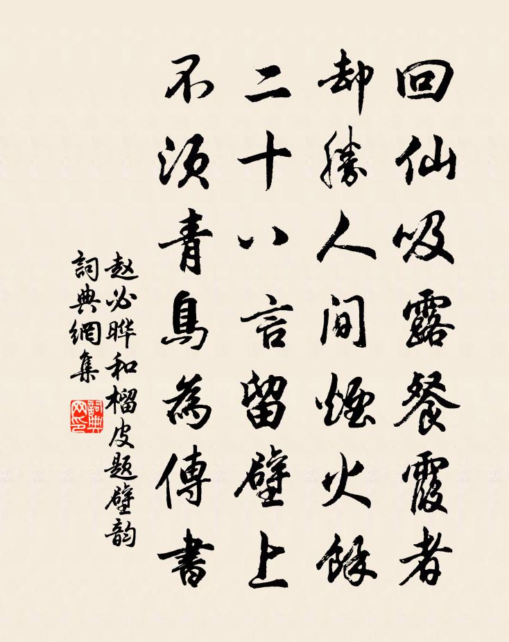 詩詞名句歷史字典書法欣賞書法字典國語詞典說文解字康熙字典古漢語字典標 題 作 者 詩 句 和榴皮題壁韻作者:趙必曄 朝代:宋代和榴皮題壁韻原文回仙吸露餐霞者,卻勝人間煙火餘。二十八言留壁上,不須青鳥為傳書。詩詞問答問:和榴皮題壁韻的作者是誰?答:趙必曄問:和榴皮題壁韻寫於哪個朝代?答:宋代趙必曄和榴皮題壁韻書法欣賞和榴皮題壁韻書法作品詩詞推薦失調名佚名〔宋代〕瑞霞成綺。映舴艋棹輕,鯉魚狂風起。雪中寄李知誨判官方乾〔唐代〕聚散聯翩急復遲,解將華發兩相欺。雖雲竹重先藏路,卻訝巢傾不損枝。入戶便從風起後,照窗翻似月明時。此時贈鄰居齊六司倉錢起〔唐代〕沉冥眾所遺,咫尺絕佳期。始覺衡門下,翛然太古時。雞聲共鄰巷,燭影隔茅茨。坐惜牛羊徑,芳蓀白露滋。為瘦岩僧題西山爽氣徐集孫〔宋代〕背卻殘陽翠欲流,一窗長占四時秋。逼人風露衣巾脆,拄笏朝來獨倚樓。送陸拾遺祗召赴行在權德輿〔唐代〕鵷鷺承新命,翻飛入漢庭。歌詩能合雅,獻納每論經。月曉蜀江迥,猿啼楚樹青。幸因焚草暇,書札訪沈冥。相和歌辭婕妤怨皇甫冉〔唐代〕由來詠團扇,今已值秋風。事逐時皆往,恩無日再中。早鴻聞上苑,寒露下深宮。顏色年年謝,相如賦豈工。贈綦大將軍方回〔宋代〕先皇玉帶親解賜,加侑金錢千百億。登時築壇拜大將,隨意委禽聘賢室。前茅出鎮萬貔貅,東南五湖天半壁。鳳凰木蘭花慢 為張詹事壽王惲〔元代〕愛承華詹尹,盡明略,更雄襟。甚瀟灑清吟,半生夢寐,銅輦秋衾。莫論量,歸計早,恐未容、亭扁遂初心。共道嘉興尉府教閱即事葛紹體〔宋代〕輕風盪宿氛,薄日籠曉晴。草嫩芟鋤易,沙軟蹙踏輕。軍容壯而肅,兵器老以剛。震動擊鼓鼙,節止鳴鐃鈣。前行寄天封明老陸游〔宋代〕浪跡天台一夢中,距今四十五秋風。勝游回首似昨日,衰病侵人成老翁。聖寺參差石橋外,仙蓬縹緲玉霄東。因君送奉符縣監酒稅孟執中借職石介〔宋代〕東西兩處各天涯,去國還鄉喜又嗟。鄒嶧山藏孟子宅,海棠花落蜀王家。深知周道非彝酒。可罪唐臣乞稅茶。三載挽山居劉侯官王義山〔宋代〕賦埒相如軋子云,詞場幾度策奇勳。不卑銅綬肯為宰,須是玉堂方著君。準擬日邊行接武,奈何地下要修文。試將游瀟東和徐文淵徐照〔宋代〕天吏今如隱,相隨步野坡。山高臨古郡,天小入江波。香草春生遍,幽禽暮見多。更增游岳思,昨有寺僧過。和錢秘監旅居秋懷二首徐鉉〔唐代〕閒靜無凡客,開罇共醉醒。琴彈碧玉調,書展太玄經。酒熟看 * ,詩成寫素屏。晚來蕭灑甚,山鳥下中庭。挽趙秋曉李春叟〔宋代〕世上紛紛白首翁,老天何獨死英雄。想應仙魄乘風去,猶在蓬萊第一峰。城上烏吳泳〔宋代〕爾何不向別處棲,東飛日白足,南飛有樹枝。翱翔空中不欲墮,逋尾又向城頭歸。城雖高,人亦好,三匝重來屋邊霜天曉角(壽陳敬之)劉辰翁〔宋代〕朝來微雪。又近長生節。造就一枝清絕,梅與雪、怎分別。兩年心似月。除是天知得。手種春風千樹,一顆顆、待海棠趙彥端〔宋代〕杜陵先生詩萬紙,剩欲題花無可擬。昭陽深殿睡東風,一日聲名勝妃子。寄東林言之禪子齊己〔唐代〕聞思相送後,幽院閉苔錢。使我吟還廢,聞君病未痊。聽秋唯困坐,怕客但佯眠。可惜東窗月,無寥過一年。和後林寄以夢中不知天盡頭之韻陳杰〔宋代〕老子臥林丘,憂時雪滿頭。詩筒自江社,句律到夔州。把菊青山晚,看雲白日流。至人安有夢,八極偶神遊。名句推薦予獨愛蓮之出淤泥而不染,濯清漣而不妖周敦頤《愛蓮說》 碧雲無渡碧天沉,是湖心,是儂心。張惠言《江城子·填張春溪西湖竹枝詞》 今日大風寒,寒風摧樹木,嚴霜結庭蘭佚名《孔雀東南飛並序/古詩為焦仲卿妻作》 桂林風景異,秋似洛陽春。宋之問《始安秋日》 蚤是傷春夢雨天,可堪芳草更芊芊。韋莊《長安清明》 靈台無計逃神矢,風雨如磐暗故園。魯迅《自題小像》 三百年間同曉夢,鐘山何處有龍盤。李商隱《詠史二首·其一》 新年都未有芳華,二月初驚見草芽。韓愈《春雪》 水墨畫疏窗,孤影淡瀟湘。納蘭性德《木蘭花慢·立秋夜雨送梁汾南行》 任力者故勞,任人者故逸。呂不韋《呂氏春秋·論·開春論》