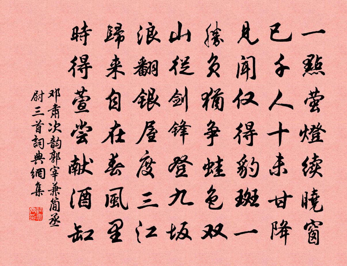 詩詞名句歷史字典書法欣賞書法字典國語詞典說文解字康熙字典古漢語字典標 題 作 者 詩 句 次韻郭宰兼簡丞尉三首作者:鄧肅 朝代:宋代次韻郭宰兼簡丞尉三首原文一點螢燈續曉窗,已千人十未甘降。見聞僅得豹斑一,勝負猶爭蛙色雙。山從劍鋒登九坂,浪翻銀屋度三江。歸來自在春風裡,時得萱嘗獻酒缸。詩詞問答問:次韻郭宰兼簡丞尉三首的作者是誰?答:鄧肅問:次韻郭宰兼簡丞尉三首寫於哪個朝代?答:宋代鄧肅次韻郭宰兼簡丞尉三首書法欣賞次韻郭宰兼簡丞尉三首書法作品詩詞推薦和真長木犀孫應時〔宋代〕長憐花月不想謀,月滿花開得更休。待倚高樓吹鐵笛,為君極意作吟秋。詩劉楨〔魏晉〕初春含寒氣。陽氣匿其暉。灰風從天起。砂石縱橫飛。西川座上聽金五雲唱歌陳陶〔唐代〕蜀王殿上華筵開,五雲歌從天上來。滿堂羅綺悄無語,喉音止駐雲裴回。管弦金石還依轉,不隨歌出靈和殿。白雲以新涼入郊墟為韻簡葉孟我丈陳耆卿〔宋代〕平生一飽足,大宴非珍餚。秋月拓綺羅,秋風奏笙匏。問此有何樂,無樂樂乃高。琴書足匡坐,乾旌謝在郊。緣識宋太宗〔宋代〕白髮長,眉似雪,宗禪和尚何分別。百尺高山足浮雲,萬丈海中有明月。十地本因菩薩證,大乘俱是如來說。有空朝天集偶送西歸朝天二集與尤延之,蒙惠七言楊萬里〔宋代〕梁溪歸自鏡湖天,筆棬湖光入大篇。傾出錦囊和雨濕,炯如柘彈走盤圓。許分句法何曾付,自笑蕪辭敢浪傳。兩集丈人觀師渾甫〔宋代〕甯君始學道,敢據五嶽尊。及為帝東在,便與天長存。句釋尚能〔宋代〕關河虎符重,殿閣獸樽閒。詠懷古蹟五首·其五杜甫〔唐代〕諸葛大名垂宇宙,宗臣遺像肅清高。三分割據紆籌策,萬古雲霄一羽毛。伯仲之間見伊呂,指揮若定失蕭曹。運移寄贈孫教授兄弟趙蕃〔宋代〕籍甚所聞三桂堂,向來相與但南昌。橫經重識泮宮老,捧檄仍思幕府良。日暮酒尊勤灑掃,竹邊談幾愛蒼涼。梅江存沒口號蘇泂〔宋代〕百川袞袞東赴海,學者皆知孔氏宗。六籍湮微吾道喪,武陵山下泣寒蛩。陰陽書語佚名〔唐代〕喬木先枯,眾子必孤。悼靈隱性侍者釋雲岫〔宋代〕三喚聲中負不平,與師百萬欲干城。誰知菡萏峰前路,削木書名有伏兵。次兒瀹以詩四首道各意因兩用其韻陳著〔宋代〕逃不從幼安,放非效玄真。原事堯舜主,或與夔龍親。紹興以後祀五方帝六十首佚名〔宋代〕西顥肅清,群生茂遂。有嚴報典,孔明祀事。珪幣告虔,神靈燕喜。麥我豐年,以錫民祉。和子由論書蘇軾〔宋代〕吾雖不善書,曉書莫如我。苟能通其意,常謂不學可。貌妍容有顰,璧美何妨橢。端莊雜流麗,剛健含婀娜。好之客居餘明遠來訪董嗣杲〔宋代〕風浪而今自忍聞,尚甘客隱大江濆。酒家債負將償足,詩境情懷任醉分。愛睡有魔銷碗茗,遣閒無事對爐熏。梧桐除夜求屠蘇鄭清之〔宋代〕椒盤為計定春前,客裹那知歲籥遷。行路間關穿履雪,薄官羞澀看囊錢。愧無黃帝屠蘇酒,試謁淵明種秫田。令尹琛卿為梅置酒用前韻趙蕃〔宋代〕背蔭初疑星未融,細看真有映玲瓏。興深且約諸君往,明日當愁著土中。偈頌七十二首釋祖欽〔宋代〕量外機,格外句。凡聖 * ,佛祖罔措。有來由,無本據,聲前切忌錯舉。名句推薦人悄悄,簾外月朧明。岳飛《小重山·昨夜寒蛩不住鳴》 垂柳依依惹暮煙,素魄娟娟當繡軒。王元鼎《憑欄人·閨怨》 燕子不歸春事晚,一汀煙雨杏花寒。戴叔倫《蘇溪亭》 從今若許閒乘月,拄杖無時夜叩門。陸游《游山西村》 柳葉隨歌皺,梨花與淚傾。黃庭堅《南歌子·槐綠低窗暗》 養不教,父之過。教不嚴,師之惰。王應麟《三字經·全文》 朱門酒肉臭,路有凍死骨。杜甫《自京赴奉先縣詠懷五百字 / 自京赴奉先詠懷五百字》 南浦淒淒別,西風裊裊秋。白居易《南浦別》 野渡舟橫,楊柳綠陰濃。謝逸《江神子·杏花村館酒旗風》 鎖離愁,連綿無際,來時陌上初熏。韓縝《鳳簫吟·鎖離愁》
