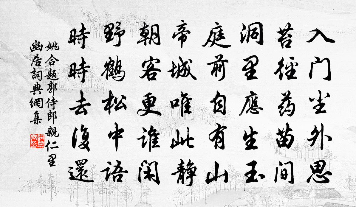 詩詞名句歷史字典書法欣賞書法字典國語詞典說文解字康熙字典古漢語字典標 題 作 者 詩 句 題郭侍郎親仁里幽居作者:姚合 朝代:唐代題郭侍郎親仁里幽居原文入門塵外思,苔徑藥苗間。洞裡應生玉,庭前自有山。帝城唯此靜,朝客更誰閒。野鶴松中語,時時去復還。詩詞問答問:題郭侍郎親仁里幽居的作者是誰?答:姚合問:題郭侍郎親仁里幽居寫於哪個朝代?答:唐代問:題郭侍郎親仁里幽居是什麼體裁?答:五排姚合題郭侍郎親仁里幽居書法欣賞題郭侍郎親仁里幽居書法作品注釋全唐詩:卷499-37詩詞推薦鏡湖一曲劉學箕〔宋代〕天與平湖老賀郎,春波依舊染晴光。可憐千載風流意,付與租符曉夕忙。論詩三十首·其六元好問〔金代〕心畫心聲總失真,文章寧復見為人。高情千古閒居賦,爭信安仁拜路塵!和董伯玉不向東山久韻吳芾〔宋代〕我暫出山去,常憂蕙帳空。聞君東山樂,愛君古人風。日暮君不來,碧雲蔽高穹。凌晨戒僮僕,駕言將租東。回軍跛者趙徵明〔唐代〕既老又不全,始得離邊城。一枝假枯木,步步向南行。去時日一百,來時月一程。常恐道路旁,掩棄狐兔塋。所願子寶東歸以嚶其鳴矣求友聲為韻作古詩七章寬孫應時〔宋代〕傾城事行樂,春台日熙熙。掩關獨愁思,誰能赴幽期。故山隔湖活,浮雲翳晴曦。由來武安客,豈復知魏其。酬舍弟牟秋日洛陽官舍寄懷十韻竇常〔唐代〕幼為逃難者,才省用兵初。去國三苗外,全生四紀餘。老頭親帝里,歸處失吾廬。逝水猶嗚咽,祥雲自卷舒。正郎古意蘇軾〔宋代〕兒童鞭笞學官府,翁憐兒痴旁笑侮。翁出坐曹鞭復呵,賢於群兒能幾何。兒曹鞭人以為戲,公怒鞭人血流地。等為下山雨驟虞儔〔宋代〕寶熏降自九重天,再款龍祠禮亦專。謝雨歸來還得雨,今年必定作豐年。彌天膏潤人皆喜,連日賓士我獨賢。回首驀山溪晁端禮〔宋代〕春來心事,分付千鍾酒。午醉夢還醒,兩眉愁、才消又有。天涯遠夢,歸路日中迷,楚雲深,孤館靜,瀟灑梨花手秋空齊己〔唐代〕已覺秋空極,更堪寥泬青。只應容好月,爭合有妖星。耿耿高河截,翛翛一雁經。曾於洞庭宿,上下徹心靈。春宵酌雨白玉蟾〔宋代〕更無半點海棠飛,一聽黃鶯雨里啼。啼得碧壇紅藥破,淡煙芳草滿長堤。喚渡柴隨亨〔宋代〕溽風吹暑透人肌,我仆雲痡我馬疲。隔岸渡船呼不應,柳陰深處立多時。優孟歌先秦無名〔先秦〕山居耕田苦。難以得食。起而為吏。身貪鄙者余財。不顧恥辱。身死家室富。又恐受賕枉法為奸觸大罪。身死而家次韻鄧慎思見寄孔武仲〔宋代〕暫寄瀟湘百尺船,誰論灶冷突無煙。城陰潦積朝慵出,枕底波鳴夜廢眠。潭府更看花似錦,洞庭將泛水如天。相期江行即事柴隨亨〔宋代〕讀罷騷經手自抄,紉蘭歸計勝誅茅。新蠶食葉將成繭,舊燕銜泥旋補巢。菜老花隨黃麥落,草長色興綠楊交。一春留別崔澣秀才昆仲劉滄〔唐代〕汶陽離思水無窮,去住情深夢寐中。歲晚蟲鳴寒露草,日西蟬噪古槐風。川分遠岳秋光靜,雲盡遙天霽色空。對酒水閣偶成二首蔡戡〔宋代〕小閣枕橫塘,荷花渡晚香。月華秋更白,水氣夜偏涼。地僻人稀到,心閒夢亦長。北窗聊寄傲,身世兩相忘。茨菰花董嗣杲〔宋代〕剪刀葉上兩枝芳,柔弱難勝帶露妝。翠管嫩粘瓊糝重,野泉情心玉蕤涼,舂成臼粉資秋實,種入盆池想水鄉。小小已亥雜詩 280龔自珍〔清代〕昭代恩光日月高,丞彝十器比球刀。吉金打本千行在,敬拓思文冠所遭。書事李流謙〔宋代〕能閒無健羨,可飽即珍烹。成我耕桑計,欣兒譚誦聲。橫戈真不武,斂袂亦難平。苦欲勞工宰,此生無我生。名句推薦愛臣太親,必危其身;人臣太貴,必易主位。韓非及後人《韓非子·愛臣》 勞心者治人,勞力者治於人。孟子《孟子·滕文公章句上·第四節》 玉露凋傷楓樹林,巫山巫峽氣蕭森杜甫《秋興八首·其一》 野者上,園者次。陸羽《茶經·一之源》 莫道桑榆晚,為霞尚滿天。劉禹錫《酬樂天詠老見示》 以色事他人,能得幾時好。李白《妾薄命》 雲移雉尾開宮扇,日繞龍鱗識聖顏。杜甫《秋興八首》 歲暮遠為客,邊隅還用兵。杜甫《歲暮》 一夜東風,枕邊吹散愁多少。曾允元《點絳唇·一夜東風》 與朋友交遊,須將他們好處留心學來,方能受益王永彬《圍爐夜話·第二則》