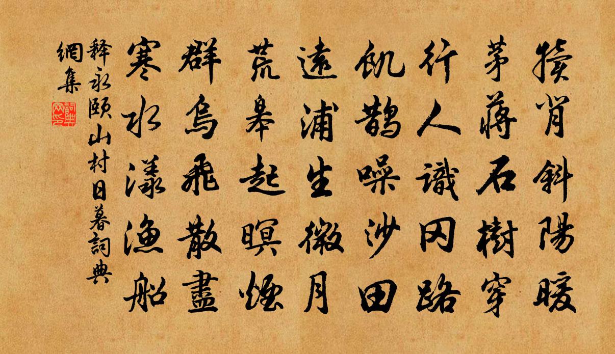 詩詞名句歷史字典書法欣賞書法字典國語詞典說文解字康熙字典古漢語字典標 題 作 者 詩 句 山村日暮作者:釋永頤 朝代:宋代山村日暮原文犢背斜陽暖,茅蔣石樹穿。行人識岡路,飢鵲噪沙田。遠浦生微月,荒皋起暝煙。群烏飛散盡,寒水漾漁船。詩詞問答問:山村日暮的作者是誰?答:釋永頤問:山村日暮寫於哪個朝代?答:宋代釋永頤山村日暮書法欣賞山村日暮書法作品詩詞推薦荒城趙葵〔宋代〕為醒城下雨初晴,紫菊金蓮漫地生,最愛多情白翎雀,一雙飛近馬邊鳴。壽定叟弟張栻〔宋代〕今年 * 開花早,手擷芳新壽一杯。不用南陽三十斜,家山根蒂好栽培。句宋太宗〔宋代〕好事盡輸純與直,謾勞頰舌涌如泉。次韻谷口鄭東子見寄戴復古〔宋代〕吾鄉自昔詩人少,委羽先生後有翁。坐客無氈君莫笑,雲台有集繼家風。宮詞王仲修〔宋代〕西池曼衍魚龍戲,燕罷迴鑾近夕陽。路遠不乘雙鳳輦,玉鞍珠轡御龍驤。次韻和真長幕中偶書黃庶〔宋代〕人情歲時登,鄉縣自無訟。公庭破莓苔,日苦黥徒送。幕府隱詩書,黃堂臥梁棟。幾字署紙尾,朝夕寧倥傯。塵土憶山南陸游〔宋代〕醉墨淋漓酒百杯,轅門山色碧崔嵬。打球駿馬千金買,切玉名刀萬里來。結客漁陽時遣簡,踏營渭北夜銜枚。十年再和四首郭印〔宋代〕萬象森羅不可收,一亭覽盡勝高樓。塗山南覲尊喬嶽,渝水東朝合眾流。煙起人家天欲暮,雲歸海嶠月當秋。此時途中早發劉禹錫〔唐代〕中庭望啟明,促促事晨征。寒樹鳥初動,霜橋人未行。水流白煙起,日上彩霞生。隱士應高枕,無人問姓名。宿壽安甘棠館·行人方倦役司馬扎〔唐代〕行人方倦役,到此似還鄉。流水來關外,青山近洛陽。溪雲歸洞鶴,松月半軒霜。坐恐晨鐘動,天涯道路長。頌古三十一首釋安永〔宋代〕道泰時清才子貴,家肥國富小兒嬌。不因紫陌花開早,爭見黃鶯下柳條。留題天樂寓張氏湖亭陳起〔宋代〕沉水香銷一局棋,客來淺酌旋分題。畫欄占得春多少,簾卷東風日未西。同鄧使君賞雙頭牡丹李石〔宋代〕兼金必貴雙,珏玉不獨只。嫣然彼叢生,佳處亦求匹。沙寒水成練,雪洞山立壁。春回小洛陽,淑氣自融液。主人次韻劉貢父題文潞公草書蘇轍〔宋代〕鷹揚不滅少年時,墨作龍蛇紙上飛。應笑學書心力盡,臨池寫遍未裁衣。靖節先生祠下鄧肅〔宋代〕五柳歸來昔陶公,七閩召還今鄧子。不將出處作殊觀,便了陶鄧先生死。用前韻勉陳進之赴省項安世〔宋代〕痴翁切莫強笞兒,子之勤勞我所知。但看匡衡穿壁苦,難雲寗越讀書遲。能來伴我滄浪艇,共看一年橙橘時。莫為題靜軒劉鑒〔宋代〕徑深寂寂鎖苔菌,此地不生車馬塵。夢斷瑤台惟有竹,棋聲花院似無人。蛛因門閉牢穿綱,鵲悟枝乾自採薪。只道滿庭芳佚名〔宋代〕若論風流,無過圓社,拐膁蹬躡搭齊全。門庭富貴,曾到御簾前。灌口二郎為首,趙皇上、下腳流傳。人都道、齊和虛齋勸農十詩鄭清之〔宋代〕小隊旌旗半道歸,松陰緩策攬清暉。女郎未覺褰帷過,笑語相教著嫁衣。金陵懷古王安石〔宋代〕六代豪華空處所,金陵王氣黯然收。煙濃草遠望不盡,物換星移度幾秋。至竟江山誰是主,卻因歌舞破除休。我來名句推薦話不在多說,有理不在高聲!佚名《增廣賢文·下集》 樓角初銷一縷霞,淡黃楊柳暗棲鴉賀鑄《減字浣溪沙·樓角初銷一縷霞》 淮南皓月冷千山,冥冥歸去無人管。姜夔《踏莎行·自沔東來》 嘶馬搖鞭何處去?曉禽霜滿樹。牛希濟《謁金門·秋已暮》 因病得閒殊不惡,安心是藥更無方。蘇軾《病中游祖塔院》 一葉浮萍歸大海,為人何處不相逢!吳承恩《西遊記·第四十回》 神女生涯原是夢,小姑居處本無郎。李商隱《無題·重幃深下莫愁堂》 正不容邪,邪復妒正。曹雪芹《紅樓夢·第二回》 願得一心人,白頭不相離。卓文君《白頭吟》 空山松子落,幽人應未眠。韋應物《秋夜寄邱員外 / 秋夜寄丘二十二員外》