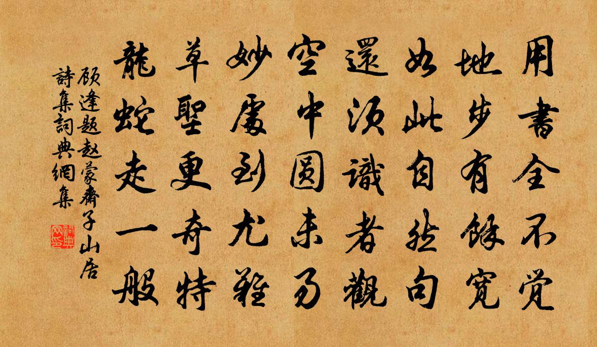 詩詞名句歷史字典書法欣賞書法字典國語詞典說文解字康熙字典古漢語字典標 題 作 者 詩 句 題趙蒙齋子山居詩集作者:顧逢 朝代:宋代題趙蒙齋子山居詩集原文用書全不覺,地步有餘寬。如此自然句,還須識者觀。空中圓未易,妙處到尤難。草聖更奇特,龍蛇走一般。詩詞問答問:題趙蒙齋子山居詩集的作者是誰?答:顧逢問:題趙蒙齋子山居詩集寫於哪個朝代?答:宋代顧逢題趙蒙齋子山居詩集書法欣賞題趙蒙齋子山居詩集書法作品詩詞推薦水調歌頭(中秋和施司諫)羅願〔宋代〕秋宇淨如水,月鏡不安台。郁孤高處張樂,語笑脫氛埃。檐外白毫千丈,坐上銀河萬斛,心境兩佳哉。俯仰共清絕慈聖光獻皇太后輓詞二首曾鞏〔宋代〕祖烈鷹揚終食冀,家聲泉涌舊興譙。人倫風化歸三世,王室功勞屬兩朝。長信深嚴余羽衛,閟宮崇大列宗祧。衣冠雜歌謠辭。雞鳴曲李廓〔唐代〕星稀月沒上五更,膠膠角角雞初鳴。征人牽馬出門立,辭妾欲向安西行。再鳴引頸檐頭下,月中角聲催上馬。才分老竹艾性夫〔宋代〕蒼黃瘦硬立頹垣,疑是栽時第一根。早歲孤君惟二子,暮年千畝盡諸孫。雨鞭老迸蒼龍骨,霜節寒封古蘚痕。消得望江南(閨情)張先〔宋代〕香閨內、空自想佳期。獨步花陰情緒亂,謾將珠淚兩行垂。勝會在何時。厭厭病,此夕最難持。一點芳心無托處,秋日山居好十首舒岳祥〔宋代〕秋日山居好,疏明入畫峰。獵憐依寺鹿,樵護倚祠松。雁起西風笛,人居夕照舂。東山久不到,勝具一枝筇。二十夜起對月懷斯無成父趙蕃〔宋代〕蟲鳴切切故關聽,重感跳丸去不停。不足有餘空歲計,書來吾友愧丁寧。送陳諫議澈赴邊幕二首劉克莊〔宋代〕出久孟鄰爭吊賀,去遲防墓畢封塋。枕戈肯把棋消夜,落筆皆夸檄愈風。烏幕樂哉賓與主,墨行矣孝人移忠。江東贈葉生李處權〔宋代〕帶如當風衣出水,曹吳丹青古莫比。一時更有劉與楊,妙手斫泥端及此。葉生心匠何瑰奇,異代同聲人所推。頗甘縣圃酴醾陳造〔宋代〕北園紅紫已蜚塵,始放幽亭爛熳春。疊翠影低珠幰重,洗妝人倦玉容真。薔薇清露疑分派,茉莉評香且外臣。領略巫山一何高七絕李流謙〔宋代〕巫山一何高,積翠擁陽台。俗賂楚臥誅綺語,莫問襄王來不來。沁園春 泉南初度,伯時將北歸,諸友宴次,張翥〔元代〕天上玉堂,海外瀛洲,山中蛻岩。甚六十四歲,出持使節,八千餘里,來駐征驂。香火緣深,功名意薄,夢覺仙家車遙遙篇傅玄〔魏晉〕車遙遙兮馬洋洋,追思君兮不可忘。君安游兮西入秦,願為影兮隨君身。君在陰兮影不見,君依光兮妾所願。次韻孔平仲著作見寄四首蘇轍〔宋代〕昔在京城南,成均封茅屋。清晨屣履過,不顧車擊轂。時有江南生,能使多士服。同儕畏鋒銳,兄弟更馳逐。文成戲題(肇初計偕至襄陽,奇章公方有真珠之惑)盧肇〔唐代〕神女初離碧玉階,彤雲猶擁牡丹鞋。知道相公憐玉腕,強將縴手整金釵。觀梅方岳〔宋代〕老樹槎枒只一花,氣條亦不放橫斜。無風無雨無煙月,獨立人間莫怨嗟。題鶴林宮江南劍客〔宋代〕暑往寒來造化間,誰將大藥駐朱顏。騎鯨客去天連水,跨鶴人歸月滿山。爐火焰燒 * 境,劍峰割斷利名關。煙花答樂天見憶劉禹錫〔唐代〕與老無期約,到來如等閒。偏傷朋友盡,移興子孫間。筆底心無毒,杯前膽不豩。唯餘憶君夢,飛過武牢關。盆中樹王冕〔元代〕橐駝已矣樹多病,後世誰能諭官政?盤根銀節入盆盂,豈伊妡生之本性?童童結蓋擁綠雲,皮膚轉卷生蟲紋。幽人曾耆英見過題贈六言四首趙蕃〔宋代〕庭空不張爵蘿,林靜可窺鳥窠。髯曾暇能過我,誦詩口若懸河。名句推薦自奉必須儉約,宴客切勿流連。朱柏廬《朱子家訓·全文》 年年社日停針線。怎忍見、雙飛燕。黃公紹《青玉案·年年社日停針線》 綠竹含新粉,紅蓮落故衣。王維《山居即事》 雲橫秦嶺家何在?雪擁藍關馬不前。韓愈《左遷至藍關示侄孫湘》 湖上春來似畫圖,亂峰圍繞水平鋪。白居易《春題湖上》 誰念文園病客?夜色沉沉,獨抱一天岑寂。張埜《奪錦標·七夕》 又送王孫去,萋萋滿別情。白居易《草 / 賦得古原草送別》 賞當其勞,無功者自退;罰當其罪,為惡者戒懼。吳兢《貞觀政要·卷三·論擇官》 鳥銜野田草,誤入枯桑里。李白《樹中草》 青苔滿地初晴後,綠樹無人晝夢余。劉攽《新晴·青苔滿地初晴後》