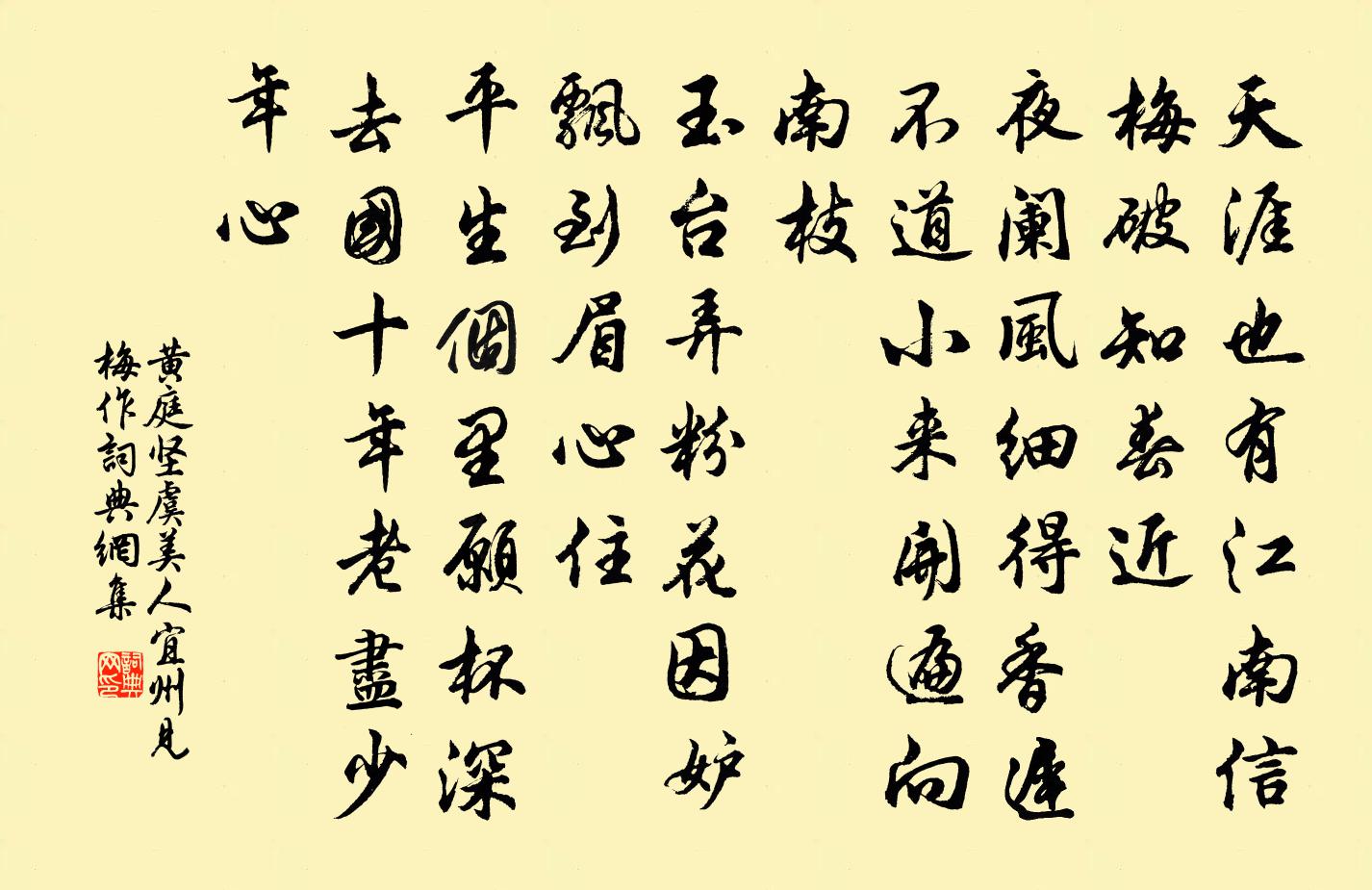 此詞為山谷因寫《承天院塔記》被朝廷指為“幸災謗國”而貶謫地處西南的邊地宜州後所作。全詞以詠梅為中民,把天涯與江南、垂老與少年、去國十年與平生作了一個對比性總結,既表現出天涯見梅的喜悅,朝花夕拾的欣慰,又抒寫不勝今昔之慨,表現出作者心中鬱結的不平與憤懣。
