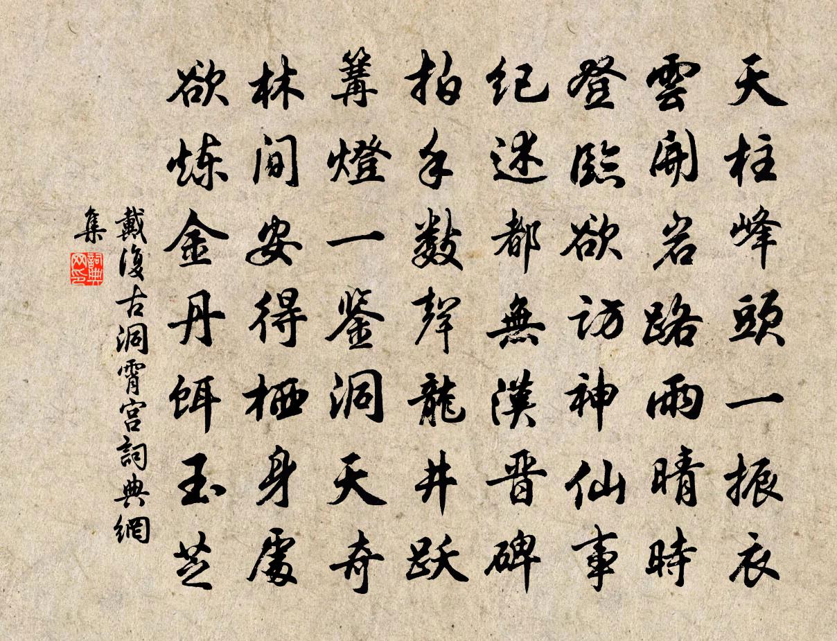 詩詞名句歷史字典書法欣賞書法字典國語詞典說文解字康熙字典古漢語字典標 題 作 者 詩 句 洞霄宮作者:戴復古 朝代:宋代洞霄宮原文天柱峰頭一振衣,雲開岩路雨晴時。登臨欲訪神仙事,紀述都無漢晉碑。拍手數聲龍井躍,篝燈一鑒洞天奇。林間安得棲身處,欲鍊金丹餌玉芝。詩詞問答問:洞霄宮的作者是誰?答:戴復古問:洞霄宮寫於哪個朝代?答:宋代問:戴復古的名句有哪些?答:戴復古名句大全戴復古洞霄宮書法欣賞洞霄宮書法作品詩詞推薦次韻陸務觀慈姥岩酌別范成大〔宋代〕明朝真是送人行,從此關山隔故情。道義不磨雙鯉在,蜀江流水貫吳城。行經范僕射故宅詩何遜〔南北朝〕旅葵應蔓井。荒藤已上扉。寂寂空郊暮。無復車馬歸。瀲灩故池水。蒼茫落日暉。遺愛終何極。行路獨沾衣。許由廟羅隱〔唐代〕高掛風瓢濯漢濱,土階三尺愧清塵。可憐比屋堪封日,若到人間是眾人。上鄭漕二首郭印〔宋代〕窮經好客舊時聲,千載遺風見典型。忠孝家傳心自赤,功名路穩鬢方青。傅岩欲作商霖雨,蜀道猶觀漢使星。小益芰荷香(席上用韻送程德遠罷金溪)趙彥端〔宋代〕燕初歸。正春陰暗淡,客意淒迷。玉觴無味,晚花雨退凝脂。多情細柳,對沈腰、渾不勝垂。別袖忍見離披。江南課伐木林尚仁〔宋代〕手揮樵斧氣如虹,幾樹寒煙一餉空。午夜無依烏鵲冷,數聲應恨月明中。寄季申陳與義〔宋代〕雨歇城南泥未乾,遙知獨立整衣冠。舊時鄴下劉公幹,今日遼東管幼安。綠陰展盡身猶遠,黃鳥飛來節已闌。安得詠懷蘇泂〔宋代〕初夏腓草木,園綠勝春深。微雨灑高棟,好風吹我襟。徘徊花下徑,獨往玩層陰。東西燕雀飛,寂寞鸞鳳音。人生正月二十日往岐亭郡人潘古郭三人送余於女王城東禪莊院蘇軾〔宋代〕十日春寒不出門,不知江柳已搖村。稍聞決決流冰谷,盡放青青沒燒痕。數畝荒園留我住,半瓶濁酒待君溫。去年句晏殊〔宋代〕紫結茱萸實,濃熏菡萏香。五朵峰釋文珦〔宋代〕莫知小朵飛來日,慧理曾經指異蹤。香潤盡多西竺石,孤高亦有晉朝松。斷無一乾棲凡鳥,別有深泓臥老龍。絕項王導李復〔宋代〕鄒人羞比管夷吾,可復中原盡羯胡。郊壘連雲困衣食,縱高練布得充無。浮丘道人招魂歌汪元量〔宋代〕有妻有妻不得顧,飢走荒山汗如雨。一朝中道逢狼虎,不肯偷生作人婦。左掖虞姬右陵母,一劍捐身剛自許。天上張大著以韓持國綠樽紅妓事再和見戲複次韻魏了翁〔宋代〕壯心十五亦狂顛,十五年來洗濯鮮。負郭元無三畝宅,浮家安有五湖船。焚香讀易謝來況,飲綠圍紅回長年。不是真珠簾(近雅軒即事)張炎〔宋代〕雲深別有深庭宇。小簾櫳、占取芳菲多處。花暗水房春,潤幾番酥雨。見說蘇堤晴未穩,便懶趁、踏青人去。休去因見市人以瓦缶蒔花屋上有感姜特立〔宋代〕城中寸土如寸金,屋上蒔花亦良苦。因思離宮與別館,南至九崇北鄠杜。東西延袤八百里,橋樑褭空七百柱。傷哉讀書曾幾〔宋代〕散帙有佳趣,俗人那得知。醉鄉非為酒,坐隱不關棋。幾淨幽懷愜,窗明老眼宜。一生無用處,又把教群兒。寄胡雪江吟舍王鎡〔宋代〕蕭蕭葉落響風枝,隔壁無情笛又吹。一縷碧煙燈燼落,主人眠熟客醒時。與時寡合釋重顯〔宋代〕居士門高謁未期,閒隈岩石且相宜。太湖三萬六千頃,月在清波說向誰。北禪院避暑聯句皮日休〔唐代〕歊蒸何處避,來入戴顒宅。逍遙脫單絞,放曠拋輕策。 ——皮日休爬搔林下風,偃仰澗中石。 ——皮日休殘蟬名句推薦盡無言、閒品秦箏,淚滿參差雁呂渭老《薄倖·青樓春晚》 八月寒葦花,秋江浪頭白。李頎《送劉昱》 今年海角天涯。蕭蕭兩鬢生華。李清照《清平樂·年年雪裡》 明月照積雪,朔風勁且哀。謝靈運《歲暮》 宜有詞仙,擁素雲黃鶴,與君遊戲。姜夔《翠樓吟·淳熙丙午冬》 離恨遠縈楊柳,夢魂長繞梨花。劉迎《烏夜啼·離恨遠縈楊柳》 朔風萬里入衣多,嘹嚦寒空一雁過。石茂華《九月九日登長城關》 青春須早為,豈能長少年。孟郊《勸學》 青溪水,流得到紅橋。張景祁《小重山·幾點疏雅謄柳條》 洞門高閣靄餘輝,桃李陰陰柳絮飛。王維《酬郭給事 / 贈郭給事》