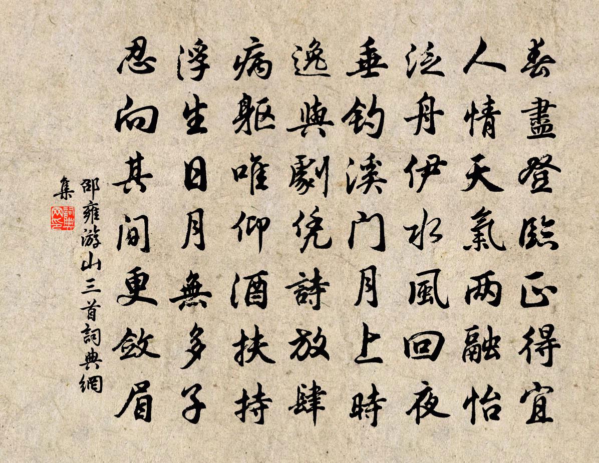 詩詞名句歷史字典書法欣賞書法字典國語詞典說文解字康熙字典古漢語字典標 題 作 者 詩 句 游山三首作者:邵雍 朝代:宋代游山三首原文春盡登臨正得宜,人情天氣兩融怡。泛舟伊水風回夜,垂釣溪門月上時。逸與劇憑詩放肆,病軀唯仰酒扶持。浮生日月無多子,忍向其間更斂眉。詩詞問答問:游山三首的作者是誰?答:邵雍問:游山三首寫於哪個朝代?答:宋代邵雍游山三首書法欣賞游山三首書法作品詩詞推薦太皇太后合春帖子趙湘〔唐代〕九奏清新稱玉斝,八珍和旨奉蘭羞。須知天子娛親意,不為乘春事燕遊。訴衷情(五之三)王安石〔宋代〕茫然不肯住林間。有處即追攀。將他死語圖度,怎得離真丹。漿水價,匹如閒。也須還。何如直截,踢倒軍持,贏郡中西園(一作許渾詩)姚合〔唐代〕西園春欲盡,芳草徑難分。靜語唯幽鳥,閒眠獨使君。密林生雨氣,古石帶潮文。雖去清秋遠,朝朝見白雲。游龍門分題十五首白傅墳歐陽修〔宋代〕芳荃奠蘭酌,共吊松林里。溪口望山椒,但見浮雲起。次韻劉貢父和韓康公憶其弟持國二首蘇轍〔宋代〕霜風瑟瑟卷梧蕉,燕處超然夜寂寥。羽客信來丹鼎具,石淙夢斷水聲遙。赤松作伴誰當見,黃鵠高飛未易招。劍履與張仲巽游善護院韓維〔宋代〕高城面修塗,呀豁若箕口。鉛石釋子廬,蒼柏蔭庭牖。翹翹幕中彥,疏懷脫喧垢。結轡游禪扃,彈弦欒嘉友。華榱游雁門山胡份〔宋代〕羲和前珥節,雲鎖已先開。仙鶴迎人至,山花拂酒來。問奇緣石室,伐陰出層台。人影半空落,歸鷂足下回。聖女祠李商隱〔唐代〕松篁台殿蕙香幃,龍護瑤窗鳳掩扉。無質易迷三里霧,不寒長著五銖衣。人間定有崔羅什,天上應無劉武威。寄問梁郊祀樂章慶和趙光逢〔唐代〕就陽位,升圜丘。佩雙玉,御大裘。膺天命,擁神休。萬靈感,百祿遒。秉黃鉞,建朱旗。震八表,清二儀。帝業挽寧谷居士何公三首何夢桂〔宋代〕鼠繞枯藤齧未休,得如此老死何求。翁逾八十媼黃髮,孫見曾玄兒白頭。身世幅巾歸趼室,歲時孟飯灑狐丘。百年題周皓大夫新亭子二十二韻白居易〔唐代〕東道常為主,南亭別待賓。規模何日創?景致一時新。廣砌羅紅藥,疏窗蔭綠筠。鎖開賓閣曉,梯上妓樓春。置醴秋思陸游〔宋代〕秋毫不受俗塵侵,隨處悠然一散襟。天際掛虹初斷雨,雲頭翳日又成陰。引泉北澗長澆竹,拂榻西窗自斫琴。藥石閒昧陸游〔宋代〕身似枯禪謝世麈,豈容收歛強冠巾。庾郎三韭不妨飽,晏子一裘何恨貧?棲冷每憐雞唱早,雲開初見月痕新。閒中送宣皎上人游太白賈島〔唐代〕剃髮鬢無雪,去年三十三。山過春草寺,磬度落花潭。得句才鄰約,論宗意在南。峰靈疑懶下,蒼翠太虛參。東城馬上賀鑄〔宋代〕彩虹橋下水關東,接畛園林狹逕通。繁杏半開隨半落,短牆無計礙春風。穿山月岩胡仲威〔宋代〕石磴崎嵌□□□,坐來心跡自雙清。不知渾沌何年鑑,便有嬋娟一鏡膽。周穆馬蹄何寂寞,謝公屐齒□□□。□然九座山中即事二首蘇欽〔宋代〕紅藥青綾心已灰,且從開士宿招提。半窗白月爐煙斷,楓葉蕭蕭烏夜啼。和池州陳教授韻二首吳芾〔宋代〕人物今誰似此郎,合居嚴近贊垂裳。未將事業先諸老,且把文章變一方。今日杏壇風似魯,向來鐵硯志如桑。會看滿江紅(鳥衣園)吳淵〔宋代〕投老未歸,太倉粟、尚教蠶食。家山夢、秋江漁唱,晚風牛笛。別墅流風慚莫繼,新亭老淚空成滴。笑當年、君作【雙調】行香子_嘆世名利相曾瑞〔元代〕嘆世名利相簽,禍福相兼,使得人白髮蒼髯。殘花雨過,落絮泥沾,似夢中身、石中火、水中鹽。【麼】跳下竿尖名句推薦天之生物必因其材而篤焉。故栽者培之,傾者覆之。子思《中庸·第十七章》 白頭宮女在,閒坐說玄宗。元稹《行宮》 浮雲柳絮無根蒂,天地闊遠隨飛揚。韓愈《聽穎師彈琴》 咬定青山不放鬆,立根原在破岩中。鄭燮《竹石》 一重山,兩重山。山遠天高煙水寒,相思楓葉丹。李煜《長相思·一重山》 亭皋木葉下。隴首秋雲飛。柳惲《搗衣詩》 一尺深紅勝麴塵,天生舊物不如新。溫庭筠《南歌子詞二首 / 新添聲楊柳枝詞》 舍南舍北皆春水,但見群鷗日日來。杜甫《客至》 風雨滿城,何幸兩重陽之近;文天祥《回董提舉中秋請宴啟》 巴子城頭青草暮,巴山重疊相逢處張先《漁家傲·和程公辟贈》