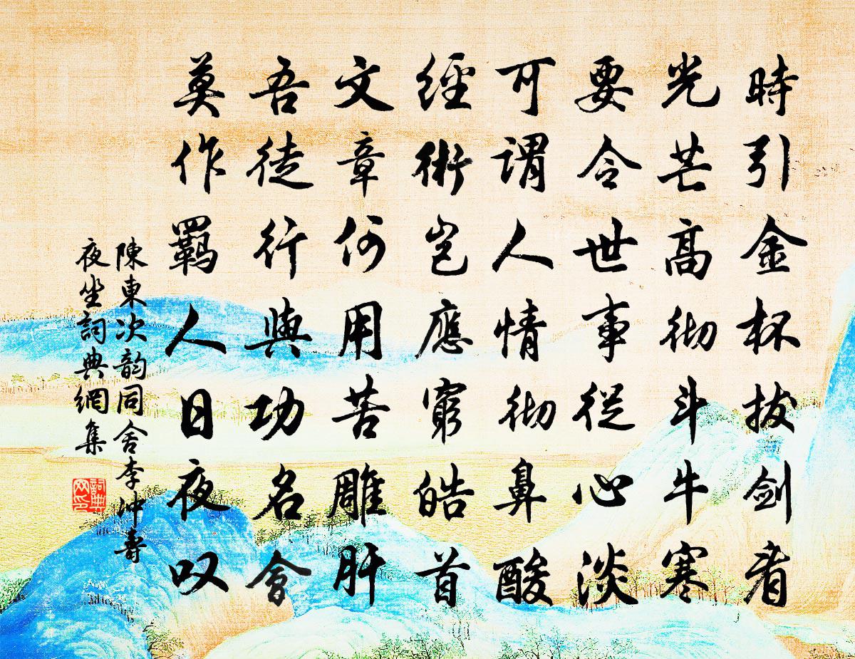 詩詞名句歷史字典書法欣賞書法字典國語詞典說文解字康熙字典古漢語字典標 題 作 者 詩 句 次韻同舍李沖壽夜坐作者:陳東 朝代:宋代次韻同舍李沖壽夜坐原文時引金杯拔劍看,光芒高徹鬥牛寒。要令世事從心淡,可謂人情徹鼻酸。經術豈應窮皓首,文章何用苦雕肝。吾徒行與功名會,莫作羈人日夜嘆。詩詞問答問:次韻同舍李沖壽夜坐的作者是誰?答:陳東問:次韻同舍李沖壽夜坐寫於哪個朝代?答:宋代陳東次韻同舍李沖壽夜坐書法欣賞次韻同舍李沖壽夜坐書法作品詩詞推薦送道純歸南康范祖禹〔宋代〕平生聞廬岳,夢想入松門。京華走塵土,歲月空崩奔。緲思放岩壑,枕石清心魂。羨君歸舊隱,山水當高軒。雲林江梅引 神邪王吉昌〔元代〕四肢氣散失根芽。作神邪。發空華。異物千般,目下亂如麻。一切聖賢隨意現,總變化,都因一念差。不知心病尚歌戚逍遙〔唐代〕笑看滄海欲成塵,王母花前別眾真。千歲卻歸天上去,一心珍重世間人。王郎中妓席五詠箏顧況〔唐代〕秦聲楚調怨無窮,隴水胡笳咽復通。莫遣黃鶯花里囀,參差撩亂妒春風。·106 ·靜觀堂十偈汪晫〔宋代〕春去人間日正長,天工催促綠陰忙。古槐高柳爭新意,自是無人知底涼。次韻謝姜自明秀才示卷詩項安世〔宋代〕高人貴寡和,不顧世俗非。君歌陽春曲,調與眾耳違。朱弦古時瑟,素積前朝衣。享我太羹饌,枯腸飫晨飢。贈我三次喜雨詩韻少伸嘉頌范成大〔宋代〕向非賢牧政通靈,幾負松陵耒耜經。天籟侵晨占少女,雨師連夜檄玄冥。作霖豈必求商野,召見誰能右漢庭。聞有次韻蘇巨卿於石〔宋代〕誰叩柴門寄我詩,迎門稚子候予歸。青山喚醒十年夢,明月空懷千里思。今晉古秦天地隔,范雎張祿姓名非。人生池上次潘茂洪韻張鎡〔宋代〕水禽花底靜藏頭,識我青蘋欲暮愁。三十六陂焉用許,一航沖岸柳絲桑。次韻李同年誠之見貽之什喻良能〔宋代〕筆端灑落謫仙人,況復曾同桂苑春。一笑相逢端莫逆,門前洲渚正橫陳。春間小詩書趙壁追錄之朱槔〔宋代〕夜月閩杯淺,春風楚制輕。故鄉空費夢,來此聽溪聲。夕月十首佚名〔宋代〕[姑洗為羽]穆穆流輝,太陰之精。盈成靡忒,寒暑以均。克迷克祀,揆日涓辰。牲碩酒旨,來東來寧。答人吟邵雍〔宋代〕筋骸得似常年否,氣血能如舊日無。卻喜一般增長處,樽前談笑有工夫。望江南/憶江南柳華淑〔宋代〕何處笛,覺妾夢難諧。春色惱人眠不得,捲簾移步下香階。呵凍卜金釵。人去也,畢竟信音乖。翠鎖雙蛾空宛轉,宿鄰水縣袁說友〔宋代〕酒余孤館夢初回,漸覺茅檐淅淅來。夜半山前風薦雨,曉來崖底澗鳴雷。剩添崗翠三分色,呈出秧針一寸栽。恰得登秦嶺作,時陷賊歸國儲光羲〔唐代〕朝出猛獸林,躨跜登高峰。僮僕履雲霧,隨我行太空。羲和舒靈暉,倏忽西極通。回首望涇渭,隱隱如長虹。九逵晚步湖橋蘇泂〔宋代〕吳儂生長鏡湖邊,湖晚登橋意欲仙。初見蒼山下紅日,忽看白月上青煙。收藏畫本歸吟筆,應答漁歌送客船。回首禪人並化主寫真求贊釋正覺〔宋代〕默成用密,智空理得。歷代祖心選同科,三世佛口閒掛壁。岩棲分韻得深字釋斯植〔宋代〕寂寞空齋里,閒情起暮吟。路長沙鳥盡,人在翠微深。遠樹煙中沒,寒花竹外尋。自嫌名與利,誰識此生心。郴江百詠並序久留岡阮閱〔宋代〕潁人間欲問郴人,衛颯如何似寇恂。只恐當時遮道者,不應皆是惜留人。名句推薦穗帷飄井幹,樽酒若平生。謝朓《同謝諮議詠銅雀台》 蘭陵美酒鬱金香,玉碗盛來琥珀光。李白《客中行 / 客中作》 故人何處。帶我離愁江外去。呂本中《減字木蘭花·去年今夜》 憶與君別年,種桃齊蛾眉。李白《獨不見》 知者行之始。行者知之成。王陽明《傳習錄·卷上·門人陸澄錄》 鳥飛反鄉,兔走歸窟,狐死首丘,寒將翔水,各哀其所生。劉安及其門客《淮南子·說林訓》 出犯繁花露,歸穿弱柳風溫庭筠《清明日》 年年送客橫塘路,細雨垂楊系畫船。范成大《橫塘·南浦春來綠一川》 善學者盡其理,善行者究其難。荀子《荀子·大略》 故山知好在,孤客自悲涼。蘇軾《臨江仙·送王緘》