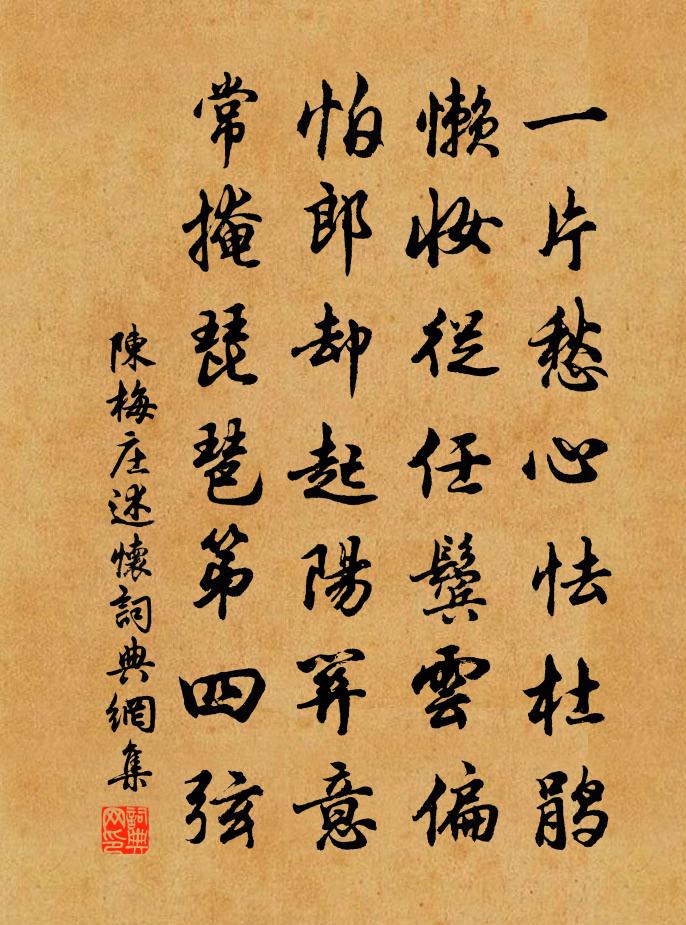 詩詞名句歷史字典書法欣賞書法字典國語詞典說文解字康熙字典古漢語字典標 題 作 者 詩 句 述懷作者:陳梅莊 朝代:宋代述懷原文一片愁心怯杜鵑,懶妝從任鬢雲偏。怕郎卻起陽關意,常掩琵琶第四弦。詩詞問答問:述懷的作者是誰?答:陳梅莊問:述懷寫於哪個朝代?答:宋代陳梅莊述懷書法欣賞述懷書法作品詩詞推薦鳳棲梧 以上十首見中州樂府趙可〔元代〕霜樹重重青嶂小。高棟飛雲,正在霜林杪。九日黃花才過了。一尊聊慰秋容老。翠色有無眉淡掃。身在西山,卻愛初歸雜詠陸游〔宋代〕齒豁頭童盡耐嘲,即今爛飯用匙抄。朱門漫設千杯酒,青壁寧無一把茅?偶爾作官羞問馬,頹然對客但稱貓。此身白鹿升仙台舒天香〔清代〕野人似我真如鹿,六月披裘受清福。興來枕石學雲眠,瑤草琪花相伴宿。飛蝶時時上我身,但見香雲不見人。早知句宋鹹〔宋代〕豈是嫦娥月里香。宮怨韋莊〔唐代〕一辭同輦閉昭陽,耿耿寒宵禁漏長。釵上翠禽應不返,鏡中紅艷豈重芳!螢低夜色棲瑤草,水咽秋聲傍粉牆。展轉偈頌九首釋如淨〔宋代〕打破黑漆桶,十方空索索。不受靈山記,安居大圓覺。韓尚書南澗公之從弟德文為東廣常平上幕丙寅曾豐〔宋代〕白露一旬後,秋分三日前。幕中餘暇日,城上肆華筵。卓立參天木,橫陳撲地煙。主人非獨答,客筆不如椽。挽林紹伊二首吳芾〔宋代〕早負經綸志,居然欲起家。持身惟孝友,告後盡忠嘉。位望隆青瑣,文章在白麻。忍聞埋玉樹,四海共驚嗟。水龍吟 代洋尾李氏壽柯竹圃洪希文〔元代〕降庭佳氣蔥蔥,輝聯南極光如畫。門弧紀瑞,華筵開宴,兜離仙奏。梨棗功深,汞鉛訣秘,內丹初就。咽壺中日月春鶻謠梅堯臣〔宋代〕春巢累累,眾鳥哺兒。眾鳥不出巢,群雛嗷嗷腹甚飢。不出巢,其謂何,上有蒼鶻窺其窠。問鶻何仇,鶻不我顧。蔞蒿宜作河豚羹辛棄疾〔宋代〕河豚挾鴆毒, * 一臠足。蔞蒿或濟之,赤心置人腹。方其在野中,衛青混奴僕。及登君子堂,園綺成骨肉。暴乾次延平郡文學宴新進士韻陳宓〔宋代〕文章千丈吐寒芒,更要新登孔氏堂。講學若能膻自至,致君端使鳳來翔。衍山劍水多奇產,赤箭丹砂詎可當。自有始生之日石子壽以詩所以相屬這意再三甚厚飲鄭剛中〔宋代〕五月居山書清永,槐度微風舞疏影。兒童喜我懸弧長,灑掃庭除具盤皿。烹鳧雋鵠未易辨,餚核隨時享桃杏。頗當守居園池雜題此君庵文同〔宋代〕叢筠裹圜檐,淨影碧如水。誰識愛君心,過橋先到此。次韻和王鞏六首蘇軾〔宋代〕少年帶刀劍,但識從軍樂。老大服犁鋤,解佩付熔鑠。雖無獻捷功,會賜力田爵。敲冰春搗紙,刈葦秋織箔。櫟林詩一首醉客〔宋代〕行盡蓬萊弱水源,今朝忍渴過崑崙。興來莫問酒中聖,且把金杯和月吞。菩薩蠻程垓〔宋代〕客窗曾剪燈花弄。誰教來去如春夢。冷落舊梅台。小桃相次開。人間春易老。只有山中好。閒卻槿花籬。莫教溪外賞雪吟邵雍〔宋代〕一片兩片雪紛紛,三杯五杯酒醺醺。此時情狀不可論,直疑天在才絪紜。玩丹砂 寄南京道友馬鈺〔元代〕自愧無緣去大梁。亦無心意學賢良。夷門道友我思量。予在環牆調水火,諸公何日絕炎涼。山侗叮囑悟黃梁。所居首夏,水木尤清,適然有作皮日休〔唐代〕病來無事草堂空,晝水休聞十二筒。桂靜似逢青眼客,松閒如見綠毛翁。潮期暗動庭泉碧,梅信微侵地障紅。盡日名句推薦兩岸猿聲啼不住,輕舟已過萬重山李白《早發白帝城/白帝下江陵》 知之曰明哲,明哲實作則。佚名《尚書·商書·說命上》 記年時、舊宿淒涼,暮煙秋雨野橋寒。吳文英《霜花腴·重陽前一日泛石湖》 玲瓏骰子安紅豆,入骨相思知不知。溫庭筠《南歌子詞二首 / 新添聲楊柳枝詞》 一字無題外,落葉都愁。張炎《八聲甘州·記玉關踏雪事清游》 記得短亭歸馬,暮衙蜂鬧。吳文英《天香·蠟梅》 白日何短短,百年苦易滿。李白《短歌行》 蜀道之難,難於上青天!李白《蜀道難》 集中什九從軍樂,亘古男兒一放翁。梁啓超《讀陸放翁集》 庭前時有東風入,楊柳千條盡向西。劉方平《代春怨》