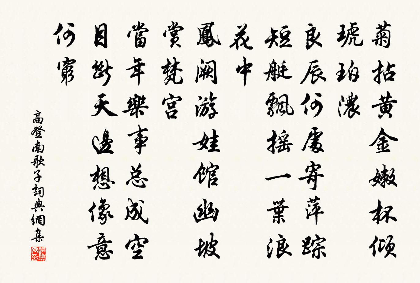 詩詞名句歷史字典書法欣賞書法字典國語詞典說文解字康熙字典古漢語字典標 題 作 者 詩 句 南歌子作者:高登 朝代:宋代南歌子原文菊拈黃金嫩,杯傾琥珀濃。良辰何處寄萍蹤。短艇飄搖一葉、浪花中。鳳闕游娃館,幽坡賞梵宮。當年樂事總成空。目斷天邊想像、意何窮。詩詞問答問:南歌子的作者是誰?答:高登問:南歌子寫於哪個朝代?答:宋代問:南歌子是什麼體裁?答:詞高登南歌子書法欣賞南歌子書法作品詩詞推薦秋日山中寄池州李常侍杜荀鶴〔唐代〕近來參謁陡生疏,因向雲山僻處居。出為羈孤營糲食,歸同弟侄讀生書。風凋古木秋陰薄,月滿寒山夜景虛。但得題釣台姚勉〔宋代〕等閒伸腳動天文,須信乾坤系此身。天上有星猶是客,漢庭何事肯為臣。只當泉石容真隱,安可文書役故人。豈但當直偶題所見宋祁〔宋代〕凜序閒緹簽,輕寒著黼帷。仙盤迎日早,溫樹得霜遲。風觸趨朝珮,霞纏放仗旗。殿廊聊暴背,誰訝子云衰。水淺舟滯解悶十絕鄭獬〔宋代〕壩上春流滑滑來,行人相語笑相催。解舟直入碧天去,天上晚雲行處開。次韻答張迪功坐上見貽張將赴南都任二首陳與義〔宋代〕足錢便可不須侯,免對妻兒賦百憂。一笑相逢亦奇事,平生所得是清流。談天安用如鄒子,掃地還應學趙州。南北照水聯句何遜〔南北朝〕插花行理鬢。遷延去復歸。雖憐水上影。復恐濕羅衣。臨橋看黛色。映渚媚鉛暉。不顧春荷動。彌畏小禽飛。保叔塔楊蟠〔宋代〕寂寥千古事,今日有誰登。落日雲間合,空中露幾層。秋夜作錢起〔唐代〕萬計各無成,寸心日悠漫。浮生竟何窮,巧曆不能算。流落四海間,辛勤百年半。商歌向秋月,哀韻兼浩嘆。寤寐終南僧貫休〔唐代〕聲利掀天竟不聞,草衣木食度朝昏。遙思山雪深一丈,時有仙人來打門。簡王夏卿侍郎李處權〔宋代〕下村正與輞川同,只恐桃源有路通。山色直侵書幌里,花香盡泛酒杯中。使君已致隨車雨,丞相方來拔木風。照席村居書事四首劉克莊〔宋代〕有客相逢說坎離,葫蘆中藥不容窺。扣頭無力營丹灶,聊奉先生一醉資。送黃知新歸安南賈島〔唐代〕池亭沉飲遍,非獨曲江花。地遠路穿海,春歸冬到家。火山難下雪,瘴土不生茶。知決移來計,相逢期尚賒。題永康縣山光閣李新〔宋代〕吹鬢東風可但寒,倦飛孤鶴已知還。花光弄暖翻承雪,雲翼回陰卻見山。野水曲行林下綠,春禽喚出夢中閒。欲營詠史詩汨羅胡曾〔唐代〕襄王不用直臣籌,放逐南來澤國秋。自向波間葬魚腹,楚人徒倚濟川舟。自覺二首方回〔宋代〕忍垢包羞混世塵,胸中無物只天真。平生我亦輕餘子,此日君當如醉人。鍾乳金釵空喪志,鱸魚蓴菜向知津。中行立冬即事二首仇遠〔宋代〕淒風浩蕩散茶煙,小雨霏微濕座氈。肯信今年寒信早,老夫布褐未裝綿。夜坐三首張耒〔宋代〕靈通寺前老圃,畦蔬想見如雲。謀拙嗟予飄泊,歸來與爾知聞。句陳堯佐〔宋代〕城中三畝宅。梅方回〔宋代〕玉樓仙去老逋坡,天下詩人奈爾何。茅舍一枝元不少,水村千樹未為多。力排殺氣回元造,善保陽神養內和。暗處山中新霽衛宗武〔宋代〕一雨喜還晴,曉山青復青。喬松清老眼,啼鳥悅幽情。與客評詩卷,看僧育佛經。更憐清絕處,泉瀉佩琚聲。名句推薦故人何在,煙水茫茫。柳永《玉蝴蝶·望處雨收雲斷》 捫蘿正意我,折桂方思君。范雲《送沈記室夜別》 遠樹帶行客,孤城當落暉。王維《送綦毋潛落第還鄉 / 送別》 纖雲弄巧,飛星傳恨,銀漢迢迢暗度。秦觀《鵲橋仙·纖雲弄巧》 善之生如春,惡之死如秋,故民勸極力而樂盡情,此之謂上下相得。韓非及後人《韓非子·守道》 安得千尋橫鐵鎖,截斷煙津。陸游《浪淘沙·丹陽浮玉亭席上作》 粉墮百花洲,香殘燕子樓。曹雪芹《唐多令·柳絮》 烽火城西百尺樓,黃昏獨上海風秋。王昌齡《從軍行七首》 三人行,必有我師焉。擇其善者而從之,其不善者而改之。孔子弟子《論語·述而篇》 一別家山音信杳,百種相思,腸斷何時了。施耐庵《蝶戀花·一別家山音信杳》