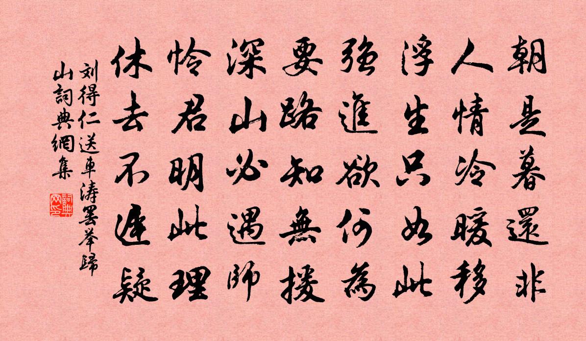 詩詞名句歷史字典書法欣賞書法字典國語詞典說文解字康熙字典古漢語字典標 題 作 者 詩 句 送車濤罷舉歸山作者:劉得仁 朝代:唐代送車濤罷舉歸山原文朝是暮還非,人情冷暖移。浮生只如此,強進欲何為。要路知無援,深山必遇師。憐君明此理,休去不遲疑。詩詞問答問:送車濤罷舉歸山的作者是誰?答:劉得仁問:送車濤罷舉歸山寫於哪個朝代?答:唐代問:送車濤罷舉歸山是什麼體裁?答:五律劉得仁送車濤罷舉歸山書法欣賞送車濤罷舉歸山書法作品注釋全唐詩:卷544-69詩詞推薦賢者之孝二百四十首孟莊子林同〔宋代〕無改父之道,真堪以孝稱。若論莊子孝,此直是難能。玉爐三澗雪 勤勞丘處機〔元代〕物外雖明端的,天心未放玲瓏。區區陌上走西東。也學浮生作夢。夢寐更勞數載,岩龕復度三冬。待佗訊息顯真功惜雙雙令/惜分飛劉弇〔宋代〕風外桔花香暗度。飛絮綰、殘春歸去。醞造黃梅雨。冷煙曉占橫塘路。翠屏人在天低處。驚夢斷、行雲無據。此恨上方僧韋應物〔唐代〕見月出東山,上方高處禪。空林無宿火,獨夜汲寒泉。不下藍溪寺,今年三十年。宿卓水許衡〔元代〕寒釭挑盡火重生,竹有清聲月自明。一夜客窗眠不穩,卻聽山犬吠柴荊。寒谷暉法師贊釋大觀〔宋代〕祖庭力探,義天橫截。南湖雨華,屢踞前列。鼎峙三觀兮菟元斑,區分一乘兮尾閭自泄。海闊山遙難追軌轍。雲暖滿江紅(壽八十老人·十一月十六日)佚名〔宋代〕蓬島仙翁,元來是、神鍾岳瀆。喜遇生申時節,一陽來復。蓂莢合朝曾舞翠,月華昨夜圓如玉。展紅箋、泚筆染新台城雜詩七首曹勛〔宋代〕卜築城隅久罷休,數椽忽得水西頭。四圍竹色繚寒碧,一徑杉風留素秋。門外水天分棐幾,天邊桂子入簾鉤。指蹤視田五首贈八弟無斁晁補之〔宋代〕家世不為農,長安有大第。官糧弗充口,萬里聊自庇。一從學聱牙,世事百色廢。賣牛姑補屋,歲晚霜雪至。秋懷虞儔〔宋代〕登樓何處不陳詩,況是秋高木落時。極目但隨歸雁遠,老懷猶作故鄉悲。毋寧觴詠須前輩,有底功名亦後期。試問卜運算元洪咨夔〔宋代〕芍藥打團紅,萱草成窩綠。簾卷疏風燕子歸,依舊盧仝屋。貧放麴生疏,聞到青奴熟。掃地焚香伴老仙,人勝連環憶鄂渚劉過〔宋代〕我離鄂渚已十年,吳兒越女空華鮮。不如上游古形勢,四十餘萬兵籌邊。中原地與荊襄近,烈士烈兮猛士猛。澤連以蠟梅分供堂頭希盧首座沖南首座惠絕句次韻趙蕃〔宋代〕蜜黃初出一枝春,分似堂中得定人。各各聞香獲三昧,信知文字本非真。三奠子劉秉忠〔元代〕念我行藏有命,煙水無涯。嗟去雁,羨歸鴉。半生形原作人,據抄本改累影,一事鬢生華。東山客,西蜀道,且還三月乙巳來賦鹽萬歲鄉且搜獼匿賦之家晏飯此黃庭堅〔宋代〕幽叢秀色可攬擷,煮餅菊苗深注湯。飲冰食櫱浪自古,摩挲滿懷春草香。西師底定伊犁捷音至詩以述事乾隆〔清代〕乘時命將定條枝,天佑人歸捷報馳。無戰有徵安絕域,壺漿簞食迎王師。兩朝締構敢石繼,百世寧綏有所思。好雨緣識宋太宗〔宋代〕大矣哉文,道合南薰。包含六義,洞究三墳。傍通造化,察變聲聞。垂其懿範,萬一之分。留別唐彥謙〔唐代〕丹湖湖上送行舟,白雁啼殘蘆葉秋。採石江頭舊時路,題詩還憶水邊樓。夏日雜題陸游〔宋代〕一枝黎峒桄榔杖,二寸羊城蝳蝐冠。萬里來為老人壽,始知天地不勝寬。七月十二日夜登清心閣醉吟楊萬里〔宋代〕小樓秋夜月明底,仰不見天惟見水。岸巾獨立四無人,白月青天伴楊子。誰知橫玉作秋聲,一聲吹盡九陌塵。月輪名句推薦傷心秦漢,生民塗炭,讀書人一聲長嘆。張可久《賣花聲·懷古》 落葉委埏側,枯荄帶墳隅。潘安《悼亡詩三首》 念歸林葉換,愁坐露華生。張九齡《西江夜行》 對酒當歌,人生幾何!曹操《短歌行》 長風連日作大浪,不能廢人運酒舫。元結《石魚湖上醉歌》 凡人之大體,取捨同者則相是也,取捨異者則相非也。韓非及後人《韓非子·奸劫弒臣》 汾水碧依依,黃雲落葉初飛。孫光憲《河瀆神·汾水碧依依》 狂風落盡深紅色,綠葉成陰子滿枝。杜牧《悵詩》 空自覺、圍羞帶減,影怯燈孤。張炎《渡江雲·山陰久客一再逢春回憶西杭渺然愁思》 思君令人老,歲月忽已晚。佚名《行行重行行》