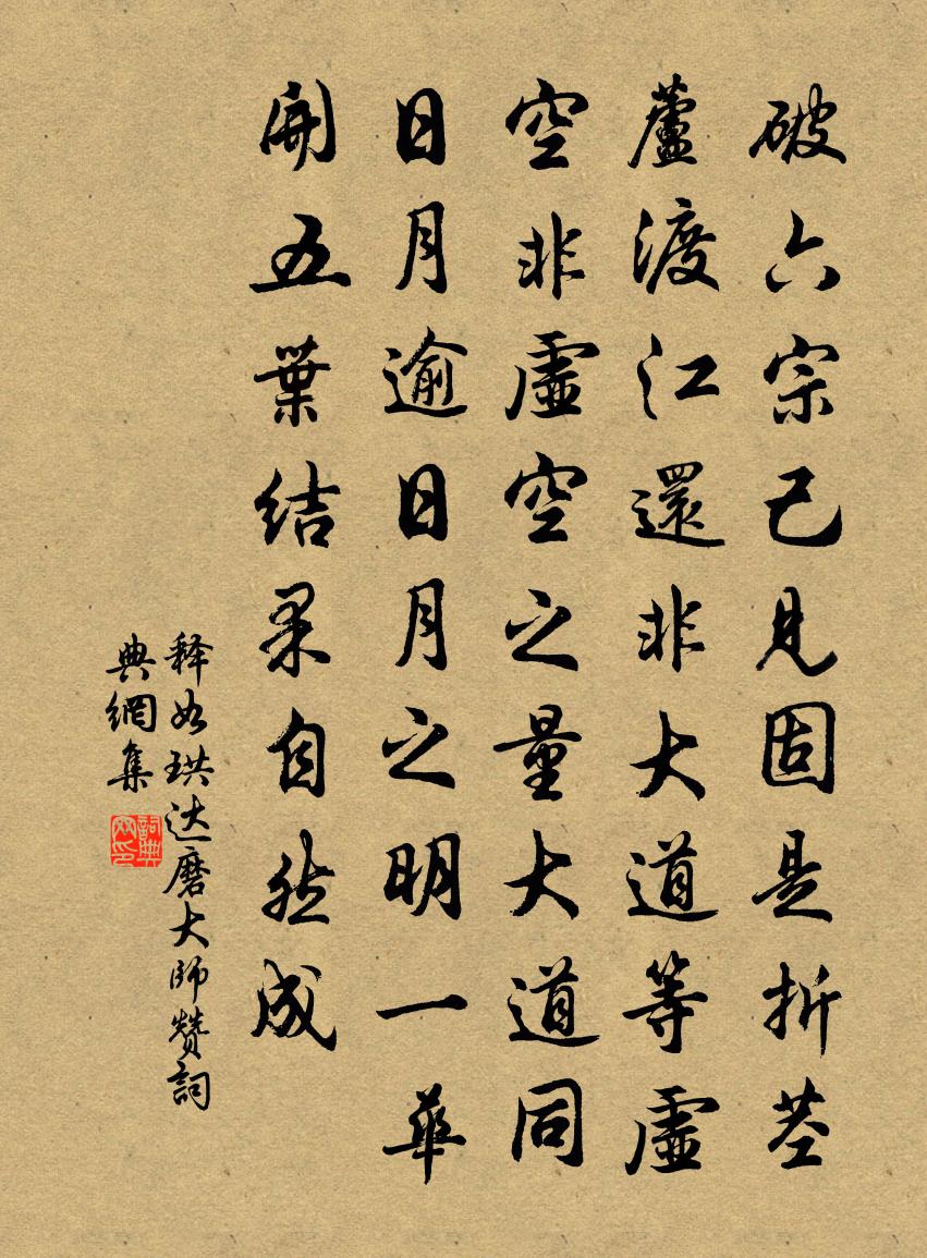 詩詞名句歷史字典書法欣賞書法字典國語詞典說文解字康熙字典古漢語字典標 題 作 者 詩 句 達磨大師贊作者:釋如珙 朝代:宋代達磨大師贊原文破六宗己見固是,折莖蘆渡江還非。大道等虛空,非虛空之量。大道同日月,逾日月之明。一華開五葉,結果自然成。詩詞問答問:達磨大師贊的作者是誰?答:釋如珙問:達磨大師贊寫於哪個朝代?答:宋代釋如珙達磨大師贊書法欣賞達磨大師贊書法作品詩詞推薦除夜楊公遠〔宋代〕檐溜聲中送舊年,團圞笑語不成眠。忽驚雷吼三更後,始司春回半月前。桃板欲題詩未穩,燈花頻結兆開先。明朝虞美人(茂叔、季功置酒稽古堂,以瓶貯四花,因賦)郭應祥〔宋代〕梅桃末利東籬菊。著個瓶兒簇。尋常四物不同時。恰似西施二趙、太真妃。從來李郭多投分。伯仲俱清俊。蒼顏獨贈惠山僧惠表蘇軾〔宋代〕行遍天涯意未闌,將心到處遣人安。山中老宿依然在,案上《楞嚴》已不看。欹枕落花餘幾片,閉門新竹自千竿。謁金門魏了翁〔宋代〕那復有。氣味醲於春酒。猶向故鄉懷印綬。相過何日又。吐出心腸錦繡。問我阿娘依舊。娘亦祝君如柏壽。相看霜冷泉亭方回〔宋代〕金鞍驟紫陌,詎識林下勝。石苔為誰碧,我輩坐乃稱。絲毫無愧容,照此冷泉鏡。竹樹亦如我,不與春色競。匏尊張迪功攜詩見過次韻謝之二首陳與義〔宋代〕黃紙紅旗意未闌,青衫俱不救饑寒。久荒三徑未得返,偶有一錢何足看。世事豈能磨鐵硯,詩盟聊吉歃銅盤。不嫌題鹿田西寺壁吳琳〔宋代〕為從吏隱招提宿,相望城中隔幾塵。雲暗雨來疑是晚,山深寒在不知春。鋤松得石添幽徑。接竹通泉隔近鄰。此去夜後把火看花南園招李十一兵曹不至呈座上諸公呂溫〔唐代〕夭桃紅燭正相鮮,傲吏閒齋困獨眠。應是夢中飛作蝶,悠揚只在此花前。以人生五馬貴莫受侵為韻送胡獻叔守邵陽方岳〔宋代〕迢迢煙水寒,獵獵霜風侵。此行何當還,民瘼簡帝心。臨江仙晁補之〔宋代〕離別尋常今白首,更須竹雨蕭蕭。不應都占世間豪。清風居士手,楊柳洛城腰。文字功名真自誤,從今好月良宵。記十五日夜星犯月李曾伯〔宋代〕兩月之間星入斗,疇昔之夜星入月。入斗前史驗虜走,入月韓詩應虜滅。昭然垂象不輕示,適驗天心厭胡羯。此胡嚴子陵釣台和友人韻董循〔宋代〕子陵垂釣逐江流,相與登台作共游。紅葉黃花三峽雨,高風亮節一天秋。四圍黛色迷青眼,滿幅煙雲鎖綠洲。誰到崇寧元年閏六月廿五日道祖再按鹽亭經光祿坂薛紹彭〔宋代〕光祿坂高鹽亭東,潼江直下如彎弓。山長水遠快望眼,少陵過後名不空。當時江山意不在,草動怕賊悲途窮。客行游圓通寺馬仲珍〔宋代〕一筇吾事足,身世付科頭。漸長石間筍,半遮林杪樓。雲飛山欲動,木落塔如浮。遊客未歸去,松陰人茗甌。將別普濟二首張耒〔宋代〕老槐疏竹寺門幽,九月輕寒襲客裘。漠漠淮煙天際晚,蕭蕭山雨坐中秋。風前紅葉知時落,籬下黃花對客愁。為語寄友人姚合〔唐代〕日暮掩重扉,抽簪復解衣。漏聲林下靜,螢色月中微。秋霽露華結,夜深人語稀。殷勤故山路,誰與我同歸。奉酬臞菴李侍郎白玉蟾〔宋代〕滿月世界琉璃光,通宵不寐據胡床。語言玉潤篇篇錦,心膽冰清字字香。寓嘆陸游〔宋代〕心已忘斯世,天猶活此翁。嫩湯茶乳白,軟火地爐紅。課婢耘蔬甲,呼兒下釣筒。生涯君勿笑,聊足慰塗窮。自喜李商隱〔唐代〕自喜蝸牛舍,兼容燕子巢。綠筠遺粉籜,紅藥綻香苞。虎過遙知阱,魚來且佐庖。慢行成酩酊,鄰壁有松醪。至尋陽詩謝朓〔南北朝〕過客無留軫。馳暉有奔箭。名句推薦河水洋洋,北流活活詩經《碩人》 自從明宰投巫後,直至如今鬼不神汪遵《西河》 年少萬兜鍪,坐斷東南戰未休。辛棄疾《南鄉子·登京口北固亭有懷》 畫棟朝飛南浦雲,珠簾暮卷西山雨。王勃《滕王閣詩》 紛披乍依迥,掣曳或隨風。李世民《詠興國寺佛殿前幡》 文章是山水化境,富貴乃煙雲幻形。王永彬《圍爐夜話·第一二二則》 東面望者不見西牆,南鄉視者不睹北方呂不韋《呂氏春秋·覽·有始覽》 未老莫還鄉,還鄉須斷腸。韋莊《菩薩蠻·人人盡說江南好》 密雲雙鳳,初破縷金團。米芾《滿庭芳·詠茶》 可憐日暮嫣香落,嫁與春風不用媒。李賀《南園十三首》
