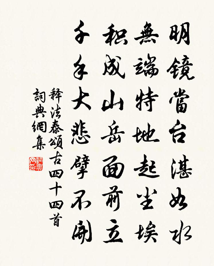 詩詞名句歷史字典書法欣賞書法字典國語詞典說文解字康熙字典古漢語字典標 題 作 者 詩 句 頌古四十四首作者:釋法泰 朝代:宋代頌古四十四首原文明鏡當台湛如水,無端特地起塵埃。積成山嶽面前立,千手大悲擘不開。詩詞問答問:頌古四十四首的作者是誰?答:釋法泰問:頌古四十四首寫於哪個朝代?答:宋代釋法泰頌古四十四首書法欣賞頌古四十四首書法作品詩詞推薦清平樂劉秉忠〔元代〕夜來霜重。簾外寒風勁。橫笛樓頭才一弄。驚破綠窗幽夢。起來情緒如何。開門月色猶多。照我如常如畫,更誰能登岳陽樓蕭德藻〔宋代〕荒村三月不肉味,並與瓜茄倚閣休。造物於人相補報,問天賒得一山秋。寄送府判寺簿先生二首趙蕃〔宋代〕朱游不肯留東閣,子政猶須校秘書。自有大名喧宇宙,豈勞當路借吹噓。舟中加意護寢飯,日下即當來詔除。大廈長樂舊縣李士會〔宋代〕千古空傳長樂溪,誰知樂極已生悲。淒煙斷礎祝家市,落日荒城柳尹祠。上起何年無信史,中更鉅變有殘碑。青峰頌古二十一首釋心月〔宋代〕野火炎炎何處起,紫煙紅焰便燒人。須知坐臥經行里,見得無殊用得親。句孫魴〔唐代〕遊子未歸去,野花愁破心。劃多灰漸冷,坐久席成痕。結宇孤峰上,安禪巨浪間。分開朝海浪,留住過江雲。劃多章靖馮公哀詞宋祁〔宋代〕華殿推名學,南宮重亞卿。心無二何佞,身有兩龔清。歸沐賓綦鮮,幽通筆思精。邦人為公恨,不見相承平。孟浩然歸南山圖葉茵〔宋代〕笑指南山躍馬歸,明知舉似棄才詩。亭前千古標芳姓,未可窮通論一時。和三兄除夜晏殊〔宋代〕星漢回曾宇,塤篪集上都。夜寒凝爆燎,春氣入屠蘇。九陌傳珂乘,千門促漏壺。此時開棣宴,仍在碧城隅。九絕為亞卿作韓駒〔宋代〕妾願為雲逐畫檣,君言十日看歸航。恐君回首高城隔,直倚江樓過夕陽。 早秋宋伯仁〔宋代〕秋天一餉晚風涼,笑語人傳早稻香。樓上醉時簾半卷,愁添客鬢兩蒼蒼。農謠方岳〔宋代〕漠漠余香著草花,森森柔綠長桑麻。池塘水滿蛙成市,門巷春深燕作家。王岩叟招飲南園韓維〔宋代〕翠木珍叢百畝問,我來雖晚及春殘。未嗟流景飄蓬疾,猶喜余芳對酒看。斜照舒遲明埤堄,清陰迢遞覆欄乾。憑君演雅六言二首楊萬里〔宋代〕觳觫受田百畝,蠻觸有宅一區。蚍蜉戒之在斗,蠅蚋寔繁在徒。贈江西詩客吳晦之〔宋代〕五言詩作七寶塔,四壁惟餘八尺床。一月二十九日醉,百年三萬六千場。朝中措(移桃花作)周紫芝〔宋代〕小桃花動著枝濃。移得伴衰翁。多謝天公憐我,一時染就輕紅。春光猶在,花枝未老,莫放尊空。休倚半岩煙樹,全真以斯遠所寄文卷後夜賦兩絕句元韻作詩寄趙蕃〔宋代〕行時取別太匆匆,別後經懷數載中。賴有書函與文卷,不然何地可聞風。縣樓獨酌文同〔宋代〕向晚無公事,身如太古閒。縣樓明夕照,樽酒對南山。放意利名外,游心天地間。生來不能飲,到此學酡顏。漁家傲(贈曹光州)蘇軾〔宋代〕些小白須何用染。幾人得見星星點。作郡浮光雖似箭。君莫厭。也應勝我三年貶。我欲自嗟還不敢。向來三郡寧非臨江玉虛觀有牡丹思後輔亦正開恨不與集趙善括〔宋代〕絳苞翠幄壓朱欄,秀色生香觀里看。小圃相須春爛熳,大家應是醉團欒。名韁久縱心無累,利徑雖馳興易闌。但願名句推薦何處是歸程?長亭連短亭。李白《菩薩蠻·平林漠漠煙如織》 江上幾人在,天涯孤棹還。溫庭筠《送人東遊》 故人早晚上高台。贈我江南春色、一枝梅。舒亶《虞美人·寄公度》 葉潤林塘密,衣乾枕席清。杜甫《水檻遣心二首》 我自中宵成轉側,忍聽湘弦重理。納蘭性德《金縷曲·亡婦忌日有感》 地中有山,謙;君子以裒多益寡,稱物平施。佚名《易傳·象傳上·謙》 有花堪折直須折,莫待無花空折枝。無名氏《雜詩》 丹漆不文,白玉不雕佚名《孔子家語·好生》 白水滿春塘,旅雁每迥翔。沈約《詠湖中雁》 夫有尤物,足以移人左丘明《左傳·昭公·昭公二十八年》