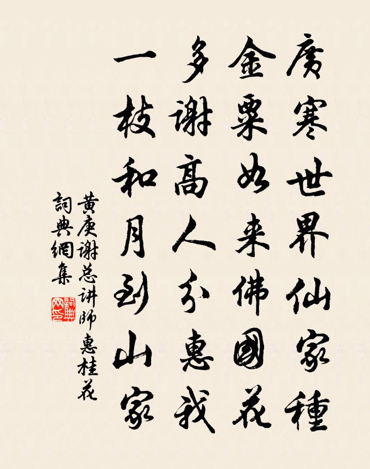 詩詞名句歷史字典書法欣賞書法字典國語詞典說文解字康熙字典古漢語字典標 題 作 者 詩 句 謝總講師惠桂花作者:黃庚 朝代:宋代謝總講師惠桂花原文廣寒世界仙家種,金粟如來佛國花。多謝高人分惠我,一枝和月到山家。詩詞問答問:謝總講師惠桂花的作者是誰?答:黃庚問:謝總講師惠桂花寫於哪個朝代?答:宋代黃庚謝總講師惠桂花書法欣賞謝總講師惠桂花書法作品詩詞推薦酬湯莘夫用懷孫溫叟韻見貽趙蕃〔宋代〕長夜漫漫起飯牛,飛鳶跕跕墮炎州。是皆有命無悲感,孰若委心安去留,駿足豈嫌鑾輅苦,散才當逭斧斤搜。吾人關王祠李流謙〔宋代〕萬人傑誰可敵,千載名終不磨。此地晚鐘晨梵,生前鐵馬金弋。奉和聖制經河上公廟張九齡〔唐代〕昔者河邊叟,誰知隱與仙。姓名終不識,章句此空傳。跡為坐忘晦,言猶強著詮。精靈竟何所,祠宇獨依然。道在于闐採花李白〔唐代〕于闐採花人,自言花相似。明妃一朝西入胡,胡中美女多羞死。乃知漢地多名姝,胡中無花可方比。丹青能令醜者賀新郎·春情李玉〔宋代〕篆縷消金鼎,醉沉沉、庭陰轉午,畫堂人靜。芳草王孫知何處?惟有楊花糝徑。漸玉枕、騰騰春醒,簾外殘紅春已秋日書事馬定遠〔宋代〕井邊薏苡吐秋珠,舍下瓜區雜芋區。世道未夷聊小隱,不須辛苦著潛夫。西山尋辛諤孟浩然〔唐代〕漾舟尋水便,因訪故人居。落日清川里,誰言獨羨魚。石潭窺洞徹,沙岸歷紆徐。竹嶼見垂釣,茅齋聞讀書。款言贈遠陸龜蒙〔唐代〕芙蓉匣中鏡,欲照心還懶。本是細腰人,別來羅帶緩。從君出門後,不奏雲和管。妾思冷如簧,時時望君暖。心期丹崖鄭瀛〔宋代〕丹崖之山丹氣浮,葛洪老仙居上頭。丹成一去幾千載,至今猿鶴生清愁。丹井有泉石有拇,流芳直與天地久。我來飛烏道中李流謙〔宋代〕朝發江亭暮山驛,面顏塵埃手黿拆。弟兄相逐兩浮萍,一盞村醪慰愁寂。高堂老人念兒寒,兒念老人不得眠。殷勤連雨偶成二首蘇籀〔宋代〕愚翁夸甫骨應寒,宇宙因誰危與安。治道灼知斯鞅妄,中興竊擬導安難。文章一伎真何益,得失他年極易觀。私喜和顏長官百詠邊庭朱繼芳〔宋代〕一劍沙場獨苦辛,天陰殺氣作黃塵。沉思鳥盡弓無用,肘後累累卻雇身。觀道二篇黃庭堅〔宋代〕廉藺向千載,凜凜若生者。曹李雖無恙,如沈九泉下。短長略百年,共是過隙馬。事來磨其鋒,意氣要傾瀉。風雲梅花十詠全謝張至龍〔宋代〕冰花不留丁,收香盡藏白。一朝作陳人,遜與桃李出。次韻文潛尉福昌時壁間清暑亭詩晁補之〔宋代〕梅福當年守此官,荊山誰見韞琅玕。人如修竹三冬好,詩與清溪九夏寒。未信簪裳妨小隱,蚤時雷雨起深蟠。春風夜讀傳燈雜書六言八首劉克莊〔宋代〕神秀元來得法,志公了不見幾。半夜一缽南邁,明朝只履西歸。玉樓春歐陽澈〔宋代〕年時醉倚溫溫玉。妒月精神疑可掬。香絲篆裊一簾秋,瀲灩十分浮蟻綠。興來笑把朱弦促。切切含情聲斷續。曲中和寄仵判院八首趙希逢〔宋代〕琴樽疇昔記追隨,富貴休教貧賤離。一日相思時十二,無書獨可可無詩。純白禪人求頌釋正覺〔宋代〕明月蘆華未得如,清光自照本來虛。十方坐斷須拈帽,一色功圓要放鋤。轉背石人歸位後,抬頭玉馬過關初。塵塵游水樂煙霞二洞三絕胡仲弓〔宋代〕愛山分席坐松陰,草草杯盤慰賞心。水樂不鳴天籟寂,數聲幽鳥和清吟。名句推薦可憐閨里月,長在漢家營。沈佺期《雜詩三首·其三》 滾滾長江東逝水,浪花淘盡英雄。楊慎《臨江仙·滾滾長江東逝水》 流水落花春去也,天上人間。李煜《浪淘沙令·簾外雨潺潺》 日暮東風怨啼鳥,落花猶似墜樓人。杜牧《金谷園》 微陽下喬木,遠色隱秋山。馬戴《落日悵望》 今日不為,明日忘貨。昔之日已往而不來矣。管仲《管子·乘馬》 可堪孤館閉春寒,杜鵑聲里斜陽暮。秦觀《踏莎行·郴州旅舍》 春欲盡,日遲遲,牡丹時歐陽炯《三字令·春欲盡》 仁不異遠,義不辭難班固《漢書·紀·武帝紀》 卻下水晶簾,玲瓏望秋月。李白《玉階怨》