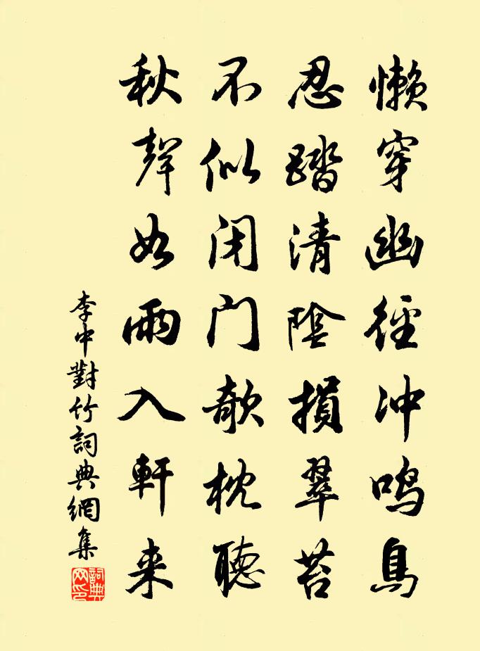 詩詞名句歷史字典書法欣賞書法字典國語詞典說文解字康熙字典古漢語字典標 題 作 者 詩 句 對竹作者:李中 朝代:唐代對竹原文懶穿幽徑沖鳴鳥,忍踏清陰損翠苔。不似閉門欹枕聽,秋聲如雨入軒來。詩詞問答問:對竹的作者是誰?答:李中問:對竹寫於哪個朝代?答:唐代問:對竹是什麼體裁?答:七絕李中對竹書法欣賞對竹書法作品注釋全唐詩:卷748-16詩詞推薦山茶一樹自冬至清明後著花不已陸游〔宋代〕東園三日兩兼風,桃李飄零掃地空。惟有山茶偏耐久,綠叢又放數枝紅。西江月·賦瑤圃青梅枝上晚花吳文英〔宋代〕枝裊一痕雪在,葉藏幾豆春濃。玉奴最晚嫁東風。來結梨花幽夢。香力添熏羅被,瘦肌猶怯冰綃。綠陰青子老溪橋緣識宋太宗〔宋代〕酒一杯,深深不情足,倚檻迢迢青草綠。舉目煙飛勻灼灼,柳搖似舞春風曲。葉嫩舒張芽遍拆,觸處芳菲尋未得。峴山送裴秀才赴舉皎然〔唐代〕漢家招秀士,峴上送君行。萬里見秋色,兩河傷遠情。王師出西鎬,虜寇避東平。天府登名後,回看楚水清。和王大觀寄張仲巽蘇頌〔宋代〕內使名卿話昔游,高談術略氣橫秋。邊亭一別嗟淹久,故眼相看重唱酬。舊德朝端方見用,清才關外苦難留。腰間斃驢李洞〔唐代〕蹇驢秋斃瘞荒田,忍把敲吟舊竹鞭。三尺焦桐背殘月,一條藜杖卓寒煙。通吳白浪寬圍國,倚蜀青山峭入天。如畫和邵不疑校理蒲州十詩芙蕖軒司馬光〔宋代〕荷花爛熳紅,不見方塘水。岧嶢結飛閣,苒惹清香里。露重忽欹側,翩然翠禽起。句釋曉瑩〔宋代〕江上閒吟立又行。和午枕趙希逢〔宋代〕春酲未析眼慵開,困臥藤床隱腹雷。陪笑不容掀幌問,一雞啼午自驚回。鴻禧觀次高橫槎韻趙孟堅〔宋代〕秦望與蘭亭,山山遞送迎。蓴鱸方嫩美,草木亦欣榮。去繼漢疏傅,名肩齊魯生。鴻都讀遺事,誰不動歸情。【大石調】好觀音 怨恨貫雲石〔元代〕先自相逢同歡偶,無妨礙燕侶鶯儔。並坐同肩共攜手,恩情厚,夫婦般相看的好。 【麼】打聽的新來迷歌酒,方興化輓詞樓鑰〔宋代〕雁塔深論契,鵷班試著行。參亡聞易簀,越吊後除喪。支郡難留鄧,佳城久夢方。吁嗟德浮位,回施與諸郎。至揚州文天祥〔宋代〕路傍邂逅賣柴人,為說高沙可問津。此去儂家三十里,山坳聊可避風塵。點絳唇(家人生日)毛滂〔宋代〕何處君家,蟠桃花下瑤池畔。日遲煙暖。占得春長遠。幾見花開,一任年光換。今年見。明年重見。春色如人面。挽開府宋公林表民〔宋代〕五朝大老今誰是,曉月長庚可愴然。王某曾當揮制日,伏生將及授書年。雁峰去就朱輪養,台嶺歸從白布纏。秩視宿羲丘橋陳宓〔宋代〕月窗頻誤曉,風潤更迷晴。蚤欲載星上,翻成踏雨行。奇峰才一面,古佛尚餘情。我亦愛閒者,它年尋此盟。次韻元厚之少保留題朱伯原秘校園亭三首程師孟〔宋代〕碧瓦春城十萬家,可憐夫子獨堪嗟。園林猶有前朝木,冠蓋難尋故主花。亭瞰夕陽鄰古剎,池通野水見晴沙。天然和率齋王簾使三首劉鑒〔宋代〕試手東風第一杯,南冠久掛市門梅。賢遣在野時曾閉,道大如天運復開。江左人傳茂弘相,河汾士喜仲淹來。深衣自潁上歸再題寺壁二絕劉渙〔宋代〕被布羹藜三十春,苦空存性已通真。我來試問孤高士,翻愧區區名利身。青城大面山中有二隱士一曰譙先生定字天陸游〔宋代〕寄謝譙夫子,今年一出無?萬綠隨夢斷,百念與形枯。雲護巢松谷,神呵煆藥爐。憑高應念我,白首學徵租。名句推薦聞善以相告也,見善以相示也戴聖《禮記·儒行》 何處相逢,登寶釵樓,訪銅雀台。劉克莊《沁園春·夢孚若》 人生若只如初見,何事秋風悲畫扇。納蘭性德《木蘭花·擬古決絕詞柬友》 清風明月苦相思,盪子從戎十載餘。王維《伊州歌》 女子今有行,大江溯輕舟。韋應物《送楊氏女》 崖崩路絕猿鳥去,惟有喬木攙天長。蘇軾《李思訓畫長江絕島圖》 治民無常,唯治為法。韓非及後人《韓非子·心度》 取酒須勤醉,鄉關不可思。司馬光《送張寺丞覲知富順監》 歌聲未盡處,先淚零周邦彥《綺寮怨·上馬人扶殘醉》 善在身,介然必以自好也;不善在身,菑然必以自惡也。荀子《荀子·修身》