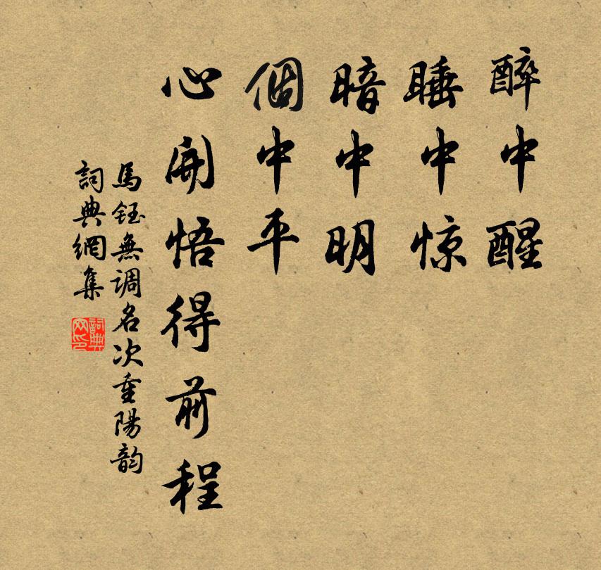 詩詞名句歷史字典書法欣賞書法字典國語詞典說文解字康熙字典古漢語字典標 題 作 者 詩 句 無調名 次重陽韻作者:馬鈺 朝代:元代無調名 次重陽韻原文醉中醒。睡中驚。暗中明。箇中平。心開悟,得前程。詩詞問答問:無調名 次重陽韻的作者是誰?答:馬鈺問:無調名 次重陽韻寫於哪個朝代?答:元代問:無調名 次重陽韻是什麼體裁?答:詞馬鈺無調名 次重陽韻書法欣賞無調名 次重陽韻書法作品詩詞推薦小園雙竹呈瑞二首岳珂〔宋代〕錦繃玉立紀雙清,瑞牒千年重得名。龍竹高標儼元致,熊湘素節凜皇英。質同隴麥兩歧秀,奇並庭柯連理榮。卻羨兵後尋邊三首李山甫〔唐代〕千里煙沙盡日昏,戰余燒罷閉重門。新成劍戟皆農器,舊著衣裳盡血痕。捲地朔風吹白骨,柱天青氣泣幽魂。自憐破山八詠宗教院劉拯〔宋代〕妙義傳天台,迷雲淨如掃。初終雖五時,修短自三草。結隱非此峰,獲藏亦珍寶。秋來月正圓,獨照松已老。秋夜五鼓初起坐堂上至旦陸游〔宋代〕蒸郁不可過,開門星滿天。身還倚藤杖,手自酌岩泉。雞唱猶相續,鴉飛忽已翩。事隨朝日出,佳思復茫然。青杏兒劉處玄〔元代〕迷者似河沙。想世間、學者如麻。萬中敬信無一悟,觀今視古,浮生濁夢,個個都差。達了莫矜誇。訪洞天、閒臥用東坡回文韻李洪〔宋代〕春晚落花餘碧草,日長舞蝶妒紅蔫。新荷卷翠簪池面,弱柳垂絲織暝煙。上元至南劍州大雨寄泉州許通判蔡襄〔宋代〕路繞溪回不計程,行郵今復宿延平。陰雲藏月不知處,急雨落天無數聲。病起尚疑群蟻斗,夢余初聽一雞鳴。泉山贈蔣儒宗算星辰姚勉〔宋代〕看破浮榮醉色醒,如貪青紫豈明經。只煩君把天機泄,四海如今幾福星。聞師文過錢塘二首陳造〔宋代〕九堰三江外,欹帆側柂頻。海鮮當日箸,雨鵲定隨人。椒酒須分歲,江梅巧借春。團欒多樂事,未沬物華新。章法院堂中清坐丘葵〔宋代〕到此人空法亦空,跏趺獨坐夜方中。清還風去明還月,自已清明只在躬。水龍吟 拱北樓呈漢臣學士 郁氏續書畫題跋記鮮于樞〔元代〕倚空金碧崔嵬,鳳山直下如拳小。仰瞻天闕,北辰不動,眾星環繞。喚起群聾,銅龍警夜,靈鼉催曉。自鴟夷去後和阻風潛江以詩禱神廖行之〔宋代〕江行幾日風打頭,江上客子添牢愁。人言水神喜作祟,客欲精禱姑維舟。平生結習口語業,篇詩敢告波神休。欣然九日耿湋〔唐代〕重陽寒寺滿秋梧,客在南樓顧老夫。步蹇強登游藻井,發稀那更插茱萸。橫空過雨千峰出,大野新霜萬葉枯。更望求酒於鄰袁說友〔宋代〕太息官寒獨養疴,浮生半作病維摩。新涼欲學東城醉,亡奈維罍已恥何。次韻劉無言壽山中五絕句敢請諸僚和之葛立方〔宋代〕蕭閒谷飲更岩棲,應笑痴人簿領迷。萬頃青油行省舫,嫩黃輕拂柳條低。聽岳州徐員外彈琴張祜〔唐代〕玉律潛符一古琴,哲人心見聖人心。盡日南風似遺意,九疑猿鳥滿山吟。南歌子溫庭筠〔唐代〕轉眄如波眼,娉婷似柳腰。花里暗相招。憶君腸欲斷,恨春宵。享太廟樂章劉晏〔唐代〕漢祚惟永,神功中興。夙驅氛祲,天覆黎蒸。三光再朗,庶績其凝。重熙累葉,景命是膺。和潞公行及白馬寺得留守相公書雲名園例惜好司馬光〔宋代〕雲漢成章湛露晞,都門宴餞羽觴飛。謝安不復東山去,爭似阿衡得謝歸。蘇武慢凌雲翰〔元代〕驢背馱詩,鴟夷盛酒,曉踏蘇堤殘雪。露闕雲門,璇階玉宇,照耀日華光潔。見說孤山,猶存老樹,清興一時超越名句推薦樹繞村莊,水滿陂塘。秦觀《行香子·樹繞村莊》 哀哀父母,生我勞瘁。佚名《蓼莪》 長亭路,年去歲來,應折柔條過千尺。周邦彥《蘭陵王·柳》 物雖小,勿私藏。苟私藏,親心傷。李毓秀《弟子規·入則孝》 紅蓮相倚渾如醉,白鳥無言定自愁。辛棄疾《鷓鴣天·鵝湖歸病起作》 紅樹青山日欲斜,長郊草色綠無涯。歐陽修《豐樂亭遊春·其三》 修竹畔,疏簾里。歌余塵拂扇,舞罷風掀袂。謝逸《千秋歲·詠夏景》 但願人長久,千里共嬋娟。蘇軾《水調歌頭·丙辰中秋》 黃昏寒立更披襟,露浥清香悅道心。司空圖《白菊雜書四首》 快上西樓,怕天放、浮雲遮月。辛棄疾《滿江紅·中秋寄遠》