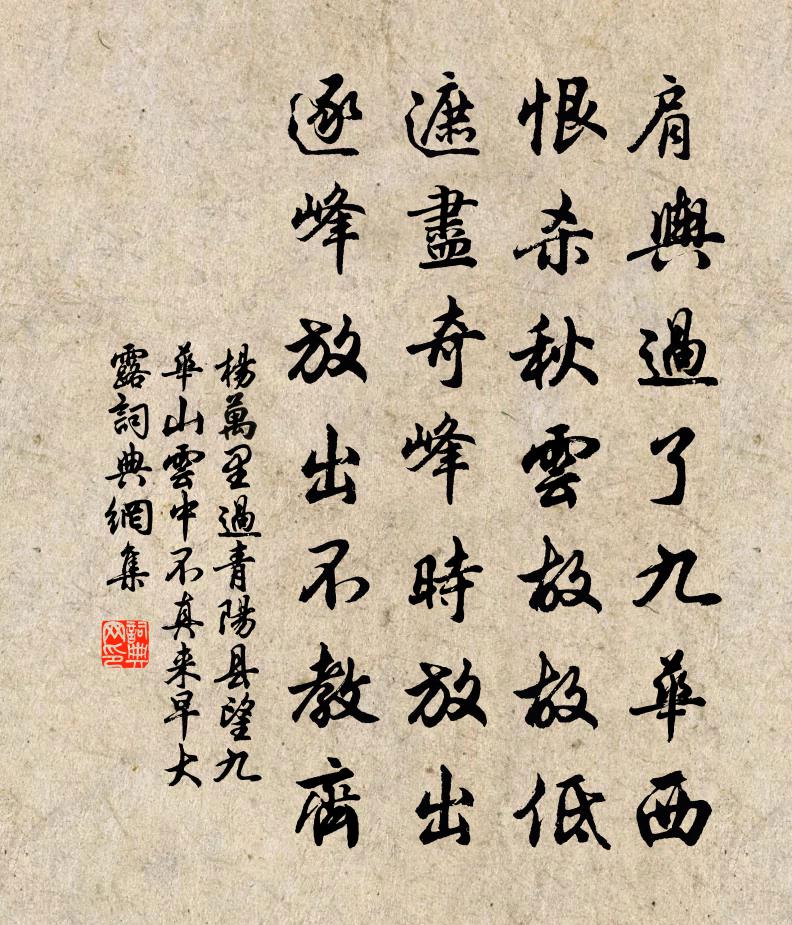 詩詞名句歷史字典書法欣賞書法字典國語詞典說文解字康熙字典古漢語字典標 題 作 者 詩 句 過青陽縣,望九華山,雲中不真。來早大露,作者:楊萬里 朝代:宋代原文肩輿過了九華西,恨殺秋雲故故低。遮盡奇峰時放出,逐峰放出不教齊。詩詞問答問:《過青陽縣,望九華山,雲中不真。來早大露,》的作者是誰?答:楊萬里問:該詩寫於哪個朝代?答:宋代問:楊萬里的名句有哪些?答:楊萬里名句大全書法欣賞過青陽縣,望九華山,雲中不真。來早大露,書法作品詩文賞析【原題】:過青陽縣,望九華山,雲中不真。來早大露,竟不見其全三首詩詞推薦晦日陪侍御泛北池岑參〔唐代〕春池滿復寬,晦節耐邀歡。月帶蝦蟆冷,霜隨獬豸寒。水雲低錦席,岸柳拂金盤。日暮舟中散,都人夾道看。上黨奏慶雲見李紳〔唐代〕飛龍久馭宇,真氣尚興雲。五色傳嘉瑞,千齡表聖君。從風忽蕭索,依漢更氛氳。影徹天初霽,光鮮日未曛。表祥村居晏起於濆〔唐代〕村舍少聞事,日高猶閉關。起來花滿地,戴勝鳴桑間。居安即永業,何者為故山?朱門與蓬戶,六十頭盡斑。浣溪沙(滿院春)韓淲〔宋代〕芍藥酴醿滿院春。門前楊柳媚晴曛。重簾雙燕語沈沈。花映綠嬌初日嫩,葉棲紅小晚煙昏。輕雷不覺送微陰。謝君貺中秋見招不及赴司馬光〔宋代〕不侍庾公宴,月華虛四秋。幸逢東閣開,又阻西園游。清輝散廣座,孤影隨行舟。袞衣如示歸,志願終可酬。春日五首楊時〔宋代〕晴明百鳥囀新聲,摧啄幽花折粉英。冷坐隔簾呼不起,惜春無計若為情。題雙岩堂曾幾〔宋代〕老子徜徉地,岩幽想像間。綠陰城角路,青嶂屋頭山。簿領惟生睡,壺觴不解顏。使人留眼處,龕壁字迴環。解秩西還夕次葛驛二通判與簽判學士留府諸君蘇頌〔宋代〕遠行車馬出西城,風義相高一府傾。留幕經年叨主諾,郵亭終夕困飛觥。人煙數舍將歸路,霜月三冬愴別情。政拙方玄英故居林景熙〔宋代〕艤舟鸕鶿港,白雲滿高原。借問玄英居,遺構無復存。精靈幾百載,山鬼憑幽昏。獨遺文字香,隱隱草樹根。轉盼送於中丞入回鶻顧非熊〔唐代〕風沙萬里行,邊色看雙旌。去展中華禮,將安外國情。朝衣驚異俗,牙帳見新正。料得歸來路,春深草未生。酌佚名〔先秦〕於鑠王師,遵養時晦。時純熙矣,是用大介。我龍受之,蹻蹻王之造。載用有嗣,實維爾公允師。泗濱得石磬李勛〔唐代〕浮磬潛清深,依依呈碧潯。出水見貞質,在懸含玉音。對此喜還嘆,幾秋還到今。器古契良覿,韻和諧宿心。何為酴醿馮時行〔宋代〕萬仙同駕碧雲翔,容與人間散異香。梅似前賢長隔世,酒真同氣莫相忘。流鶯夢斷驚風雨,落月魂銷映雪霜。春暖和沈仲一北湖十詠遲客台陳傅良〔宋代〕借無舟楫亦褰裳,目斷蒹葭水一方。今夜不來同剪韭,隔山明日事茫茫。後城治張繼先〔宋代〕近枕長河即化壇,拎超壇側到河乾。丹砂在地經冬暖,玉竹成林入夜寒。水鶴應思冥象外,山翁愁不到眉端。杖頭天池寺晚步董嗣杲〔宋代〕傍通錦繡谷,上接鐵船峰。月出龍潭淨,風虛佛屋重。四維天象朗,孤閣野雲封。收得天燈葉,熒熒卻絕蹤。得性釋文珦〔宋代〕得性賢於得祿,歸山勝似旭朝。飲澗肺腸清淨,臥雲魂夢逍遙。水龍吟趙長卿〔宋代〕曾著意斟量過,天下事、無窮盡。貪榮貪富,朝思夕計,空勞方寸。躡足封王,功名蓋世,誰如韓信。更堆金積大觀祀社稷九首佚名〔宋代〕[黃鐘二奏]惟土之尊,民食資焉。險祀昭格,牲牢腥翔。有功於民,告其吉蠲。神之來享,雲車翩翩。禽聲陸游〔宋代〕布穀布穀天未明,架犁架犁人起耕。宦途不似農家樂,東作西成過此生。名句推薦江流天地外,山色有無中。王維《漢江臨泛 / 漢江臨眺》 綠萼添妝融寶炬,縞仙扶醉跨殘虹曹雪芹《詠紅梅花得“紅”字》 淒涼別後兩應同,最是不勝清怨月明中。納蘭性德《虞美人·曲闌深處重相見》 垂楊拂綠水,搖艷東風年。李白《折楊柳》 若似月輪終皎潔,不辭冰雪為卿熱。納蘭性德《蝶戀花·辛苦最憐天上月》 願得此身長報國,何鬚生入玉門關。戴叔倫《塞上曲二首·其二》 百年成之不足,一旦壞之有餘。佚名《增廣賢文·上集》 晚春盤馬踏青苔,曾傍綠陰深駐。晏幾道《御街行·街南綠樹春饒絮》 君家玉女從小見,聞道如今畫不成。黃庭堅《謝張仲謀端午送巧作》 生無一日之歡,死有萬世之名。列子及其弟子《列子·楊朱》
