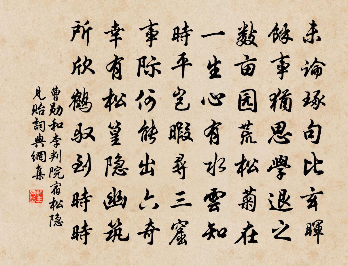 詩詞名句歷史字典書法欣賞書法字典國語詞典說文解字康熙字典古漢語字典標 題 作 者 詩 句 和李判院宿松隱見貽作者:曹勛 朝代:宋代和李判院宿松隱見貽原文未論琢句比玄暉,餘事猶思學退之。數畝園荒松菊在,一生心有水雲知。時平豈暇尋三窟,事際何能出六奇。幸有松篁隱幽築,所欣鶴馭到時時。詩詞問答問:和李判院宿松隱見貽的作者是誰?答:曹勛問:和李判院宿松隱見貽寫於哪個朝代?答:宋代曹勛和李判院宿松隱見貽書法欣賞和李判院宿松隱見貽書法作品詩詞推薦帶馬行 緣化子弟王哲〔元代〕鎖戶真成了。百朝甚惺灑。冰餐非苟且,玄妙就中超,*馬眸粘惹。恩愛俱齊舍。閒遊冶。教余同幽雅。仙子共成沙塞子趙彥端〔宋代〕春水綠波南浦。漸理棹、行人慾去。黯消魂、柳上輕煙,花梢微雨。長亭放無計住。但芳草、迷人去路。忍回頭蝶戀花晏幾道〔宋代〕碾玉釵頭雙鳳小。倒暈工夫,畫得宮眉巧。嫩曲羅裙勝碧草。鴛鴦繡字春衫好。三月露桃芳意早。細看花枝,人面和張寓軒題孤山二首方逢辰〔宋代〕西湖舊事逝如流,紅紫塵沙新綠稠。昔日賞心今日吊,前人遺蹟後人游。雨觀水色連山色,晴看湖頭送日頭。鷗鷺黔中書事竇群〔唐代〕萬事非京國,千山擁麗譙。佩刀看日曬,賜馬傍江調。言語多重譯,壺觴每獨謠。沿流如著翅,不敢問歸橈。赴闕次留獻荊南成相公三十韻吳融〔唐代〕分閫兼文德,持衡有武功。荊南知獨去,海內更誰同。拔地孤峰秀,當天一鶚雄。雲生五色筆,月吐六鈞弓。骨格題本覺寺張鎡〔宋代〕一徑橫穿蘚翠封,滿空聲動玉琤淙。林居豈是無修竹,未有清陰似此濃。靈棋卜洪皓〔宋代〕苦樂迎春詠四愁,詔書未暇蔽要囚。已知行止關天命。暫卜窮通聽鬼謀。移監窖幽餐鼠草,奉春械擊易羊裘。何時和人次韻魚玄機〔唐代〕喧喧朱紫雜人寰,獨自清吟日色間。何事玉郎搜藻思,忽將瓊韻扣柴關。白花發詠慚稱謝,僻巷深居謬學顏。不用又賦文天祥〔宋代〕寄興逃吾病,吟詩老此生。風高鴻雁起,晴久鵓鳩鳴。野樹辭秋落,溪雲帶雨行。晚涼便懶坐,移傍竹陰清。寄李簡夫宮使五首蘇泂〔宋代〕嘉言深味道之腴,啟鑰抽關許自如。顧我但將行腳誤,輸君全得病工夫。郡中玩月,寄江南李少尹虞部孟員外三首羊士諤〔唐代〕月滿窗自高丘,窗江通無狹窗流。軒窗開到曉,風物坐含秋。鵲警銀河斷,蛩悲翠幕幽。清光望不極,耿耿下西樓贊東山五祖和尚釋心月〔宋代〕輥繡毬,打瓦鼓。半巴音,半魯語。心膽傾,面目露。不可塑。故天下稱之曰東山演祖。吳興新堤朱慶餘〔唐代〕春堤一望思無涯,樹勢還同水勢斜。深映菰蒲三十里,晴分功利幾千家。謀成既不勞人力,境遠偏宜隔浪花。若與雜曲歌辭結客少年場行盧照鄰〔唐代〕長安重遊俠,洛陽富才雄。玉劍浮雲騎,金鞍明月弓。鬥雞過渭北,走馬向關東。孫賓遙見待,郭解暗相通。不受次韻蘇公竹間亭小飲陳師道〔宋代〕自昔有遺韻,小飲不盡觴。坐待竹間月,奈此雲影長。起行林下路,散策踰平崗。破眼一枝春,著意千葉黃。暄寒斜封官語佚名〔唐代〕姚宋為相,邪不如正。太平用事,正不如邪。書壁劉克莊〔宋代〕練衣蒲屨小綸巾,四壁清風一榻塵。誰謂先生貧到骨,百金新聘竹夫人。華胥引(黃鐘秋思)周邦彥〔宋代〕川原澄映,煙月冥濛,去舟如葉。岸足沙平,蒲根水冷留雁唼。別有孤角吟秋,對曉風鳴軋。紅日三竿,醉頭扶起金橋童謠佚名〔唐代〕聖人執節度金橋。名句推薦唯君子為能通天下之志。佚名《易傳·彖傳上·同人》 醉月頻中聖,迷花不事君李白《贈孟浩然》 千古江山,英雄無覓孫仲謀處辛棄疾《永遇樂·京口北固亭懷古》 始憐幽竹山窗下,不改清陰待我歸。錢起《晚春歸山居題窗前竹 / 暮春歸故山草堂詩》 長楊跨武騎,細柳接戎軒。鄭愔《奉和幸望 * 送朔方大總管張仁亶》 祖宗疆土,當以死守,不可以尺寸與人。脫脫《宋史·列傳·卷一百一十七》 月華如練,長是人千里。范仲淹《御街行·秋日懷舊》 草樹知春不久歸,百般紅紫斗芳菲。韓愈《晚春》 功不可以虛成,名不可以偽立班固《漢書·傳·敘傳上》 榮所眾羨,亦引眾怨。來俊臣《羅織經·固榮卷第六》