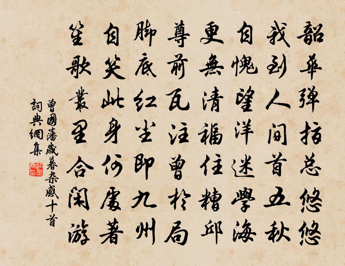 詩詞名句歷史字典書法欣賞書法字典國語詞典說文解字康熙字典古漢語字典標 題 作 者 詩 句 歲暮雜感十首作者:曾國藩 朝代:清代歲暮雜感十首原文韶華彈指總悠悠,我到人間首五秋。自愧望洋迷學海,更無清福住糟邱。尊前瓦注曾於局,腳底紅塵即九州。自笑此身何處著,笙歌叢里合閒遊。詩詞問答問:歲暮雜感十首的作者是誰?答:曾國藩問:歲暮雜感十首寫於哪個朝代?答:清代曾國藩歲暮雜感十首書法欣賞歲暮雜感十首書法作品詩詞推薦甘露謳曹植〔魏晉〕玄德洞幽。飛化上承。甘露以降。蜜淳冰凝。覩陽弗晞。瓊爵是承。獻之帝廟。以明聖征。松湖和曾文清公韻趙蕃〔宋代〕有水可為湖,栽松欲以呼。不貪魚鱉數,無取芰荷都。老杜論能擬,陶翁興不孤。風吟與雪釣,曾有畫圖無。定風波(魯卿見和,復答之)葉夢得〔宋代〕斜漢初看素月流。坐驚金餅出雲頭。華發蕭然吹素領。光景。何妨分付屬滄洲。莫待霜花飄爛漫。苹岸。更憑佳句抱琴歸去圖唐寅〔明代〕抱琴歸去碧山空,一路松聲雨鬢風。神識獨游天地外,低眉寧肯謁王公。清思詩江淹〔南北朝〕師曠操雅操。延子聆奇音。玄鶴徒翔舞。清角自浮沉。明管東南逝。精絲西北臨。白雲瑤池曲。止使淚淫淫。垂虹亭觀打魚斫鱠四首楊萬里〔宋代〕六隻輕舠攪四旁,兩船不動水中央。網絲一撒還空舉,笑得倚欄人斷腸。紫溪鄔義翁輓詩戴表元〔宋代〕先君老父友,最是後凋人。開館日千屨,藏書山四鄰。門迎新印綬,壙掩古衣巾。會哭會英俊,哀風暗海塵。頌古五十五首釋紹曇〔宋代〕身後身前不丈夫,钁頭邊事想含糊。不知費幾蒼松機,換得渠儂破缽盂。病中步入蔡公橋村落間董嗣杲〔宋代〕水淺篙師勞,況值夏日炎。舟維蔡橋晚,扶行御頑痁。誰期村疃中,雙屐苔花粘。同行幸同志,出語無猜嫌。曉霞嵩山汪元量〔宋代〕行行太室峰,秋聲若鳴鏑。流目矚崎嶇,蓬萊應咫尺。上有神仙區,下有穆王宅。徘徊復徘徊,泫然感疇昔。八駿石州慢(九日)秦觀〔宋代〕深院蕭條,滿地蒼苔,一叢荒菊。含霜冷蕊,全無佳思,向人搖綠。客邊節序,草草付與清觴,孤吟只把羈懷觸。中秋步月羅與之〔宋代〕光陰若劈箭,行樂常恐遲。人生百歲客,擾擾竟何為。四美古難並,千年調亦痴。面生不我棄,邀月聯自怡。清平樂(代使相勸酒)史浩〔宋代〕南陽賓友。道舊須尊酒。一曲為公千歲壽。弦索春風縴手。忠謀黼黻明昌。英詞錦繡甘腸。帝所盛推頗牧,人間尤八月十二日夜偕客賞木犀八首陳造〔宋代〕朋來濟濟盡嘉賓,飲興翩翩笑語真。絕勝謫仙邀月醉,當時和影只三人。哭魯廣達詩江總〔隋代〕黃泉雖抱恨。白日自留名。悲君感義死。不作負恩生。樞密王左丞宅新菊劉筠〔宋代〕東閣留嘉客,寒葩艷曉光。秋風自蕭瑟,台座對熒煌。麗奪雙南價,清含九畹香。嵰州霜薦味,太液鵠分裳。已助感秋姚倫〔唐代〕試向疏林望,方知節候殊。亂聲千葉下,寒影一巢孤。不蔽秋天雁,驚飛夜月烏。霜風與春日,幾度遣榮枯。大酺方千里〔宋代〕正夕陽間,秋光淡,鴛瓦參差華屋。高低簾幕迥,但風搖環珮,細聲頻觸。瘦怯單衣,涼生兩袖,零亂庭梧窗竹。送友人任括州沈佺期〔唐代〕青春浩無際,白日乃遲遲。胡為賞心客,嘆邁此芳時。甌粵迫茲守,京闕從此辭。茫茫理雲帆,草草念行期。紛吾行春次俞兄韻吳龍翰〔宋代〕幾日春愁不出行,園林又是了清明。春風桃李一場夢,夜月江山千古情。吟倚長松伺鶴到,坐臨釣石看雲生。此懷名句推薦誤用聰明,何若一生守拙王永彬《圍爐夜話·第四一則》 王侯將相寧有種乎?司馬遷《史記·陳涉世家》 記少年、駿馬走韓盧,掀東郭。辛棄疾《滿江紅·和范先之雪》 心有疑,隨札記。就人問,求確義。李毓秀《弟子規·餘力學文》 東風灑雨露,會入天地春。李白《送郄昂謫巴中》 客有哀時失職而聽者,淚淋浪以沾襟。李白《幽澗泉》 大樹無枝向北風,十年遺恨泣英雄。高啟《吊岳王墓》 思婦高樓上,當窗應未眠。徐陵《關山月》 天與秋光,轉轉情傷,探金英知近重陽。李清照《行香子·天與秋光》 鬢髮已甘塵路白,菊花猶送塞垣黃。齊之鸞《九日登清水營城》