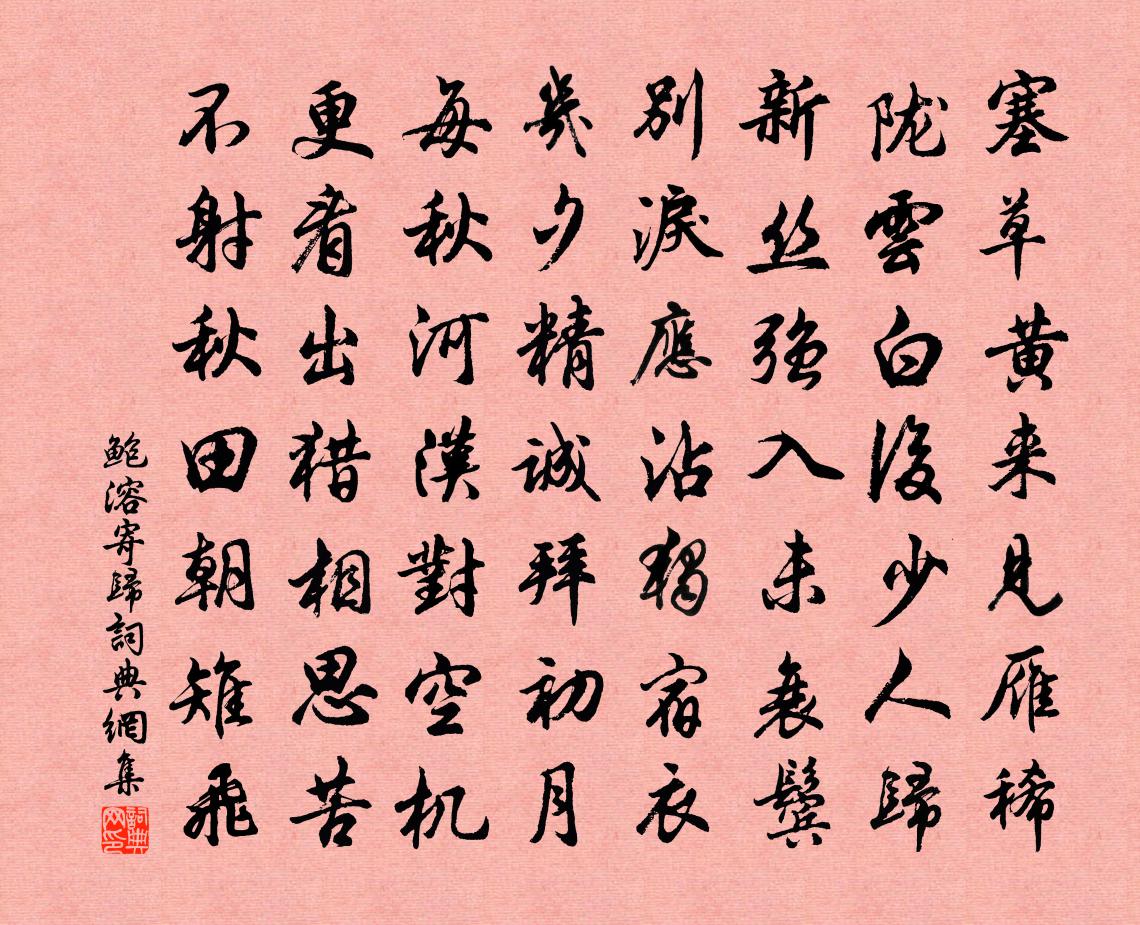 詩詞名句歷史字典書法欣賞書法字典國語詞典說文解字康熙字典古漢語字典標 題 作 者 詩 句 寄歸作者:鮑溶 朝代:唐代寄歸原文塞草黃來見雁稀,隴雲白後少人歸。新絲強入未衰鬢,別淚應沾獨宿衣。幾夕精誠拜初月,每秋河漢對空機。更看出獵相思苦,不射秋田朝雉飛。詩詞問答問:寄歸的作者是誰?答:鮑溶問:寄歸寫於哪個朝代?答:唐代鮑溶寄歸書法欣賞寄歸書法作品詩詞推薦吳江岸(或為蘇舜欽作)蘇軾〔宋代〕曉色兼秋色,蟬聲雜鳥聲。壯懷銷鑠盡,回首尚心驚。新繁縣顯曜院梅摯〔宋代〕繡地縈迴實勢長,遍游寧倦徒胡床。禪齋不顧幡風影,講席亂飛花雨香。苔陣暗連僧榻古,蕉旗低映佛窗涼。我來別舍弟後月夜白居易〔唐代〕悄悄初別夜,去住兩盤桓。行子孤燈店,居人明月軒。平生共貧苦,未必日成歡。及此暫為別,懷抱已憂煩。況是題桐廬謝逸人(一作題廬峰謝山人)江居方乾〔唐代〕少小高眠無一事,五侯勛盛欲如何。湖邊倚杖寒吟苦,石上橫琴夜醉多。鳥自樹梢隨果落,人從窗外卸帆過。由來李尹叔知丞借華嚴子仙山子楚以詩道其事李有王洋〔宋代〕與君淮浦接鄉關,聞道忙中也自閒。向似浮花真客宅,心歸實地是家山。窗明篤耨朝煙細,榻靜籧篨午夢殘。更問勝勝慢/聲聲慢趙長卿〔宋代〕金垂煙重,雪揚風輕,東風慣得多嬌。秀色依依,偏應綠水朱樓。腰肢先來太瘦,更眉尖、惹得閒愁。牽情處,是和永叔琅琊山六詠其六惠覺方丈梅堯臣〔宋代〕松門隱者我未識,一見君詩如已奭。歲月任隨人事遷,此身不動雲生壁。和書天慶觀賀秘監堂三首秦觀〔宋代〕衣屨蕭條氣久清,豪家門館未嘗行。朱甍碧瓦何從得,疑有陰兵夜助成。病假中龐少尹攜魚酒相過白居易〔唐代〕宦情牢落年將暮,病假聯綿日漸深。被老相催雖白首,與春無分未甘心。閒停茶碗從容語,醉把花枝取次吟。勞動使回赴蘇州道中作劉長卿〔唐代〕春風何事遠相催,路盡天涯始卻回。萬里無人空楚水,孤帆送客到魚台。質夫和來鄧肅〔宋代〕我生不顧四壁空,千金買笑 * 。半夜酒紅潮玉頰,亭亭秋水影芙蓉。作文忽慕元和格,送入賢關親眉白。遽聞同李益傷秋盧綸〔唐代〕歲去人頭白,秋來樹葉黃。搔頭向黃葉,與爾共悲傷。因大師請贊釋師範〔宋代〕不是神,不是鬼。突出人前,是何面嘴。妙因等閒覷破,扣齒擎拳頂禮。唵蘇嚧蘇嚧{左口右悉}唎{左口右悉}奉和江沖陶居二十韻汪炎昶〔宋代〕看雲已堪眠,待月兼宜坐。誰令作棋局,卻使蒼苔破。觀游女次韻鄧深〔宋代〕麗人春遊相百十,此風長沙雲舊習。綺羅映肌白玉鮮,珠翠壓鬢烏雲濕。借地持杯遞呼喚,笑指花枝時小立。晚風卓望山黃漳〔宋代〕簿領紛迷日不間,偶因佳節一登山。風飄木葉雁初到,霜度岩籬菊漸班。與客不妨長送酒,對時聊爾暫開顏。憑欄次韻德麟督叔弼季默詩及破余酒戒陳師道〔宋代〕歲月不相貸,夜床衾簟秋。朝來明鏡中,作意多少留。惟酒可為娛,顧我非其流。丈夫意氣合,佩玦不循鉤。意行次蘭皋自詠楊公遠〔宋代〕生來無分對書燈,卻喜逢人便眼青。枵腹謾臨求米帖,學耕頻勘相牛經。堎贈骨相身長健,磊磈襟懷鬢未星。密掩黃兄宇出示湯丈追和春日詩適有會余情者次韻杜范〔宋代〕君不見西山凜凜百世師,忍窮受餓終采蕨。又不見愧謬遺臭幾千載,當年方丈厭肥滑。孰得孰失試大觀,較若五味十月二十六日三偈范成大〔宋代〕聲聞與色塵,普以妙香薰。昔汝來迷我,今吾卻戲君。名句推薦掛席幾千里,名山都未逢。孟浩然《晚泊潯陽望廬山》 今夜送歸燈火冷,河塘,墮淚羊公卻姓楊。蘇軾《南鄉子·和楊元素時移守密州》 荒城臨古渡,落日滿秋山。王維《歸嵩山作》 分不盡,半涼天。可憐閒剩此嬋娟。吳文英《思佳客·閏中秋》 愁看飛雪聞雞唱,獨向長空背雁行。羅鄴《早發》 世所相信,在能行,不在能言。王永彬《圍爐夜話·第九九則》 示上以足,示下以惠,怨自削減。來俊臣《羅織經·固榮卷第六》 風吹芳蘭折,日沒鳥雀喧。李白《送裴十八圖南歸嵩山二首》 耕則問田奴,絹則問織婢。魏收《魏書·列傳·卷五十三》 兼相愛,交相利。墨子《墨子·15章 兼愛(中)》
