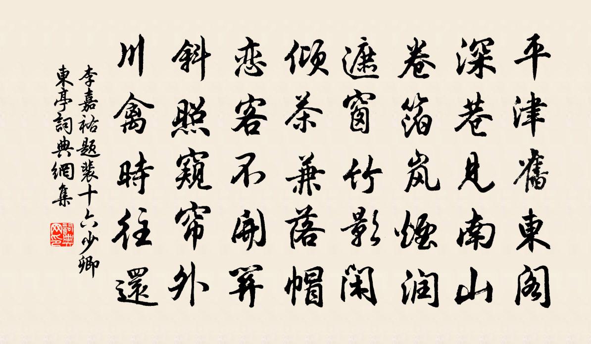 詩詞名句歷史字典書法欣賞書法字典國語詞典說文解字康熙字典古漢語字典標 題 作 者 詩 句 題裴十六少卿東亭作者:李嘉祐 朝代:唐代題裴十六少卿東亭原文平津舊東閣,深巷見南山。卷箔嵐煙潤,遮窗竹影閒。傾茶兼落帽,戀客不開關。斜照窺簾外,川禽時往還。詩詞問答問:題裴十六少卿東亭的作者是誰?答:李嘉祐問:題裴十六少卿東亭寫於哪個朝代?答:唐代李嘉祐題裴十六少卿東亭書法欣賞題裴十六少卿東亭書法作品注釋全唐詩:卷206_45詩詞推薦訪李奐山人隱居文同〔宋代〕多暇無所適,故來尋隱君。搴開壓屋樹,觸散擁門雲。狀貌不妨古,言談何太文。令人重高趣,歸去每斜曛。聞寓舍之側花盛開口占絕句吳頤〔宋代〕君嫌無伴懶看花,我向花時更憶家。欲趁芙蓉同一醉,秋江好為送歸槎。白日偶無客青山長對門韓淲〔宋代〕不見屋外溪,但見屋上山,雲月復風雨,展轉朝暮間。淮南臥病感路群侍御訪別鮑溶〔唐代〕西台御史重難言,落木疏籬繞病魂。一望青雲感驄馬,款行黃草出柴門。明發陳公徑過摩舍那灘石峰下十首楊萬里〔宋代〕地迥人絕影,山僻虎留跡。下有無底潭,上有欲落石。是間一逕橫,來以萬松直。樹從何時有,陳公所手植。陳公滕縣時同年西園蘇軾〔宋代〕人皆種榆柳,坐待十畝陰。我獨種松柏,守此一寸心。君看閭裡間,盛衰日駸駸。種木不種德,聚散如飛禽。老時萬頃田趙希邁〔宋代〕萬頃平田一望中,獨乘瘦馬常吟筇。天連濁霧無非海,地少嚴寒不類冬。刺竹滿林生似蝟,古榕臨水臥如龍。村家客舍寓懷錢〔唐代〕灑灑灘聲晚霽時,客亭風袖半披垂。野雲行止誰相待,明月襟懷只自知。無伴偶吟溪上路,有花偷笑臘前枝。牽情偈六十九首釋道寧〔宋代〕大道無私,要由心悟。心無形狀,全物而彰。妙契斯關,萬緣俱備。即事 其二王冕〔元代〕草徑無人到,柴門盡日關。脫巾垂白髮,把酒對青山。世薄驚時異,身貧得夢閒。夜深明月下,吟待鶴飛還。寄陳式五兄白居易〔唐代〕年來白髮兩三莖,憶別君時髭未生。惆悵料君應滿鬢,當初是我十年兄。將赴蘇州途出洛陽留守李相公累申宴餞寵行…以申仰謝劉禹錫〔唐代〕歲杪風物動,雪餘宮苑晴。兔園賓客至,金谷管弦聲。洛水故人別,吳宮新燕迎。越郎憂不淺,懷袖有瓊英。和立齋書懷二首王柏〔宋代〕平生景風操,慷慨懷賦竹。恨無百畝地,相與種黃獨。只有滿架書,可寄千古目。何敢偭規矩,周容競追曲。彼不行香子 問修行門戶劉志淵〔元代〕道體平平。瞽者難行。覓邊徼、執 * 精。貪游異路,昧卻前程。啟諸人,高著眼,認無生。湛湛澄澄,醞釀惺惺再次韻趙帥見寄三首陳造〔宋代〕前歡已悔東隅失,後約如前敢再違。連夜揚州昔年夢,小梅清瘦杏花肥。次韻子都寄示和大監叔西湖早春李洪〔宋代〕白蓮尋淨社,紫氣覘幽關。吏隱無公事,鷗盟俯碧灣。泉聲雜鳥哢,雲臥愛僧閒。更欲支筇去,過溪多好山。偈頌一百零二首釋紹曇〔宋代〕旱地毛奔雷,青毛天撒雨毛。六戶毛不扃,龍無龍句。田地穩密底死汗迸流,妙用縱橫底寒毛卓豎。萬別千差透密和同官問耳疾六首曹勛〔宋代〕行年七十化,聵景亦乘時。日近尤為崇,雷轟尚弗知。顧多居士病,賴有寧馨兒。若得都無聽,唯喔見贈詩。和疊山拜李白墓王奕〔宋代〕唐朝組綬不能羈,驢背人者醉似泥。自欲駕虬憑化往,不因飛燕誤宮題。江涵採石吟天闊,月落青山冢未齊。雅廢烏夜啼(西叔兄生日)魏了翁〔宋代〕不肯呈身覓舉,那能隨俗為官。梅花寒颭書窗月,一味漂陽酸。梅里無邊春事,書中千古遐觀。鄰翁不識清閒樂,名句推薦一字無題外,落葉都愁。張炎《八聲甘州·記玉關踏雪事清游》 快上西樓,怕天放、浮雲遮月。辛棄疾《滿江紅·中秋寄遠》 流水本自斷人腸,堅冰舊來傷馬骨。盧思道《從軍行》 合意客來心不厭,知音人聽話偏長。馮夢龍《警世通言·卷一》 知莫大乎棄疑,行莫大乎無過,事莫大乎無悔。荀子《荀子·議兵》 江頭宮殿鎖千門,細柳新蒲為誰綠?杜甫《哀江頭》 離離原上草,一歲一枯榮。白居易《草 / 賦得古原草送別》 悵然孤嘯,青山故國,喬木蒼苔。倪瓚《人月圓·傷心莫問前朝事》 無計奈情何,且醉金杯酒。晏幾道《生查子·輕勻兩臉花》 遼東小婦年十五,慣彈琵琶解歌舞。李頎《古意》