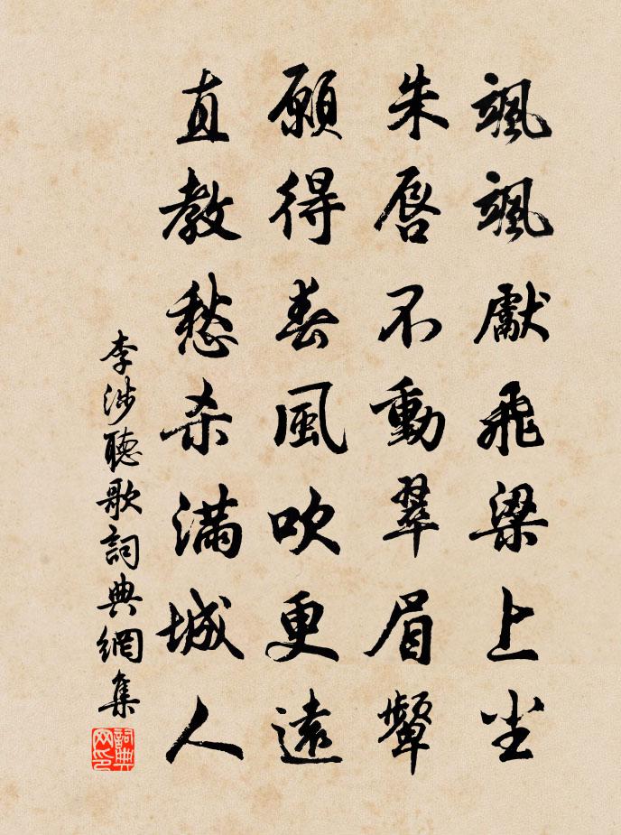 詩詞名句歷史字典書法欣賞書法字典國語詞典說文解字康熙字典古漢語字典標 題 作 者 詩 句 聽歌作者:李涉 朝代:唐代聽歌原文颯颯先飛樑上塵,朱唇不動翠眉顰。願得春風吹更遠,直教愁殺滿城人。詩詞問答問:聽歌的作者是誰?答:李涉問:聽歌寫於哪個朝代?答:唐代問:聽歌是什麼體裁?答:七絕李涉聽歌書法欣賞聽歌書法作品注釋全唐詩:卷477-84詩詞推薦游攝山棲霞寺葉清臣〔宋代〕仙峰多靈草,近在東北維。僧紹昔捨宅,總持嘗作碑。高風一緬邈,廢宇亦陵遲。清泉潄白石,霏霧蒙紫芝。松蘿秋日東郊作皇甫冉〔唐代〕閒看秋水心無事,臥對寒鬆手自栽。廬岳高僧留偈別,茅山道士寄書來。燕知社日辭巢去,菊為重陽冒雨開。淺薄寄上兄長韓偓〔唐代〕兩地支離路八千,襟懷悽愴鬢蒼然。亂來未必長團會,其奈而今更長年。至郡累旬惡風楊億〔宋代〕鄧禹功曹器,馬周令長才。叨臨萬室郡,驟致五風災。大木行將拔,繁雲暗不開。自知蒙闇極,民吏竊相咍。偈頌七十六首釋師觀〔宋代〕人笑鵓鳩拙,勃鳩自不拙。兩莖柴子上,一生打得徹。打刀須是并州鐵。題郭季寬曉耕宿釣二圖楊冠卿〔宋代〕羊裘晦山澤,貂蟬等鴻毛。直鉤道可行,一釣聯六鰲。對食陸游〔宋代〕天賦元無滿谷羊,不煩粱肉污龜腸。忽逢客釜蓴羹美,遙憶山廚麥飯香。正有一簞元自足,縱嘲三韭亦何傷?江邊春雨薛能〔唐代〕電闊照潺潺,驚流往復還。遠聲如有洞,迷色似無山。利物乾坤內,並風竹樹間。靜思來朔漠,愁望滿柴關。迸濕偈頌七十八首釋正覺〔宋代〕尊貴位中尊貴身,綿綿不斷轉金輪。剎塵壽量無窮已,個是乾坤舊主人。潛溪晚歸二首宋庠〔宋代〕詰曲山阿冒石梯,聽泉尋竹到招提。憑蘭未遍催歸馭,可惜溪西更有溪。漁家傲洪皓〔宋代〕圃蕙庭桐雕大半。西風不借行人便。不用留題明月觀。西園宴。顏酡浪說觴無算。萬斛羈愁推不遠。千杯魯酒何曾遣興吳汝弌〔宋代〕編蓬諧夙心,尊古豈文義。所得靡有言,應酬聊爾耳。室中無萊婦,童弱偶成四。團欒寧無思,達此天亦蛻。客來九日無酒仍不見菊唯岩桂一瓶伴此岑寂喻良能〔宋代〕白衣不至酒難賒,兀坐晴窗獨飲茶。今日重陽對岩桂,昔年百本看黃花。觀鑄劍陳郁〔宋代〕良鐵曾收漢益州,規模因塑古吳鉤。爐安吉位分龍虎,火逸神光身鬥牛。入水淬鋒疑電閃,臨崖發刃有星池。知君頌古釋慧空〔宋代〕西來密意庭前柏,有語無語徒分拆。若是道人但舉來,只麼守株無了日。送晁秘丞通判雄州司馬光〔宋代〕少傳名德重,蔚然人物師。群孫滿丹穴,嘉瑞盡長離。勿嘆毛羽短,已驚文采奇。勉哉勤志業,餘慶未應衰。天仙子(公擇將行·般涉調)張先〔宋代〕坐治吳州成樂土。詔捲風飛來聖語。親輿乞得便藩歸,瑤席主。杯休數。清夜為君歌白薴。花接舊枝新蕊吐。造化題賈氏廢園賀鑄〔宋代〕丞相園林半手栽,清樽曾為幾人開。荒榛野蔓換桃李,慙愧春風如故來。宿空侄院寄澹公孟郊〔唐代〕夜坐冷竹聲,二三高人語。燈窗看律鈔,小師別為侶。雪檐晴滴滴,茗碗華舉舉。磬音多風飈,聲韻聞江楚。官街梧桐樹牧常晁〔元代〕參玄人,聽付囑。百歲光陰如迅速。轉眼花開落。大事因緣如未熟。急須猛省開心目。莫被邪師惑。名句推薦群臣見素,則大君不蔽矣。韓非及後人《韓非子·二柄》 燕子歸來依舊忙。憶君王,月破黃昏人斷腸。謝克家《憶君王·依依宮柳拂宮牆》 秋色從西來,蒼然滿關中。岑參《與高適薛據同登慈恩寺浮圖》 非淡泊無以明志,非寧靜無以致遠。諸葛亮《誡子書》 仁不異遠,義不辭難班固《漢書·紀·武帝紀》 同來望月人何處?風景依稀似去年。趙嘏《江樓舊感 / 江樓感舊》 天際兩蛾凝黛,愁與恨、幾時極。韓元吉《霜天曉角·題採石蛾眉亭》 風一更,雪一更,聒碎鄉心夢不成,故園無此聲。納蘭性德《長相思·山一程》 世情薄,人情惡,雨送黃昏花易落。唐婉《釵頭鳳·世情薄》 漁舟逐水愛山春,兩岸桃花夾古津。王維《桃源行》