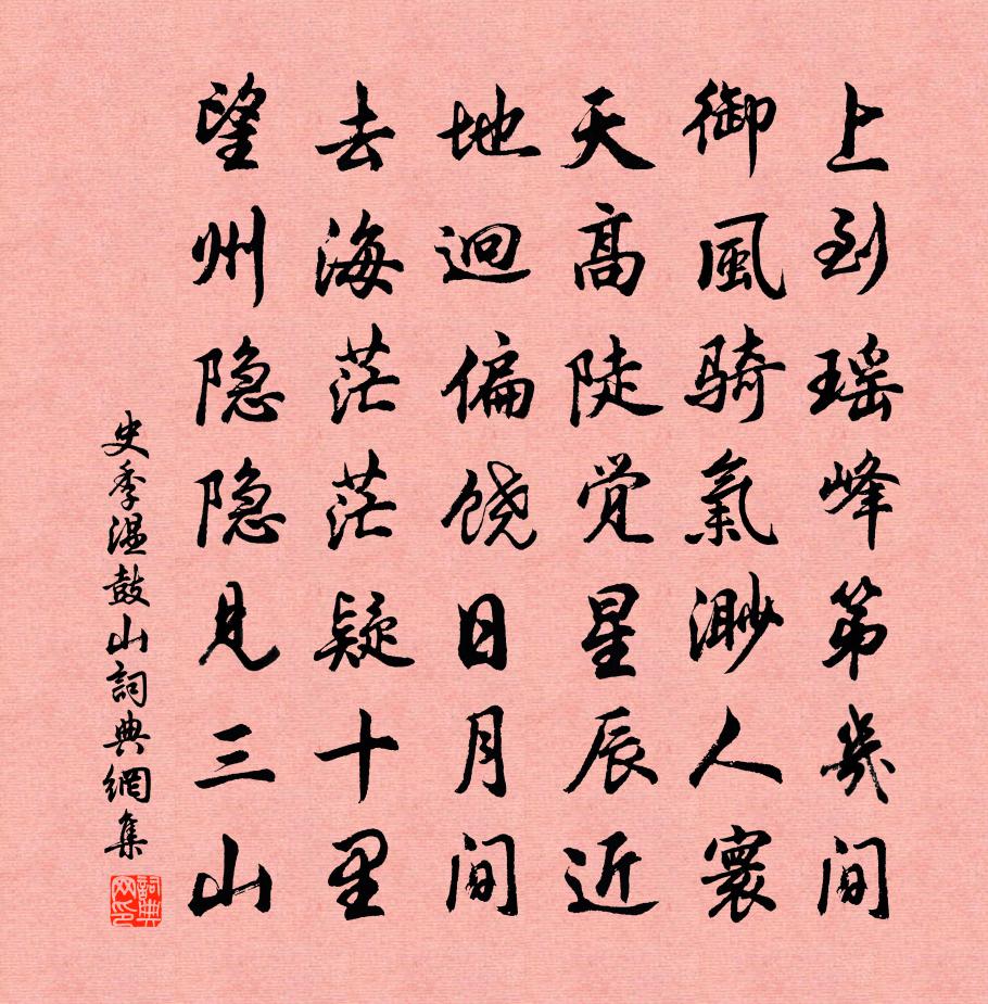 詩詞名句歷史字典書法欣賞書法字典國語詞典說文解字康熙字典古漢語字典標 題 作 者 詩 句 鼓山作者:史季溫 朝代:宋代鼓山原文上到瑤峰第幾間,御風騎氣渺人寰。天高陡覺星辰近,地迥偏饒日月間。去海茫茫疑十里,望州隱隱見三山。詩詞問答問:鼓山的作者是誰?答:史季溫問:鼓山寫於哪個朝代?答:宋代史季溫鼓山書法欣賞鼓山書法作品詩詞推薦霜天曉角(戊午十二月望安晚園賦梅上銀燭)吳潛〔宋代〕梅花一簇,花上千枝燭。照出靚妝恣態,看不足、詠不足。便欲和花宿,卻被官身局。借問江南歸未,今夜夢、難句曾幾〔宋代〕地靈得南徐,天險稱此固。過懷安軍雲頂寺袁說友〔宋代〕拂雲絕頂俯金囦,直上重山最上顛。一佛向來臨大地,萬松今獨近高天。枯楠夭矯渾生意,斷石盤陀幾合年。大士塞下曲姚合〔唐代〕磧露黃雲下,凝寒鼓不鳴。戰須移死地,軍諱殺降兵。印馬秋遮虜,蒸沙夜築城。舊鄉歸不得,都尉負功名。玉台體范成大〔宋代〕卷幔燈千朵,鉤簾月半弓。繡鴛翔瀝水,金雀跂屏風。細意翩長袖,多情結短封。銅壺從婉娩,玉佩正丁東。薄命司對聯曹雪芹〔清代〕春恨秋悲皆自惹,花容月貌為誰妍。仙茅齊唐〔宋代〕仙方上品夸靈種,忽怪靈芝拆紫苞。玉澤返嬰看驗術,少微山是小三茅。偶成題裴晉公祠張耒〔宋代〕獨持將鉞靜氛妖,後世英名日月昭。善聽聖君非易遇,將亡凶豎不難梟。悲風蔓草移今古,野殿空庭鎖寂寥。更有癸未至節以病晚起走筆戲書紀事排悶十首方回〔宋代〕屋少未成宅,地寬聊作園。吾能甘菜食,或頗送花根。蒔喜陽坡暖,澆憐凍井溫。丁寧三徑客,緩步惜苔痕。僻居燕肅〔宋代〕茅茨城市遠,草徑接魚村。白日偶無客,青山長對門。藥爐留火暖,花塢帶煙昏。靜坐搜新句,冥心傍酒樽。山居寂寥與世如隔是非不到榮辱兩忘因憶秋崖吳錫疇〔宋代〕我愛山居好,乾坤自在身,林泉睎隱士,風月謚閒人。村釀添春困,庖蔬勝鼎珍。幾攜蓑笠去,保社在鷗津。新昌詠歸陳傅良〔宋代〕回頭三十二年非,木落霜空水見涯。萬事自憐多譽早,半生猶幸一官遲。好將翰墨付儕輩,去與漁樵相爾誰。還有再和強至〔宋代〕有客秋郊曠望中,更憑佳句發才雄。牛羊飽食眠平野,鵰鶚乘時擊迅風。倦目幾隨殘照斷,湯腸惟藉濁醪充。登臨臨濟贊釋祖欽〔宋代〕眼生三角,頭峭五嶽,三遭瞎棒折驢腰。一喝當空,星斗落錯。挽黃循齋陽枋〔宋代〕憶昔論文友,如今舐鼎仙。周經談正印,易學話真傳。一樂堂中語,三生石上緣。蓮峰望昆岳,惆悵白雲連。和微之宴景仁新第韓維〔宋代〕華構經營不日成,宛如圖畫著丹青。溫貂密坐浮香篆,綠蟻盈斟照弁星。得地新篁皆嫋嫋,凌霜修檜自亭亭。祝公秋興和沖卿王安石〔宋代〕雲浮朝慘澹,風起夜颼颼。欲作冰霜地,先回草樹秋。征人倚笛怨,思婦向砧愁。為問隨陽雁,哀鳴豈有求。洞戶劉筠〔宋代〕百尺青樓大道邊,五陵游騎驍翩翩。不思夜魄過三五,祇問春醪賞十千。密鎖香雲深處戶,亂飄梨雪晚來天。愁眉答朝士賀知章〔唐代〕鈒鏤銀盤盛蛤蜊,鏡湖蓴菜亂如絲。鄉曲近來佳此味,遮渠不道是吳兒。喜遷鶯慢(太簇宮功父新第落成)姜夔〔宋代〕玉珂朱組。又占了、道人林下真趣。窗戶新成,青紅猶潤,雙燕為君胥宇。秦淮貴人宅第,問誰記、六朝歌舞。總名句推薦送君九月交河北,雪裡題詩淚滿衣。岑參《送崔子還京》 玉屏風冷愁人。醉爛漫、梅花翠雲。吳文英《柳梢青·與龜翁登研意觀雪懷癸卯歲臘朝斷橋並馬之游》 未羞他、雙燕歸來,畫簾半卷張炎《解連環·孤雁》 又莫是東風逐君來,便吹散眉間一點春皺蘇軾《洞仙歌·詠柳》 黃河落天走東海,萬里寫入胸懷間。李白《贈裴十四》 意少一字則義闕,句長一言則辭妨劉勰《文心雕龍·書記》 易求無價寶,難得有心郎。魚玄機《贈鄰女 / 寄李億員外》 衰世好信鬼,愚人好求福。王充《論衡·卷二十五·解除篇》 南國辛居士,言歸舊竹林孟浩然《都下送辛大之鄂》 重簾不捲留香久,古硯微凹聚墨多。曹雪芹《紅樓夢·第四十八回》