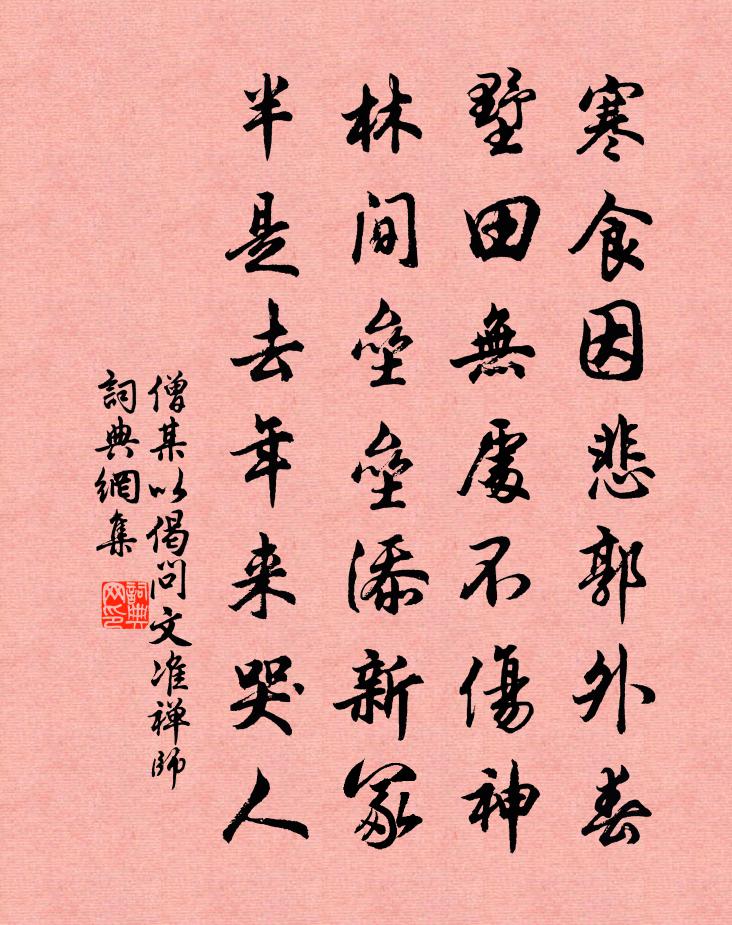 詩詞名句歷史字典書法欣賞書法字典國語詞典說文解字康熙字典古漢語字典標 題 作 者 詩 句 以偈問文準禪師作者:僧某 朝代:宋代以偈問文準禪師原文寒食因悲郭外春,墅田無處不傷神。林間壘壘添新冢,半是去年來哭人。詩詞問答問:以偈問文準禪師的作者是誰?答:僧某問:以偈問文準禪師寫於哪個朝代?答:宋代僧某以偈問文準禪師書法欣賞以偈問文準禪師書法作品詩詞推薦偈頌二百零五首釋正覺〔宋代〕百城游遍,遍詣文殊。不見其身,唯摩其頂。老眼就看青嶂骨,敗鞋行到白雲根。題豫章西山香城寺陳陶〔唐代〕十地嚴宮禮竺皇,旃檀樓閣半天香。祇園樹老梵聲小,雪嶺花香燈影長。霄漢落泉供月界,蓬壺靈鳥侍雲房。何年諸人頗有和余百梅詩者各賦一首劉克莊〔宋代〕詩至中山不可加,直將幽澹掃穠華。寧依處士墳前竹,不愛都人擔上花。老子騷魂常住世,郎君吟筆又名家。遙知次韻劉架閣和予壬寅入局詩方岳〔宋代〕入開圖籍底須箝,誰校蓬山三萬簽。有竹兩窗聊下榻,為梅一笑幾巡檐。虎頭食肉亦安用,熊掌與魚那得兼。好事戲贈怡雲平老樓鑰〔宋代〕深山中拔出閒身,鬧市里尋得靜處。相逢了白話三通,那個是末後一句。不因聞所聞而來,不為見所見而去。嶺上代人上師垣生辰仲並〔宋代〕日日衣冠金馬門,有誰出力正乾坤。來歸季子國人喜,終藉叔孫皇帝尊。鳳沼真成逢旦暮,龍樓今得問晨昏。欲知龍游道中得家信曹彥約〔宋代〕幸自居家樂,何須遣信來。聲聞先隕獲,書至尚驚猜。問仆心方定,開緘色漸回。寄言重九日,掃淨玉京台。譚賀州勉賦水仙花四絕曾豐〔宋代〕會逢青帝欲回春,先與梅花清路塵。自別其衣黃一點,示吾不敢與兄均。送鄜州關司法陳師道〔宋代〕早歲相知晚相識,抵掌回頭已陳跡。萬里從軍壯此行,一箸鱸魚留不得。夜靜關山秋月明,莫聽嶺頭流水聲。平世水龍吟·從商帥國器獵於南陽同仲澤鼎玉賦此元好問〔金代〕從商帥國器獵於南陽,同仲澤、鼎玉賦此。少年射虎名豪,等閒赤羽千夫膳。金鈴錦領,平原千騎,星流電轉。路禪人並化主寫真求贊釋正覺〔宋代〕氣清水秋,骨寒木槁。青眼柳春深,白頭山雪早。具大人相也空落不驚,有大力量也風吹便倒。個些妙處難傳,向謁遺愛王詞二首岳珂〔宋代〕大帝開江左,謀臣守四方。興邦有喬木,遺愛尚甘棠。日月扶聲烈,山川詫郁蒼。中原知極目,應慨舊封疆。南山感舊劉克莊〔宋代〕自從出腹來,未嘗識奇偉。顧瞻忽眩晃,冷汗如潑水。盧灘雜興五首錢時〔宋代〕道眼昭昭洞九流,此心天地一虛舟。浮雲得失關何事,要識梅亭對柳洲。偶然作六首王維〔唐代〕楚國有狂夫,茫然無心想。散發不冠帶,行歌南陌上。孔丘與之言,仁義莫能獎。未嘗肯問天,何事須擊壤。復笑寄題建陽馬氏晚香堂劉克莊〔宋代〕自鋤空曠汲潺湲,占斷清溪第幾灣。傍九日開侵歲晏,居千花殿覺天慳。餐英飲露平生事,遺臭流芳一念間。菊不眼兒媚王賞〔宋代〕凌寒低亞出牆枝。孤瘦雪霜姿。歲華已晚,暗香幽艷,自與時違。化工放出江頭路,沙水冷相宜。東風自此,別開喜雨張詠〔宋代〕救旱功何遠,淋漓晝復昏。風雷潛助勢,草木豈知恩。積靄消殘影,枯源漲舊痕。朗吟渾得意,重起憑前軒。同儕堅挽同游用韻為謝然終不能從也汪炎昶〔宋代〕道人結廬青山巔,如望蓬萊無渡船。石棧天梯俗千仞,流水桃花知幾年。癖佛詩持退之論,入社豈廢淵明賢。亦聞丑年冬司空圖〔唐代〕醉日昔聞都下酒,何如今喜折新茶。不堪病渴仍多慮,好向灉湖便出家。名句推薦手捻香箋憶小蓮。欲將遺恨倩誰傳。晏幾道《鷓鴣天·手捻香箋憶小蓮》 雞聲茅店月,人跡板橋霜。溫庭筠《商山早行》 相思只在夢魂中。今宵月,偏照小樓東。何大圭《小重山·綠樹鶯啼春正濃》 知音少,弦斷有誰聽。岳飛《小重山·昨夜寒蛩不住鳴》 支離東北風塵際,漂泊西南天地間。杜甫《詠懷古蹟五首·其一》 江闊雲低、斷雁叫西風。蔣捷《虞美人·聽雨》 惜衣有衣,惜食有食。馮夢龍《警世通言·卷三》 二十餘年如一夢,此身雖在堪驚。陳與義《臨江仙·夜登小閣憶洛中舊遊》 雨濕花房,風斜燕子,池閣晝長春晚。呂渭老《選冠子·雨濕花房》 小娃撐小艇,偷采白蓮回。白居易《池上》