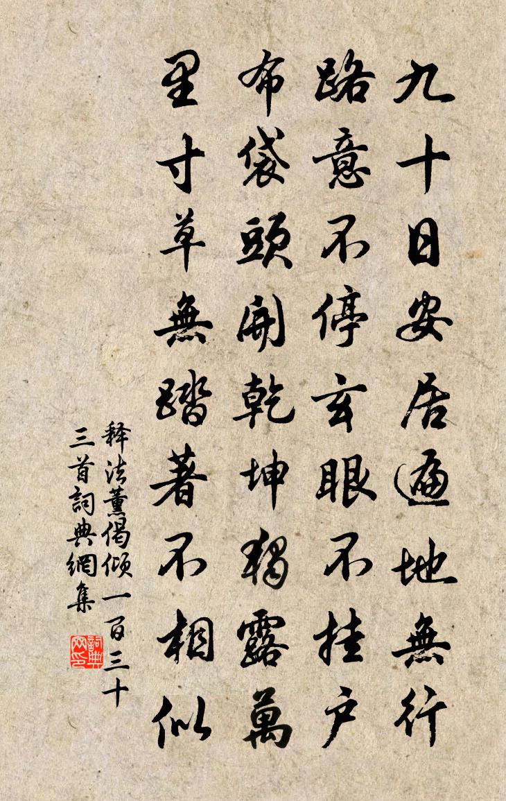 詩詞名句歷史字典書法欣賞書法字典國語詞典說文解字康熙字典古漢語字典標 題 作 者 詩 句 偈傾一百三十三首作者:釋法薰 朝代:宋代偈傾一百三十三首原文九十日安居,遍地無行路。意不停玄,眼不掛戶。布袋頭開,乾坤獨露。萬里寸草無,踏著不相似。詩詞問答問:偈傾一百三十三首的作者是誰?答:釋法薰問:偈傾一百三十三首寫於哪個朝代?答:宋代釋法薰偈傾一百三十三首書法欣賞偈傾一百三十三首書法作品詩詞推薦紅豆曲曹雪芹〔清代〕滴不盡相思血淚拋紅豆,開不完春柳春花滿畫樓。睡不穩紗窗風雨黃昏後,忘不了新愁與舊愁。咽不下玉粒金蓴噎送鄉人尹鑒登第歸劉沆〔宋代〕少年相款老相逢,鄉舉雖同遇不同。我已位塵三事後,君方名列五科中。榮登莫計名高下,宦達須由善始終。若到寄絳州李使君姚合〔唐代〕獨施清靜化,千里管橫汾。黎庶應深感,朝廷亦細聞。心期在黃老,家事是功勳。物外須仙侶,人間要使君。花多送石應之司戶歸剡以室邇人遠為韻樓鑰〔宋代〕捷徑指終南,索價譏少室。窮達豈無命,踏地胡不實。之人吏海隅,所吐百未一。夷塗澹無營,君其有終吉。祭酒芮公既歿四年門人呂某始以十詩哭之呂祖謙〔宋代〕際野塵埃撲面來,萬人蟻聚撥難開。手中杓柄長多少,蟄盡飢腸十日雷。浪淘沙·五嶺麥秋殘歐陽修〔宋代〕五嶺麥秋殘。荔子初丹。絳紗囊里水晶丸。可惜天教生處遠,不近長安。往事憶開元。妃子偏憐。一從魂散馬嵬關雜曲歌辭。甘州佚名〔唐代〕欲使傳訊息,空書意不任。寄君明月鏡,偏照故人心。憶樂季和李流謙〔宋代〕理邃不可商,造極會其天。因黥乃南面,挾璧顧屢嘆。安有鬼一車,蘊疑在目前。劃然解積凍,澌泮千丈淵。吾嘗寄上叔父夷仲三首黃庭堅〔宋代〕艱難聞道有歸音,部曲霜行璧月沉。王春正月調玉燭,使星萬里朝天心。頗令山海藏國用,乃見縣官恤民深。經心和慎思秋日同文館詩蔡肇〔宋代〕匝合青雲幕,縱橫白羽場。誰矜率爾對,吾念斐然章。名淡隃糜榜,衣飄月窟香。春風馬路疾,鞭帽散平康。破船杜甫〔唐代〕平生江海心,宿昔具扁舟。豈惟青溪上,日傍柴門游。蒼皇避亂兵,緬邈懷舊丘。鄰人亦已非,野竹獨修修。船舷早出城趙蕃〔宋代〕夜雨細無聲,朝光快作晴。空庭芳草合,遠樹鵓鳩鳴。無復知春處,閒來看水生。不唯身暫適,更覺眼增明。無心道人梁長道以偈見寄次韻釋慧空〔宋代〕法從本有何曾有,心自元無不用無。試問大雄山下虎,何如千里踏人駒。慶塗權尉三首陳元晉〔宋代〕朝憂猛虎夕長蛇,吊戰場方憶李華。自笑病來寬頻眼,那能老去植幢牙。如君政合登東閣,顧我惟堪老北涯。賓主風入松 辟兵青龍,食蘿蔔有感謝應芳〔元代〕青龍地脈土酥香。產玉似崑岡。可憐不入瑤池宴,到冰壺、風味淒涼。忽憶故園時序,春盤春酒羔羊。青絲生菜韭次韻通判張靜之郎中席上對客強至〔宋代〕一飲真須盡百杯,異鄉懷抱酒邊開。田園幾日能歸去,軒冕浮雲亦儻來。交態與誰論淡水,宦情空自學寒灰。何如次韻周公謹見寄馬廷鸞〔宋代〕涪翁雪堂仙,分誼故不疎。投之孤芳篇,投之孤芳篇,托根豈雲虛。報以蟠桃實,一嘗千載余。洗髓囁閬苑,蛇浦橋下重送嚴維劉長卿〔唐代〕秋風颯颯鳴條,風月相和寂寥。黃葉一離一別,青山暮暮朝朝。寒江漸出高岸,古木猶依斷橋。明日行人已遠,空句韋青〔唐代〕三代掌綸誥,一身能唱歌。題鳳翔府天慶觀呂岩〔唐代〕得道年來八百秋,不曾飛劍取人頭。玉皇未有天符至,且貨烏金混世流。名句推薦高齋今夜雨,獨臥武昌城。徐禎卿《在武昌作》 那堪疏雨滴黃昏。更特地、憶王孫。歐陽修《少年游·欄乾十二獨憑春》 臣心一片磁針石,不指南方不肯休。文天祥《揚子江》 血染征袍透甲紅,當陽誰敢與爭鋒!古來沖陣扶危主,只有常山趙子龍。羅貫中《三國演義·第四十一回》 生無一日之歡,死有萬世之名。列子及其弟子《列子·楊朱》 知章騎馬似乘船,眼花落井水底眠杜甫《飲中八仙歌》 人之性惡,其善者偽也。荀子《荀子·性惡》 有鳥鷙立,羽翼張。柳宗元《唐鐃歌鼓吹曲十二首·其四》 清風朗月,輒思玄度。劉義慶《世說新語·言語》 老去悲秋強自寬,興來今日盡君歡。杜甫《九日藍田崔氏莊》