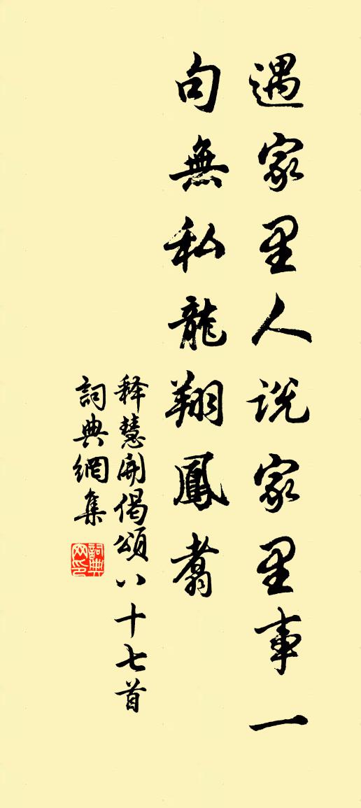 詩詞名句歷史字典書法欣賞書法字典國語詞典說文解字康熙字典古漢語字典標 題 作 者 詩 句 偈頌八十七首作者:釋慧開 朝代:宋代偈頌八十七首原文遇家裡人,說家裡事。一句無私,龍翔鳳翥。詩詞問答問:偈頌八十七首的作者是誰?答:釋慧開問:偈頌八十七首寫於哪個朝代?答:宋代釋慧開偈頌八十七首書法欣賞偈頌八十七首書法作品詩詞推薦贈白道人李流謙〔宋代〕天涯隻影隨,百結身上衣。有術沒人買,無家何處歸。自言窮亦好,未與道相違。酌汝一杯酒,醒來萬事非。再游天童山回同吳與權諸友夜集舒坦〔宋代〕太白嶄岩幾百尺,仙人一去無訊息。臨雲時復倚欄乾,獨看千峰萬峰碧。昨夜長須城裹回,報導湖上秋風來。醉園句韓縝〔宋代〕君恩未報身何有,且寄扁舟夢想中。過汜水縣虎牢關作陳維崧〔清代〕積鐵蒼然,關勢臨崖僂。嶄絕東京好門戶。挽藤蘿、月黑誰恐人行,落葉卷,聲似牢中吼虎。無情惟洛水,日夜東牽牛花陳景沂〔宋代〕牽牛易斯藥,固特取其義。安用柔軟蔓,曲為縈絆地。汝若不巧沿,何能可旁致。始者無附托,頭腦極細殢。一得和吳學士對春雪獻韋令公次韻黃滔〔唐代〕春雪下盈空,翻疑臘未窮。連天寧認月,墮地屢兼風。忽誤邊沙上,應平火嶺中。林間妨走獸,雲際落飛鴻。梁苑奉和受圖溫洛應制牛鳳及〔唐代〕八神扶玉輦,六羽警瑤谿。戒道伊川北,通津澗水西。御圖開洛匱,刻石與天齊。瑞日波中上,仙禽霧裡低。微臣松原山行七絕趙蕃〔宋代〕莫道松原路不通,擔肩樵斧往來同。老夫自是山中友,要涉崎嶇盡日中。西園堂榭落成種植畢工偶成口號十首呈參政張周麟之〔宋代〕鉤簾待燕春風裡,把酒酬花夜月前。更啟西窗納清景,煙光如畫擁斜川。滿江紅秦觀〔宋代〕風雨蕭蕭,長途上、春泥沒足。謾回首、青山無數,笑人勞碌。山下粉粉梅落粉,渡頭淼淼波搖綠。想小園、寂寞游趙園陳傅良〔宋代〕主人避客竟何之,雨過停橈落日遲。賴有畦丁曾識客,來禽花送兩三枝。雜曲歌辭妾薄命劉元淑〔唐代〕自從離別守空閨,遙聞征戰起雲梯。夜夜愁君遼海外,年年棄妾渭橋西。陽春白日照空暖,紫燕銜花向庭滿。彩鸞草堂成即事二首喻良能〔宋代〕三年留滯江之南,歸來故園寢亦甘。經理草堂唐寶應,耘耡荒徑晉陶潛。寸心自昔似南八,雙鬢只今如謝三。手栽偈頌三十四首釋如淨〔宋代〕龍生龍,鳳生鳳,指天指地獨稱尊,老鼠養兒巡屋棟。共將惡水驀頭澆,萬兩黃金也合消。四怨三愁五情詩十二首。四情曹鄴〔唐代〕檳榔自無柯,椰葉自無陰。常羨庭邊竹,生筍高於林。舊頓(頓,宿食處也。天子行幸住宿處,亦曰頓)李商隱〔唐代〕東人望幸久咨嗟,四海於今是一家。猶鎖平時舊行殿,盡無宮戶有宮鴉。自處吟邵雍〔宋代〕堯夫自處道如何,滿洛陽城都似家。不德於人焉敢異,至誠從物更無他。眼前只見羅天爵,頭上誰知換歲華。何止讀曲歌九首佚名〔南北朝〕其一柳樹得春風,一低復一昂。誰能空相憶,獨眠度三陽。其二折楊柳。百鳥啼園林,道歡不離口。其三逋髮不可貧病戲書陸游〔宋代〕頭痛涔涔齒動搖,醫驕折簡不能招。亦知客疾無根柢,少健還能起負樵。宿洞霄山中鄭起〔宋代〕入山時八月,嵐氣似深冬。岩洞生風雨,窠巢落檜松。山中九重鎖,月下一聲鍾。警省非人世,今秋得異逢。名句推薦有花堪折直須折,莫待無花空折枝。無名氏《雜詩》 凍風時作,作則飛沙走礫。袁宏道《滿井遊記》 詩成自寫紅葉,和恨寄東流。晏幾道《訴衷情·憑觴靜憶去年秋》 天地交而萬物通也,上下交而其志同也。佚名《易傳·彖傳上·泰》 異鄉物態與人殊,惟有東風舊相識歐陽修《春日西湖寄謝法曹歌》 機中錦字論長恨,樓上花枝笑獨眠。皇甫冉《春思》 照花前後鏡,花面交相映。溫庭筠《菩薩蠻·小山重疊金明滅》 毀譽從來不可聽,是非終久自分明。馮夢龍《警世通言·卷四》 喜看稻菽千重浪,遍地英雄下夕煙。 * 《七律·到韶山》 雨橫風狂三月暮,門掩黃昏,無計留春住。歐陽修《蝶戀花·庭院深深深幾許》