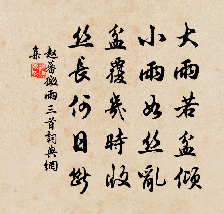 詩詞名句歷史字典書法欣賞書法字典國語詞典說文解字康熙字典古漢語字典標 題 作 者 詩 句 微雨三首作者:趙蕃 朝代:宋代微雨三首原文大雨若盆傾,小雨如絲亂。盆覆幾時收,絲長何日斷。詩詞問答問:微雨三首的作者是誰?答:趙蕃問:微雨三首寫於哪個朝代?答:宋代趙蕃微雨三首書法欣賞微雨三首書法作品詩詞推薦狄仁傑徐鈞〔宋代〕天理何曾一日亡,始終感悟為存唐。平生獨有知人鑒,身後功名付老張。贈梁國惠康公主輓歌詞二首權德輿〔唐代〕外館嬪儀貴,中參睿渥深。初笄橫白玉,盛服鏤黃金。風度簫聲遠,河低婺彩沈。夜台留冊謚,悽愴即徽音。杳靄鷓鴣天姜夔〔宋代〕輦路珠簾兩行垂,千枝銀燭舞淒淒。東風歷歷紅樓下,誰識三生杜牧之。歡正好,夜何其。明朝春過小桃枝。鼓聲浣溪沙莫將〔宋代〕歸夢悠揚見未真。繡衾恰有暗香薰。五更分得楚台春。酬淨照大師說歐陽修〔宋代〕佛說吾不學,勞師忽款關。吾方仁義急,君且水雲閒。意淡宜松鶴,詩清叩佩環。林泉苟有趣,何必市廛間。善利閣次伯仁所題趙子良畫四首裘萬頃〔宋代〕箜篌君鄉來,分明記江樹。想君詩成時,夢作白鷗去。曾季飲少卿安序堂次朱希真韻周必大〔宋代〕行藏本同塗,明哲遇輒安。畎畝道可樂,肯思負鼎乾。膰肉倘愛禮,豈遽涉汶川。大哉天地準,笑汝士女耽。丈人臥病寄閻寀李端〔唐代〕病中貪好景,強步出幽居。紫葛垂山徑,黃花繞野渠。荒林飛老鶴,敗堰過游魚。縱憶同年友,無人可寄書。句徐似道〔宋代〕化成銀地佛應喜,移下玉樓天不知。吳守置酒壯觀為登高之集因賦數語虞儔〔宋代〕九日登高作勝游,使郡攜客此遲留。天連楚觀風吹帽,木落淮山菊滿頭。何處台前猶戲馬,幾人江上不驚鷗。年來句陶弼〔宋代〕路小馬蹄高復下,村深雞唱有如無。哭閒霄上人周賀〔唐代〕林徑西風急,松枝講鈔余。凍髭亡夜剃,遺偈病時書。地燥焚身後,堂空著影初。吊來頻落淚,曾憶到吾廬。阮郎歸黃升〔宋代〕粉香吹暖透單衣。金泥雙鳳飛。閒來花下立多時。春風酒醒遲。桃葉曲,柳枝詞。芳心空自知。湘皋月冷佩聲微。自詒陸游〔宋代〕荒圃風煙入荷鉏,孤村巷陌看騎驢。少年曾縱千場醉,老境惟存一束書。作意買山雖已矣,忍慚乞米獨何歟?所欣初夏即事十二解楊萬里〔宋代〕傱教節序暗相催,曆日塵生懶看來。卻是石榴知立夏,年年此日一花開。偶成曹彥約〔宋代〕腳踏和風步步春,石魚樓上等閒人。興來衝口都成句,老去游山不動塵。李白誰知他意思,桃紅漏泄我精神。忽逢和判宗展缽之作李彌遜〔宋代〕公子曾修淨飯因,齋魚聲里司前身。累觴肯緩持螯手,一缽不勞行炙人。對鏡禪心秋澗月,放懷俗慮曉江塵。渺茫知府秘書遣帳下持新詩追路贈行,輒次韻寄上范成大〔宋代〕冷雲去仍來,凍雨落還歇。平明一篙漲,珍重送船發。端成南溪泛,寧復東堂謁。何時公三日,請澤看山笏。恩勤龍淵郭印〔宋代〕修竹不知數,雲藏小渭川。寧沼經營初,觀者日駢闐。耆舊為我語,中有一龍淵。時時見怪象,吐氣如長煙。漁人次韻杜安行嘉陵春日書事十首郭印〔宋代〕聖處沉潛久,心華始發明。絕知人事繆,頓覺世緣輕。俗薄天難定,時危道不行。折腰甘五斗,無意問弓旌。名句推薦驛路侵斜月,溪橋度曉霜。呂本中《南歌子·驛路侵斜月》 上林訊息好,鴻雁已歸來。張元乾《臨江仙·送宇文德和被召赴行在所》 不道愁人不喜聽。空階滴到明。万俟詠《長相思·雨》 撫我則後,虐我則仇。佚名《尚書·周書·泰誓》 名為虛,智者不計毀譽;利為上,愚者惟求良善。來俊臣《羅織經·制敵卷第五》 妙極生知,睿哲惟宰。精理為文,秀氣成采。劉勰《文心雕龍·徵聖》 干將為利,名聞天下,匠以治木,不如斤斧。劉向《說苑·雜言》 但夢想、一枝瀟灑,黃昏斜照水周邦彥《花犯·小石梅花》 笑十三楊柳女兒腰,東風舞。岳珂《滿江紅·小院深深》 一味學吃虧,是處事良方。王永彬《圍爐夜話·第五四則》