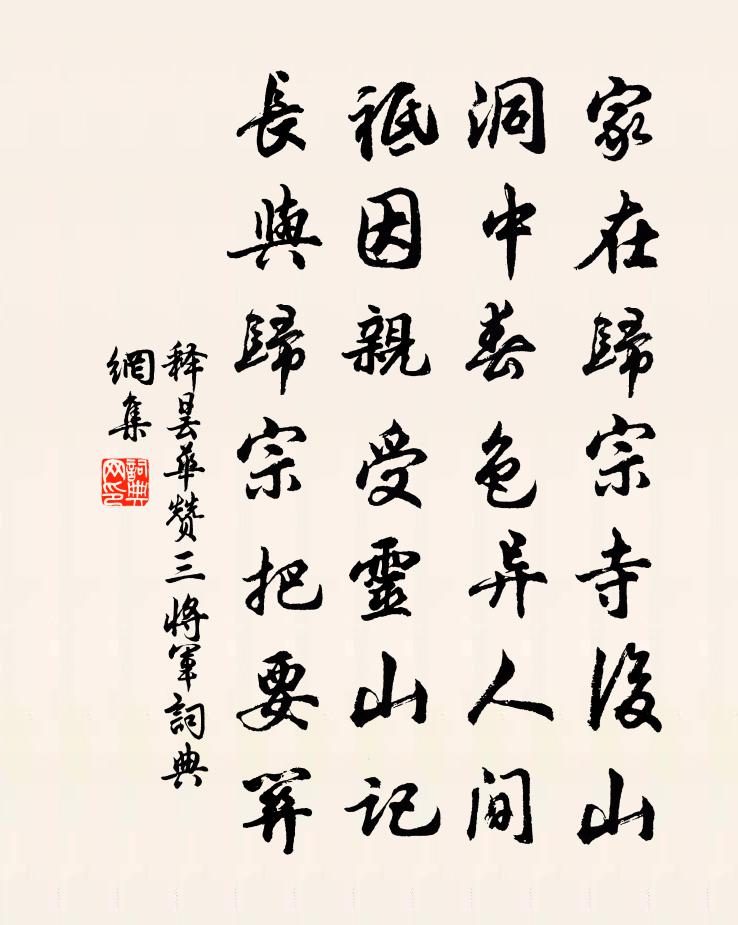 詩詞名句歷史字典書法欣賞書法字典國語詞典說文解字康熙字典古漢語字典標 題 作 者 詩 句 贊三將軍作者:釋曇華 朝代:宋代贊三將軍原文家在歸宗寺後山,洞中春色異人間。祗因親受靈山記,長與歸宗把要關。詩詞問答問:贊三將軍的作者是誰?答:釋曇華問:贊三將軍寫於哪個朝代?答:宋代釋曇華贊三將軍書法欣賞贊三將軍書法作品詩詞推薦平水陸游〔宋代〕水悍溪橋敗,沙頹野徑移。年華入詩卷,心事付筇枝。雨霽鵓鳩喜,春歸鶗鳺知。客庖消底物,麥飯薦蕝絲。後庭花破子李煜〔唐代〕玉樹後庭前,瑤草妝鏡邊。去年花不老,今年月又圓。莫教偏,和月和花,天教長少年。塞下曲·其六戎昱〔唐代〕北風凋白草,胡馬日駸駸。夜後戍樓月,秋來邊將心。鐵衣霜露重,戰馬歲年深。自有盧龍塞,煙塵飛至今。牽牛花三首楊萬里〔宋代〕莫笑渠儂不服箱,天孫為織碧雲裳。浪言偷得星橋巧,只解冰盤染茈姜。題香積寺馮時行〔宋代〕撥草詹風日,招提重訪尋。雪如將路斷,雲實助山深。密印傳初祖,英國嗣少林。我來聊借榻,靜夜聽龍吟。挽程尚書詞項安世〔宋代〕人間一日履聲藏,天上文昌落在芒。直諒無朋今魏汲,師承有法古韋康。思陵冊府嚴招騁,孝廟經帷盛表章。歲晚梅釋行海〔宋代〕難將羯鼓喚春回,一種風光傍雪開。婀娜水仙難作弟,山礬猶自欠清才。荷花白玉蟾〔宋代〕小橋划水剪荷花,兩岸西風暈晚霞。恍似瑤池初宴罷,萬妃醉臉沁鉛華。彭澤山孔武仲〔宋代〕□磯環合辟鯨虬,白水如湯動地流。崖崿盡成斤斧跡,當年誰與化工謀。題敬榮堂李柘〔宋代〕周君築室東南隅,訓友仲季勤詩書。求名於我我不語,為君邈取棠棣圖。棠棣詩成喻恩義,鄭氏箋詩寓深意。上華旅邸秋晚二首王鎡〔宋代〕夜深玉樹不啼鴉,照影殘燈客夢家。歸計未成秋又去,水邊羞見雁紅花。偈頌一百三十六首釋惟一〔宋代〕直下是,直下是。這邊那邊,滿眼滿耳。綿綿兮長存,湛湛兮不痕,擬議依前隔海門。夏日登台晚雲層疊若眾山狀伯氏令賦計因成長李彌遜〔宋代〕陽光潑血汗交頤,晚日政與長空宜。海神遊戲出湛對,風伯退聽停噓吁。初如炎官火傘動,漸若寒露冰壺欹。九烏游靈岩詩仲並〔宋代〕古寺青楓外,平湖暮靄西。亂花經雨薄,冷蝶趁人低。俯檻留連語,聽禽自在啼。風光兼客恨,樽榼故須攜。題衡山縣驛李曾伯〔宋代〕平生足始涉南方,邸舍稀疏驛路長。尚隔三州才嶺峰,更行幾日是瀟湘。家人轉苦禁秋熱,輿從常催趁曉涼。識破永遇樂(余方痛海上元夕之習,鄧中甫適和易安詞至,遂以其事吊之。)劉辰翁〔宋代〕燈舫華星,崖山矴口,官軍圍處。璧月輝圓,銀花焰短,春事遽如許。麟洲清淺,鰲山流播,愁似汨羅夜雨。還知送南卓歸京賈島〔唐代〕殘春別鏡陂,罷郡未霜髭。行李逢炎暑,山泉滿路岐。雲藏巢鶴樹,風觸囀鶯枝。三省同虛位,雙旌帶去思。入城挽陳運管安人孫氏薛嵎〔宋代〕舅家如母在,慟哭淚沾襟。平日經聲斷,茲晨佛力深。墓廬猶手構,梱則是夫箴。山上半慈竹,從知契夙心。雨中花/夜行船毛滂〔宋代〕寒浸東傾不定。更奈櫓聲催緊。堤樹朧明孤月上,暗淡移船影。舊事十年愁未醒。漸老可禁離恨。今夜誰知風露里謝人惠丹藥齊己〔唐代〕別後聞餐餌,相逢訝道情。肌膚紅色透,髭發黑光生。仙洞誰傳與,松房自煉成。常蒙遠分惠,亦覺骨毛輕。名句推薦事諸父,如事父。事諸兄,如事兄。李毓秀《弟子規·出則弟》 山桃紅花滿上頭,蜀江春水拍山流。劉禹錫《竹枝詞·山桃紅花滿上頭》 今春看又過,何日是歸年。杜甫《絕句二首》 馬上相逢無紙筆,憑君傳語報平安。岑參《逢入京使》 別君去兮何時還?且放白鹿青崖間。須行即騎訪名山。李白《夢遊天姥吟留別 / 別東魯諸公》 一念開明,反身而誠王陽明《傳習錄·卷中·答陸原靜書》 教化之行,興於學校。脫脫《金史·列傳·卷三十七》 高樓目盡欲黃昏,梧桐葉上蕭蕭雨。晏殊《踏莎行·碧海無波》 一上高城萬里愁,蒹葭楊柳似汀洲。許渾《鹹陽城東樓 / 鹹陽城西樓晚眺 / 西門》 毋意,毋必,毋固,毋我。孔子弟子《論語·子罕篇》