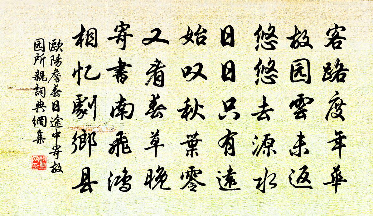 詩詞名句歷史字典書法欣賞書法字典國語詞典說文解字康熙字典古漢語字典標 題 作 者 詩 句 春日途中寄故園所親作者:歐陽詹 朝代:唐代春日途中寄故園所親原文客路度年華,故園雲未返。悠悠去源水,日日只有遠。始嘆秋葉零,又看春草晚。寄書南飛鴻,相憶劇鄉縣。詩詞問答問:春日途中寄故園所親的作者是誰?答:歐陽詹問:春日途中寄故園所親寫於哪個朝代?答:唐代問:春日途中寄故園所親是什麼體裁?答:五古歐陽詹春日途中寄故園所親書法欣賞春日途中寄故園所親書法作品注釋全唐詩:卷349-15詩詞推薦秋懷路忱〔宋代〕落日留虎壁,秋風急戌樓。高歌鬼神夜,揮涕虎狼秋。豪貴少青眼,文章多白頭。何時掛長劍,天地一扁舟。偈頌二百零五首釋正覺〔宋代〕吸盡西江向汝道,馬師不肯落荒草。三千剎海一成秋,明月珊瑚冷相照。懷哉行薛據〔唐代〕明時無廢人,廣廈無棄材。良工不我顧,有用寧自媒。懷策望君門,歲晏空遲回。秦城多車馬,日夕飛塵埃。伐鼓夏雲峰佚名〔宋代〕瓊結苞,酥凝蕊,粉心輕點胭脂。疑是素娥妝罷,玉翠低垂。化工深意,巧付與、別個標儀。怎奈向,風寒景里,句趙善湘〔宋代〕正是澄清秋雨夜,空傳玉蕊發春晴。江上晚眺董嗣杲〔宋代〕江北西風高,江南新酒熟。長笛吹梅花,月色滿營屋。清宮詞一百首岳珂〔宋代〕清曉鳴鞭下禁除,迎陽紅日耀金鋪。鋪臣賜坐宣儒館,同閱觀文鑑古圖。上西平/金人捧露盤張元乾〔宋代〕臥扁舟,聞寒雨,數佳期。又還是、輕誤仙姿。小樓夢冷,覺來應恨我歸遲。鬢雲松處,枕檀斜、露泣花枝。名利避地毗陵,寒月上孫徽使君兼寄東陽王使君三首貫休〔唐代〕一到毗陵心更勞,冷吟閒步擁雲袍。豈緣思妙塵埃少,自是風清物態高。野色疏黃連楚甸,故山奇碧隔河橋。終須鹹平親郊八首諸臣撰〔宋代〕神駕來思,鳳舉雲飛。神馭歸止,天空露晞。春夕宋祁〔宋代〕捲幔星河近,嚴城鐘漏遲。飛蟲集暗牖,棲鵲忌明枝。弱柳兼風困,高花戰露危。迴腸正無賴,仍此臥遙帷。席上代人贈別三首蘇軾〔宋代〕淒音怨亂不成歌,縱使重來奈老何。淚眼無窮似梅雨,一番勻了一番多。天上麒麟豈混塵,籠中翡翠不由身。那知火後戴表元〔宋代〕當年歌酒留連處,火後來看一惘然。傍水幾家初飲馬,入春三月未聞鵑。炎涼世事殘城樹,歌哭人聲去客船。不是和周元吉提刑席上得雨韻三首袁說友〔宋代〕湖山十里圍萬井,煙雲過盡迎朝暉。連巒得雨有餘態,歸鷺倚風無限飛。田頭無布翠縠浪,池上暗濕紅裙衣。山翁喜雨蘇轍〔宋代〕一旱經春夏已半,好雨通宵曉未收。氣爽暫令多病喜,來遲未解老葨憂。力耕僅足公家取,遺秉休違寡婦求。時向永遇樂(余方痛海上元夕之習,鄧中甫適和易安詞至,遂以其事吊之。)劉辰翁〔宋代〕燈舫華星,崖山矴口,官軍圍處。璧月輝圓,銀花焰短,春事遽如許。麟洲清淺,鰲山流播,愁似汨羅夜雨。還知春盡日戴復古〔宋代〕撚指過三月,又當春夏交。花殘蜂課蜜,林茂鳥安巢。芳草生青靄,新篁展綠稍。風騷將斷絕,誰有續弦膠。句徐某〔宋代〕至誠感格合天意,露零青松真上瑞。端午帖子許將〔宋代〕江中今日成龍鑒,苑外多年廢鷺坡。合照乾坤共作鏡,放生河海盡為池。驀山溪仲殊〔宋代〕清江平淡,疏雨和煙染。春在廣寒宮,付江梅、先開素艷。年年第一,相見越溪東,雲體態,雪精神,不把年華占名句推薦成立之難如升天,覆墜之易如燎毛。宋祁、歐陽修、范鎮、呂夏卿等《新唐書·列傳·卷八十八》 金柳搖風樹樹,系彩舫龍舟遙岸。柳永《破陣樂·露花倒影》 況復煩促倦,激烈思時康。杜甫《夏夜嘆》 獨自下層樓,樓下蛩聲怨。程垓《卜運算元·獨自上層樓》 長歌吟松風,曲盡河星稀。李白《下終南山過斛斯山人宿置酒》 不責人小過,不發人陰私,不念人舊惡洪應明《菜根譚·概論》 令公桃李滿天下,何用堂前更種花。白居易《奉和令公綠野堂種花》 舉觴酹先酒,為我驅憂煩。柳宗元《飲酒》 新年都未有芳華,二月初驚見草芽。韓愈《春雪》 邊月隨弓影,胡霜拂劍花。李白《塞下曲六首》
