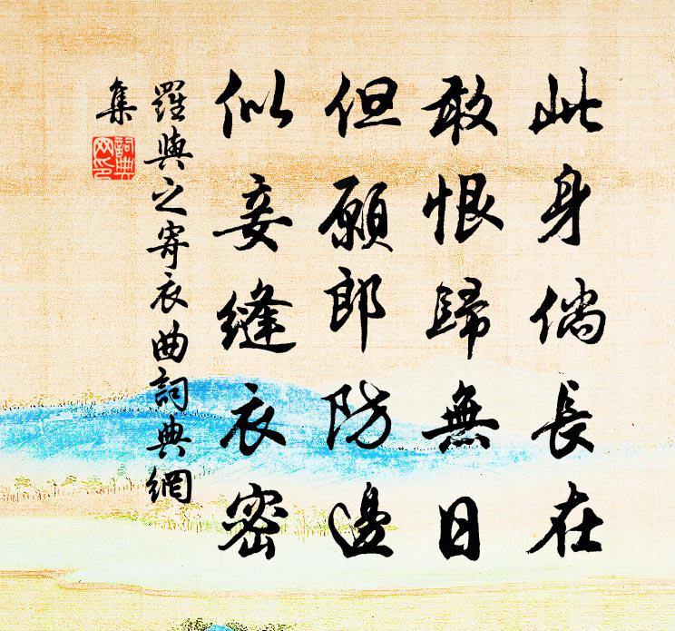 詩詞名句歷史字典書法欣賞書法字典國語詞典說文解字康熙字典古漢語字典標 題 作 者 詩 句 寄衣曲作者:羅與之 朝代:宋代寄衣曲原文此身倘長在,敢恨歸無日。但願郎防邊,似妾縫衣密。詩詞問答問:寄衣曲的作者是誰?答:羅與之問:寄衣曲寫於哪個朝代?答:宋代羅與之寄衣曲書法欣賞寄衣曲書法作品詩詞推薦過劉村江楊萬里〔宋代〕波走痕痕日,江呈岸岸秋。清流堪數石,淺涉不須舟。野菊知何喜,迎風舞未休。歸塗愁欲暮,未暮我何愁。秋夜達蕭關於鄴〔唐代〕擾擾浮梁路,人忙月自閒。去年為塞客,今夜宿蕭關。辭國幾經歲,望鄉空見山。不知江葉下,又作布衣還。即事陸游〔宋代〕穄飯流匙滑,葵羹出釜香。有時留野客,亦復餉鄰牆。老圃傳占法,行僧遺藥方。未為全絕物,終勝利名場。和李尹種葛戎昱〔唐代〕弱質人皆棄,唯君手自栽。藟含霜後竹,香惹臘前梅。擬托凌雲勢,須憑接引材。清陰如可惜,黃鳥定飛來。江氏家藏仁宗皇帝墨跡贊黃庭堅〔宋代〕昭陵仁聖,與天同功。不刻不雕,萬國文明。日月照臨,無有隱側。一滴之雨,澤及萬物。簡言易從,易言易知。送同年張正臣赴海陵幕強至〔宋代〕早年登甲選,從事又東藩。地與淮流絕,城連海氣昏。好山供健筆,暇日樂清樽。多著太平策,歸來奏帝閽。追和亡友杜仲觀古黃生曲三首之二賀鑄〔宋代〕歡歸夜何其,月照臨門別。後夜待歡來,開門但明月。喜遷鶯(守歲)史浩〔宋代〕雪消春淺。聽爆竹送窮,椒花待旦,系馬合簪,鳴鴉列炬,幾處玳筵開宴。介我百千眉壽,齊捧玉壺金盞。最奇絕鐵笛亭趙蕃〔宋代〕悵彼荊榛合,欣公杖履開。倘非人隱異,何許笛飛來。次韻外舅黃虞卿為愛山園好八首喻良能〔宋代〕為愛山園好,蕭齋竹逕通。疏簾卷雌霓,曲檻倚雄風。愛酒杜陵老,煎茶桑薴翁。菟裘真得計,蹤跡免飄蓬。詠霜二首蘇轍〔宋代〕清霜欺客病,乖夜逼窗扉。坐睡依爐暖,細聲聞葉飛。蕉絺空滿篋,砧杵旋催衣。起看庭前草,松筠未覺非。章安鎮感事孫應時〔宋代〕越嶠東南窮,連山赴滄海。章安古州宅,陵谷諒遷改。前江渺萬頃,風雨魚龍匯。嗟哉地遠絕,仿佛形勢在。憶昨句翁宏〔唐代〕萬木橫秋里,孤舟半夜猿。漏光殘井甃,缺影背山椒。風回山火斷,潮落岸冰高。題林校書花嚴寺書窗孟郊〔唐代〕隱詠不夸俗,問禪徒淨居。翻將白雲字,寄向青蓮書。擬古投松坐,就明開紙疏。昭昭南山景,獨與心相如。絕句六十四首張伯端〔宋代〕休泥丹灶費工夫,煉藥須尋偃月爐。自有天然真火用,不須柴炭及吹噓。詠史下司馬宣王陳普〔宋代〕蔣琬費禕亦如虎,孫權天險據江湖。曹年石馬來何暮,也畏平沙八陣圖。入蒲關先寄秦中故人岑參〔唐代〕秦山數點似青黛,渭上一條如白練。京師故人不可見,寄將兩眼看飛燕。第二百卷水調歌頭王罙高〔宋代〕千枝蔓仙牒,眉宇肖蒼龍。就中天賦英傑,玉磬照金鍾。滿袖春風和氣,散在苕溪霅水,謳歌頌兒童。好個廟堂樣寄棲一上人貫休〔唐代〕花塹接滄洲,陰雲閒楚丘。雨聲雖到夜,吟味不如秋。古屋藏花鴿,荒園聚亂流。無機心便是,何用話歸休。虎丘隆和尚贊釋智遇〔宋代〕柔弱丰神,骨器剛大。小喜多嗔,貴買賤賣。形影師資二十年,所以圓悟目之為睡虎者也。名句推薦心既托聲於言,言亦寄形於字劉勰《文心雕龍·練字》 異鄉物態與人殊,惟有東風舊相識歐陽修《春日西湖寄謝法曹歌》 山甫歸應疾,留侯功復成。張九齡《奉和聖制送尚書燕國公赴朔方》 三更月。中庭恰照梨花雪。賀鑄《子夜歌·三更月》 劍外忽傳收薊北,初聞涕淚滿衣裳。杜甫《聞官軍收河南河北》 一家二貴,事乃無功。韓非及後人《韓非子·揚權》 淺情終似,行雲無定,猶到夢魂中。晏幾道《少年游·離多最是》 雪裡已知春信至。寒梅點綴瓊枝膩。李清照《漁家傲·雪裡已知春信至》 桃花嫣然出籬笑,似開未開最有情。汪藻《春日·一春略無十日晴》 人之有能有為,使羞其行,而邦其昌。佚名《尚書·周書·洪範》
