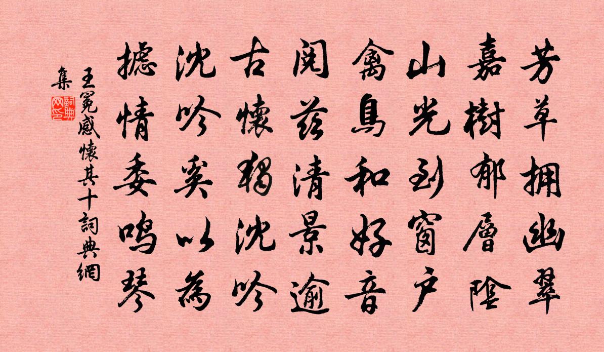 詩詞名句歷史字典書法欣賞書法字典國語詞典說文解字康熙字典古漢語字典標 題 作 者 詩 句 感懷 其十作者:王冕 朝代:元代感懷 其十原文芳草擁幽翠,嘉樹郁層陰。山光到窗戶,禽鳥和好音。閱茲清景逾,古懷獨沈吟。沈吟奚以為?攄情委鳴琴。詩詞問答問:感懷 其十的作者是誰?答:王冕問:感懷 其十寫於哪個朝代?答:元代問:感懷 其十是什麼體裁?答:五古問:王冕的名句有哪些?答:王冕名句大全王冕感懷 其十書法欣賞感懷 其十書法作品詩詞推薦夢與尤木石論史感舊七絕句劉克莊〔宋代〕金傍朱扉此帝居,舊遊恍似夢清都。可憐白首充修撰,到了藏山一字無。端硯六絕陳宓〔宋代〕少年刻志好臨池,老去方知大是痴。今日開奩聊一笑,暫時把玩似當時。虞美人(邢子友會上)陳與義〔宋代〕超然堂上閒賓主。不受人間暑。冰盤圍坐此州無。卻有一瓶和露、玉芙蕖。亭亭風骨涼生牖。消盡尊中酒。酒闌明文相生日金君卿〔宋代〕羲御三星次,堯蓂九葉開。霄躔符有道,天驥下呈才。氣恩凌諸謝,淵源過二崔。光華逢日月,騰躍契雲雷。迅步感懷二首楊公遠〔宋代〕長吟抱膝更欷噓,較著前時迥不如。世事看來巢幕燕,人生勘破上竿魚。投非所好緣工瑟,見匪相知嫩曳裾。造物贈妙潔道人釋智愚〔宋代〕妙心明潔契如如,操履分明女丈夫。龐老家風殊不二,摝籬高價許誰沽。送舒伯魯曾國藩〔清代〕神駒秉清峻,墮地凌無前。男兒志萬里,亦在華妙年。舒生吾楚俊,結髮疲丹鉛。內外承嘉蔭,托根魁斗躔。迎婦徐子融八月四夜見訪值予有出寄詩三絕和韻以陳文蔚〔宋代〕小齋雖不奉名譚,此理要須見倚參。料得歸懷明月滿,不應對影祗成三。句石延年〔宋代〕孔雀羅衫窄窄裁,珠襦微露鳳頭鞋。四祖贊釋道沖〔宋代〕抹過從前解脫坑,雙溪路上絕人行。衣盂至老無分付,逼得栽松死復生。千秋歲佚名〔宋代〕臘殘春近。江上梅開粉。一枝漏泄東君信。壽陽妝面靚,姑射冰姿瑩。似淺杏。清香試與分明認。只恐霜侵破,又永遇樂(賦梅雪)辛棄疾〔宋代〕怪底寒梅,一枝雪裡,直恁愁絕。問訊無言,依稀似妒,天上飛英白。江山一夜,瓊瑤萬頃,此段如何妒得。細看陪程太師宴柳湖歸鄭獬〔宋代〕鳴珂曉日動,畫旗春風斜。馬蹄碧玉砧,踏破黃金沙。夾路盡高柳,屹如紺璧遮。草軟藉遊人,樹暖啼嬌鴉。長湖古樂府白紵四時歌黃庭堅〔宋代〕桃李欲開風雨多,籠弦束管奈春何。風休雨靜花滿地,時節去我如驚波。少年志願不成就,日月星辰役昏晝。俟河雁盪寶冠寺趙師秀〔宋代〕行向石欄立,清寒不可雲。流來橋下水,半是洞中雲。欲住逢年盡,因吟過夜分。盪陰當絕頂,一雁未曾聞。夏日雜題陸游〔宋代〕渚蒲經雨送微馨,野鶴凌風有墮翎。歸入衡門天薄暮,清溝淺浸兩三星。送張先寧覲魏野〔宋代〕千里寧親去,青春勝老萊。苦辭留不住,堪送到方回。行色秋仍慘,離聲晚更哀。前程如有信,新雁好憑來。賦環波亭送楊校勘歸豫章迺賢〔元代〕積水敞華構,參差帶幽壑。微風動輕蘋,綠雲泛珠箔。天空夕陰斂,川回遊鱗躍。徘徊滄洲夢,露下翠衾薄。公子送金上人之水南釋正覺〔宋代〕里許由來懶荷擔,百草頭上何廉纖。半夜對月笑拍手,不見噴霜三腳蟾。劫空有句妙如許,公去誰余對眉語。後見寄東都分司白賓客姚合〔唐代〕闕下高眠過十旬,南宮印綬乞離身。詩中得意應千首,海內嫌官只一人。賓客分司真是隱,山泉繞宅豈辭貧。竹齋名句推薦驚鳥去無際,寒蛩鳴我傍。馬戴《楚江懷古三首》 出耒在明晨,山寒易霜霰。王守仁《謫居糧絕請學於農將田南山詠言寄懷》 旌旆夾兩山,黃河當中流。李白《經亂離後天恩流夜郎憶舊遊書懷贈江夏韋太守良宰》 晚來風起花如雪,飛入宮牆不見人。劉禹錫《楊柳枝詞九首》 今夕復何夕,共此燈燭光。杜甫《贈衛八處士》 怕黃昏忽地又黃昏,不銷魂怎地不銷魂。王實甫《十二月過堯民歌·別情》 必得之事,不足賴也;必諾之言,不足信也。管仲《管子·形勢》 戚姬髡髮入舂市,萬古共悲辛。李白《中山孺子妾歌》 空山松子落,幽人應未眠。韋應物《秋夜寄邱員外 / 秋夜寄丘二十二員外》 聞賢而不舉,殆;聞善而不索,殆;見能而不使,殆管仲《管子·法法》