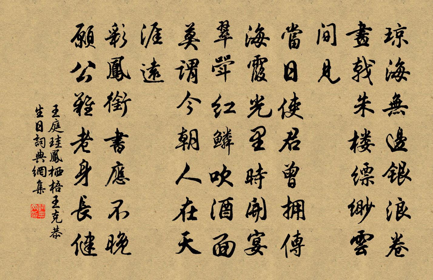 詩詞名句歷史字典書法欣賞書法字典國語詞典說文解字康熙字典古漢語字典標 題 作 者 詩 句 鳳棲梧(王克恭生日)作者:王庭珪 朝代:宋代鳳棲梧(王克恭生日)原文瓊海無邊銀浪卷。畫戟朱樓,縹緲雲間見。當日使君曾擁傳。海霞光里時開宴。翠斝紅鱗吹酒面。莫謂今朝,人在天涯遠。彩鳳銜書應不晚。願公難老身長健。詩詞問答問:鳳棲梧(王克恭生日)的作者是誰?答:王庭珪問:鳳棲梧(王克恭生日)寫於哪個朝代?答:宋代問:鳳棲梧(王克恭生日)是什麼體裁?答:詞王庭珪鳳棲梧(王克恭生日)書法欣賞鳳棲梧(王克恭生日)書法作品詩詞推薦減字木蘭花韋驤〔宋代〕帝城春媚。綠柳參天花照地。共樂昇平。處處樓台歌板聲。香輪玉鐙。馳驟芳郊爭選勝。妙舞輕謳。擾亂春風卒未昭州陶弼〔宋代〕假守昭平郡,詩情比閬仙。蟬聲風葉外,鳥影月池邊。次韻什邡馬主簿二首陳造〔宋代〕陶謝前蹤一筆追,掀天聲價舊風馳。瑞時不數九文羽,換骨疑餐三秀芝。蜚電燭岩方左席,明珠照乘忽清漪。裹創舟夜苦雨李鴻章〔清代〕一月天何醉,四山雲若痴。潮添積雨後,春到寒江遲。夢覺客衾薄,燈昏鄰笛悲。流年孤艇送,不覺鬢絲絲。榆溪道上歐陽玭〔唐代〕初日在斜溪,山雲片片低。鄉愁夢裡失,馬色望中迷。澗底淒泉氣,岩前遍綠荑。非關秦塞去,無事候晨雞。與潘文叔游稀岳四首趙蕃〔宋代〕常聞祝融峰,今日上封寺。雖孤登望眼,要逐幽遐志。蓋渠目力及,皆我腳力自。是可將無同,吾言亦聊戲。題吳氏四賢堂羅鑒〔宋代〕經濟學有用,寧與佔畢同。集英晨唱第,夕對蓬萊宮。儒林急淵源,不遣朔庭空。遺像今偉然,吾敬國子公。泛舟登弁山祥應宮之絕頂望太湖窺黃龍洞過倪程公許〔宋代〕苹浪蹴帆移別浦,筍輿邀我度遙岑。雲開辰澤水銀溢,風掠洞庭螺翠深。神井千尋龍起蟄,幽岩四面石成林。蘇仙次岳尚書韻王諶〔宋代〕細字書橫雙眼明,破窗閱盡幾陰晴。年來乾祿渾夢行,老去吟詩尚有情。謾向紙田耕石硯,斷無金縷侑銀觥。和篇虞美人 水仙邵亨貞〔元代〕幾年不見凌波步。只道乘風去。山空歲晚碧雲寒。驚見飄蕭翠*倚琅*。玉盤承露金杯勸。幾度和香*。冰霜如許會同年共樂台黃公度〔宋代〕蘭省三千士,莆陽十五人。此時鄉曲會,異日廟堂身。名塞乾坤隘,恩沾雨露新。天邊三雁遠,回首獨凝神。櫻桃樹韋莊〔唐代〕記得初生雪滿枝,和蜂和蝶帶花移。而今花落游蜂去,空作主人惆悵詩。次韻子肅秋日感興兼懷公擇二首趙蕃〔宋代〕炎冷財分覆手間,化機於爾見深慳。歸歟君釣荊溪水,已矣我耕懷玉山。幾羨修翎辭世網,絕憐駿足老天閒。區區早梅芳近/早梅芳李德載〔宋代〕殘臘里,早梅芳。春信報新陽。曉來枝上斗寒光。輕點壽陽妝。雪難欺,霜莫妒。別是一般風措。望林人意正夭饒題東岩隱者壁文同〔宋代〕青峰叢叢擁危壑,綠樹團團扶曲閣。幽人睡起漱寒泉,坐看一林山雨落。岩前火氣雜之術,澗下苔痕亂猿鶴。自憐句林仲雨〔宋代〕萬事不成嗟畫虎,一官那得似驅羊。石州慢 赴召史館,與德新丈別於岳祠西新店元好問〔金代〕系築行歌,鞍馬賦詩,年少豪舉。從渠里社浮沈,枉笑人間兒女。生平王粲,而今憔悴登樓,江山信美非吾土。天句盧並〔唐代〕地靈無俗草,岩靜有仙禽。贈月長老蘇軾〔宋代〕天形倚一笠,地水轉兩輪。五霸之所運,毫端棲一塵。功名半幅紙,兒女浪苦辛。子有折足鐺,中容五合陳。十年送李宰免監鎮之官浙西釋寶曇〔宋代〕我自歸帆急鼓催,君先一騎抗塵回。誰知北海樽罍底,親見東軒長老來。執手試聽楓葉下,打門終待藕花開。孤燈名句推薦年來腸斷秣陵舟,夢繞秦淮水上樓王士禎《秦淮雜詩二十首·其一》 狎興生疏,酒徒蕭索,不似少年時。柳永《少年游·長安古道馬遲遲》 世情看冷暖,人面逐高低。施耐庵《水滸傳·第三十七回》 恩宜自淡而濃,先濃後淡者人忘其惠洪應明《菜根譚·概論》 小人者其未得也,則憂不得;既已得之,又恐失之。是以有終身之憂,無一日之樂也。荀子《荀子·子道》 天行有常,不為堯存,不為桀亡。應之以治則吉,應之以亂則凶。荀子《荀子·天論》 綠桑高下映平川,賽罷田神笑語喧。歐陽修《田家》 故國神遊,多情應笑我,早生華髮。蘇軾《念奴嬌·赤壁懷古》 別有根芽,不是人間富貴花。納蘭性德《採桑子·塞上詠雪花》 走馬西來欲到天,辭家見月兩回圓。岑參《磧中作》
