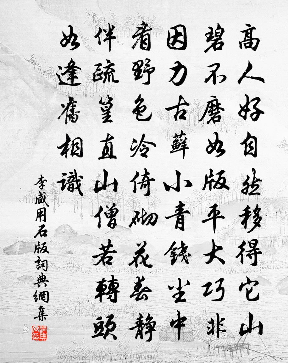 詩詞名句歷史字典書法欣賞書法字典國語詞典說文解字康熙字典古漢語字典標 題 作 者 詩 句 石版作者:李鹹用 朝代:唐代石版原文高人好自然,移得它山碧。不磨如版平,大巧非因力。古蘚小青錢,塵中看野色。冷倚砌花春,靜伴疏篁直。山僧若轉頭,如逢舊相識。詩詞問答問:石版的作者是誰?答:李鹹用問:石版寫於哪個朝代?答:唐代問:石版是什麼體裁?答:五古李鹹用石版書法欣賞石版書法作品注釋全唐詩:卷644-38詩詞推薦題幾谷客〔宋代〕蓬島三山在寸心,先生何事混凡塵。不因門外家人謹,還是無緣遇洞賓。宿淮陰作陳羽〔唐代〕秋燈點點淮陰市,楚客聯檣宿淮水。夜深風起魚鱉腥,韓信祠堂明月里。菩薩蠻程垓〔宋代〕東風有意留人住。薰風無意催人去。去住兩茫然。相逢成短緣。平生花柳笑。過後關心少。今日奈情何。為伊饒恨林間劉草廬〔宋代〕身如孤鶴在林間,百事無營只愛閒。最得意時朝曝背,未忘情處晚看山。靜拈周易從頭讀,醉把唐詩信手刪。為愛和台州衛倅曹勛〔宋代〕昔日連牆事可嘉,固應屢見雪中花。稍收帢幘山房景,欲學孤山處士家。把酒要陪高士醉,臨風未覺此心遐。銷閒賀新郎(因夢中和石林賀新郎,並戲和東坡乳燕飛華屋)吳潛〔宋代〕碧沼橫梅屋。水平堤、雙雙翠羽,引雛偷浴。倚戶無人深院靜,猶憶棋敲嫩玉。還又是、朱櫻初熟。手綰提爐香一和鄭康道春日三首李洪〔宋代〕內樂同顏子,高樓慕隱居。紫苔沿砌合,紅糝綴條疏。謾聽平戎操,閒尋種樹書。吾曹清淨業,所好在三餘。廣陵於馬上作詩曹丕〔魏晉〕觀兵臨江水。水流何湯湯。戈矛成山林。玄甲耀日光。猛將懷暴怒。膽氣正縱橫。誰雲江水廣。一葦可以航。不戰游洞霄駱安基〔宋代〕捫蘿探得雲根路,直入雲山最深處。主人心似青山間,雲亦無心自來去。寄許下前管記王侍御譚用之〔唐代〕昔年南去得娛賓,頓遜杯前共好春。蟻泛羽觴蠻酒膩,鳳銜瑤句蜀箋新。花憐游騎紅隨轡,草戀徵車碧繞輪。別後冬日寓寶惠教寺范端臣〔宋代〕觀書倦棐幾,理策開逢門。縈紆竹溪步,迤邐僧家園。雲容釀密雪,煙景收殘暾。人語野橋店,鳥鳴桑柘村。山深石台紀游舒岳祥〔宋代〕蒼山面長溪,勢若飲奔馬。層台跨其脊,萬古絕蕭灑。登臨惟茲時,朋從未雲寡。迢迢因榛莽,靡靡眺原野。白雲馬詩二十三首·其九李賀〔唐代〕飂叔去匆匆,如今不豢龍。夜來霜壓棧,駿骨折西風。送靈耀之姑蘇釋斯植〔宋代〕一身唯在道,清苦獨知君。世路終成別,山光不共分。晚天寒欲雨,春樹夜生雲。此去他鄉寺,猿聲各自聞。挽曾原伯大卿孫應時〔宋代〕夙昔吾何幸,龍門獲御公。青燈鳴夜雨,白髮對春風。契闊今安訪,蹉跎愧所蒙。源流千古意,鉛槧若為功。賀新郎(劉快軒新居)伍梅城〔宋代〕上界神仙府。誰移來、登瀛堂畔,五雲深處。江水一弓山萬朵,竹外梅花千樹。看都入、高人庭戶。南北兩廳相對對菊有作趙蕃〔宋代〕草木均是體,顧有幸不幸。故侯住瓜田,四皓臥芝嶺。譬如佳山川,何地乏幽屏。居然說終少,籍甚談箕潁。得非大笑菊史鑄〔宋代〕晚節敷華性異潰,黃冠白羽道家壯。料應識破榮枯事,獨對秋風笑一場。擬古四色詩范雲〔南北朝〕丹如桓公廟。青如夕郎門。黑如南岩{石肅}。白如東山猨。酬僧吳融〔唐代〕吾師既續惠休才,況值高秋萬象開。吟處遠峰橫落照,定中黃葉下青苔。雙林不見金蘭久,丹楚空翻組繡來。聞說名句推薦還與去年人,共藉西湖草。蘇軾《卜運算元·感舊》 遺民忍死望恢復,幾處今宵垂淚痕。陸游《關山月》 臥看滿天雲不動,不知雲與我俱東。陳與義《襄邑道中》 元宵佳節,融和天氣,次第豈無風雨。李清照《永遇樂·落日熔金》 處富貴之地,要知貧賤的痛癢;當少壯之時,須念衰老的辛酸。洪應明《菜根譚·概論》 小時不識月,呼作白玉盤。李白《古朗月行》 想雁空、北落冬深,澹墨晚天雲闊。吳文英《暗香疏影·夾鍾宮賦墨梅》 烏啼隱楊花,君醉留妾家。李白《楊叛兒》 日出入安窮?時世不與人同。佚名《日出入》 行行無別語,只道早還鄉。袁凱《京師得家書》