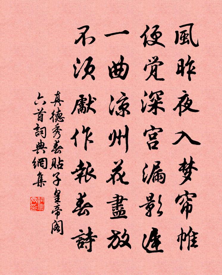 詩詞名句歷史字典書法欣賞書法字典國語詞典說文解字康熙字典古漢語字典標 題 作 者 詩 句 春貼子皇帝閣六首作者:真德秀 朝代:宋代春貼子皇帝閣六首原文風昨夜入夢簾帷,便覺深宮漏影遲。一曲涼州花盡放,不須先作報春詩。詩詞問答問:春貼子皇帝閣六首的作者是誰?答:真德秀問:春貼子皇帝閣六首寫於哪個朝代?答:宋代真德秀春貼子皇帝閣六首書法欣賞春貼子皇帝閣六首書法作品詩詞推薦詠鴈詩庾信〔南北朝〕南思洞庭水。北想鴈門關。稻粱俱可戀。飛去復飛還。蝶戀花歐陽修〔宋代〕小院深深門掩亞。寂寞珠簾,畫閣重重下。欲近禁菸微雨罷。綠楊深處鞦韆掛。傅粉狂游猶未舍。不念芳時,眉黛和馬粹老四明雜詩聊記里俗耳十首舒坦〔宋代〕澄水鋪千練,平山伏萬犀。月橋蓮棹小,春圃酒旗低。蓬島雲長在,桃源客不迷。風流未寂寞,游屐半香泥。偈頌四十二首釋祖先〔宋代〕客從南方來,報我天童老。撞破太虛空,全身入荒草。而今子細思量,令人哭不成哭笑不成笑,寥寥目斷千峰曉。偈頌一百一十七首釋紹曇〔宋代〕九旬禁足山嫌多,那更重加一月遙。不解六根門互用,蠟人鐵做也應消。采荔子十絕劉克莊〔宋代〕懷橘悲何及,芸瓜老不任。摘來先廟祭,灑淚向松陰。為牟德范題石湖遺墨意有未盡復賦五首方回〔宋代〕日長飢雀窺鐺釜,雨過跳蛙上灶爐。莫笑曬書亡玉軸,荊州還識半人無。泉聲王銍〔宋代〕娟娟山月半岩明,霜重樓台夜氣清。誰把玉琴來寫取,松風吹斷夜泉聲。晚登東樓懷子京鎮陽二首宋庠〔宋代〕洛表樓堪倚,燕陲望不窮。秋聲南送雁,寒意北隨風。斂暝關雲黑,銜規苑日紅。凋年霜霰惡,慎勿損荊叢。寒江捕魚圖蔡肇〔宋代〕海門山頭初日晴,西津渡口寒潮生。沙痕暗長島嶼沒,但見漁舟縱復橫。江煙漠漠飛鷗鷺,著底寒魚冷難捕。霜中如夢令(寄蔡堅老)趙長卿〔宋代〕居士年來病酒。肉食百不宜口。蒲合與波薐,更著同蒿蔥韭。親手。親手。分送臥龍詩友。海棠絕句陳傅良〔宋代〕淡月看花似霧中,遽呼燈燭倚花叢。夜來月色明如晝,卻向庭蕪數落紅。春日聞禽戲題寓廨蒲壽宬〔宋代〕隔牆聽幽哢,入坐春隔隔。午夢恬不成,始知身在籠。探梅陸游〔宋代〕半吐幽香特地奇,正如官柳弄黃時。放翁頗具尋梅眼,可愛南枝愛北枝。野人歌先秦無名〔先秦〕既定爾婁豬。盍歸吾艾猳。再和二首王邁〔宋代〕壯歲清源曾倦遊,今朝大郡又封侯。身安不用扶鳩杖,骨貴從知應虎頭。望闕承恩顏有喜,即家問政禮宜優,濟時對食戲詠陸游〔宋代〕一飽欣逢歲小穰,時憑野餉誑枯腸。橙黃出臼金齏美,菰脆供盤玉片香。客送輪囷霜後蟹,僧分磊落社前姜。秋來曾雲巢同相勉李玉澗不赴召戴復古〔宋代〕詔書催赴紫宸班,九奏君王乞掛冠。日暮倒行非我事,急流勇退有何難。地靈不隱金砂勝,秋水長流玉澗寒。好把和放翁社日四首社日雨方岳〔宋代〕今茲淫春霖,曾不避甲子。荷鋤做秧田,歲欠三寸水。社戊占豐登,不以此故已。徑起觳觫公,鳴蓑共於耜。奉和江沖陶居二十韻汪炎昶〔宋代〕人世紛喧囂,空山自茅棟。煩君固扃鐍,保此曲肱夢。名句推薦一去隔絕國,思歸但長嗟。李白《千里思》 滿目飛花萬點,回首故人千里,把酒沃愁腸。葛長庚《水調歌頭·江上春山遠》 命室攜童弱,良日登遠遊陶淵明《酬劉柴桑》 新啼痕壓舊啼痕,斷腸人憶斷腸人。王實甫《十二月過堯民歌·別情》 無情不似多情苦。一寸還成千萬縷。晏殊《玉樓春·春恨》 不知天外雁,何事樂長征?徐禎卿《在武昌作》 可憐白骨攢孤冢,盡為將軍覓戰功。張蠙《吊萬人冢》 青春花姊不同時。淒涼生較遲。吳文英《醉桃源·芙蓉》 惱他香閣濃睡,撩亂有啼鶯。晏殊《訴衷情·東風楊柳欲青青》 名無細而不聞,行無隱而不彰。劉向《列女傳·節義傳·周主忠妾》