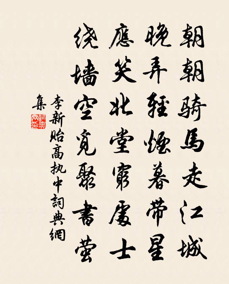 詩詞名句歷史字典書法欣賞書法字典國語詞典說文解字康熙字典古漢語字典標 題 作 者 詩 句 貽高執中作者:李新 朝代:宋代貽高執中原文朝朝騎馬走江城,晚弄輕煙暮帶星。應笑北堂窮處士,繞牆空覓聚書螢。詩詞問答問:貽高執中的作者是誰?答:李新問:貽高執中寫於哪個朝代?答:宋代李新貽高執中書法欣賞貽高執中書法作品詩詞推薦胡笳十八拍十八首王安石〔宋代〕中郎有女能傳業,顏色如花命如葉。命如葉薄將奈何,一生抱恨常咨嗟。良人持戟明光里,所慕靈妃媲簫史。空房戲答持燭之句依韻和永叔梅堯臣〔宋代〕盧仝只有赤腳婢,吏部曾吟似笑仝。紅燭射眸從結客,清歌帖耳苦憐翁。歸時雖已過寒食,芳物猶能逐暖風。但點松滋渡二首司空圖〔唐代〕步上短亭久,看回官渡船。江鄉宜晚霽,楚老語豐年。楚岫接鄉思,茫茫歸路迷。更堪斑竹驛,初聽鷓鴣啼。南歌子·似帶如絲柳溫庭筠〔唐代〕似帶如絲柳,團酥握雪花。簾卷玉鉤斜。九衢塵欲暮,逐香車。頌古八首釋道顏〔宋代〕椎鑼擂鼓轉船頭,席捲波翻喊激流。洗腳上船乘快便,順風相送下揚州。潘大臨蓮池二首張耒〔宋代〕年年酷暑軫皇慈,恩詔猶矜庶獄累。白首坐曹真有罪,清風高枕嘆無時。乘軒敢望終如鶴,用智從前不及葵。他日句舒坦〔宋代〕氣味賢中好。寄崑山李宰覓石曾幾〔宋代〕崑山定飛來,美玉山所有。山只用功深,刓畫歲時久。崢嶸出峰巒,空洞開戶牖。幾書通置郵,一片未入手。即今呈吳門王治中元俞都中參政伯大孫先人同榜方回〔宋代〕君家兩參預,漢代韋平民。留耕而耕存,惟有是以似。乃祖忠文公,補天扶國是。乃父敬愍侯,浮海將使指。直諫賀幸普濟寺應制廣宣〔唐代〕南方寶界幾由旬,八部同瞻一佛身。寺壓山河天宇靜,樓懸日月鏡光新。重城柳暗東風曙,復道花明上苑春。向晚水龍吟 簡周晴川教授會飲和韻,其兄晴山,朱唏顏〔元代〕一春剩雨慳晴,悶來閒檢床頭歷。農占候應,今朝甲子,初開霽色。草徑泥融,柳橋風勁,尚妨吟策。有幽軒水淨對竹李中〔唐代〕懶穿幽徑沖鳴鳥,忍踏清陰損翠苔。不似閉門欹枕聽,秋聲如雨入軒來。題慶全庵謝枋得〔宋代〕長松落落多奇節,冬無雪霜夏無熱。根頭更有千歲苓,知誰可語長生訣。壞屋王建〔唐代〕官家有壞屋,居者願離得。苟或幸其遷,回循任傾側。若當君子住,一日還修飾。必使換榱楹,先須木端直。永令贈初心相士黎廷瑞〔宋代〕王識九江黥,侯許平陽奴。臭奇恆互出,冠屨奄相逾。此說偶奇驗,人人生妄圖。曷不返吾照,湛然觀本初。天地和孔密州五絕 東欄梨花蘇軾〔宋代〕梨花淡白柳深青,柳絮飛時花滿城。惆悵東欄二株雪,人生看得幾清明。送建安鄭尉劉克莊〔宋代〕路人能說尉,壹似建溪清。寸錦不攜去,束書相伴行。無心乾舉將,有面見賢兄。應笑東陽令,淹留白髮生。寧宗朝享三十五首真宗〔宋代〕[黃鐘為宮]鹹英備樂,簋度列斝。詩歌安世,聲葉皇雅。翠旗羽蓋,雲車風馬。神其來兮,以燕以下。對新家醞玩自種花白居易〔唐代〕香麴親看造,芳叢手自栽。迎春報酒熟,垂老看花開。紅蠟半含萼,綠油新醱醅。玲瓏五六樹,瀲灩兩三杯。恐有晚泊漢江渡劉畋〔唐代〕末秋雲木輕,蓮折晚香清。雨下侵苔色,雲涼出浪聲。疊帆依岸盡,微照夾堤明。渡吏已頭白,遙知客姓名。名句推薦萬里人南去,三春雁北飛。韋承慶《南中詠雁詩》 樓船夜雪瓜洲渡,鐵馬秋風大散關。陸游《書憤五首·其一》 人事有代謝,往來成古今。孟浩然《與諸子登峴山》 學者不患才之不贍,而患志之不立。徐幹《中論·上卷·治學》 一手獨拍,雖疾無聲。韓非及後人《韓非子·功名》 歲寒,然後知松柏之後凋也。孔子弟子《論語·子罕篇》 良辰當五日,偕老祝千年。權德輿《端午日禮部宿齋有衣服彩結之貺以詩還答》 一人興善,萬人可激宋濂、王褘《元史·列傳·卷五十六》 細雨魚兒出,微風燕子斜。杜甫《水檻遣心二首》 遠夢歸侵曉,家書到隔年。杜牧《旅宿》