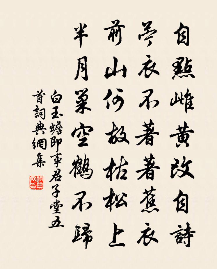 詩詞名句歷史字典書法欣賞書法字典國語詞典說文解字康熙字典古漢語字典標 題 作 者 詩 句 即事君子堂五首作者:白玉蟾 朝代:宋代即事君子堂五首原文自點雌黃改自詩,苧衣不著著蕉衣。前山何故枯松上,半月巢空鶴不歸。詩詞問答問:即事君子堂五首的作者是誰?答:白玉蟾問:即事君子堂五首寫於哪個朝代?答:宋代問:即事君子堂五首是什麼體裁?答:七絕白玉蟾即事君子堂五首書法欣賞即事君子堂五首書法作品詩詞推薦鐵塔寺劉克莊〔宋代〕細認苔間字,方知鑄塔時。不因兵廢壞,似有物扶持。古殿人開少,深窗日上遲。僧言明受事,相對各攢眉。壽林中書曾豐〔宋代〕岩岩風采百工師,龍馬精神海鶴姿。宮女猶傳洞簫賦,都人今作袞衣詩。幸逢堯舜癸賢日,正是皋夔相國時。聖主論俗十二首劉子翬〔宋代〕西村人漸歸,撐柱燒殘屋。東村但蒿萊,死者無人哭。昔茲號富穰,被禍尤殘酷。二三里中豪,喪亂身為僇。遺骸張孝基仁愛方勺〔宋代〕許昌士人張孝基,娶同里富人女。富人惟一子,不肖,斥逐去。富人病且死,盡以家財付孝基。孝基與治後事如禮蒙齋習庵皆有詩在慈雲閣沈端憲又有記文刻石陳著〔宋代〕習老懞翁兩達尊,借他僧偈說慈雲。一番入寺一感愴,細讀古碑端憲文。辭酒賀鑄〔宋代〕魯酒一樽薄,吾愁萬斛多。塵埃斬馬劍,涕泗飯牛歌。髀肉生如許,顛毛黑幾何。功名可復道,身世兩蹉跎。又次銛朴翁韻四首陳造〔宋代〕婪酣貴宦鮫綃帳,贔屭功名泊浪沙。誰似朴翁隨分過,曹溪水煮趙州茶。淳熙四年二月既望靜江守臣張某奉詔勸農於郊張栻〔宋代〕嗟爾父老,教之孝悌。孰無父母,與其同氣。行路難孟雲卿〔唐代〕君不見高山萬仞連蒼旻,天長地久成埃塵。君不見長松百尺多勁節,狂風暴雨終摧折。古今何世無聖賢,吾愛伯陽問春二首楊萬里〔宋代〕今歲春歸不小心,合將訊息報園林。蘇公堤上千株柳,二月猶慳半縷金。寄王謙仲周子充丈趙蕃〔宋代〕吳蜀三分地,沅湘合水流。魚鰕今島嶼,蘭茝舊汀洲。逾月雨連晝,莫春風送秋。濕桑蠶餓死,壞種穀漂浮。弊屋桓佚名〔先秦〕綏萬邦,屢豐年。天命匪解,桓桓武王。保有厥士,於以四方,克定厥家。於昭於天,皇以間之。玲瓏四犯高觀國〔宋代〕水外花輕陰,做花弄得飛雲花,吹斷晴絮。駐馬橋西,還系舊時芳樹。不見翠陌尋春,每問著、小花無語。恨燕鶯憶李白辛棄疾〔宋代〕當年宮殿賦昭陽,豈信人間過夜郎。明月入江依舊好,青山埋骨至今香。不尋飯顆山頭伴,卻趁汨羅江上狂。定要贈鹽城諸友陳造〔宋代〕泉脈不通海濱土,人家轆轤上鹹鹵。新粳本自玉為爛,薦熟便如猩血煮。初嘗已嘆失香味,久食更憂戕肺腑。城西水龍吟(夜宿化城,得張安國長短句,戲用其韻)韓元吉〔宋代〕五溪深鎖煙霞,定知不是人間世。軒然九老,排雲一笑,蒼顏相對。星斗垂空,月華隨步,酒醒無寐。□廣寒已近寄贈知洋州李澤屯田魏野〔宋代〕一種分符命最優,翠微深處是洋州。白雲繞座疑山相,紅旆隨行表郡侯。禪定僧疑陪靜話,音聲鳥稱伴閒游。更輸太上虛皇黃庭經句法十篇壽趙師程珌〔宋代〕向也何幸識仙翁,玉栗春明盛德容,又常一再見阿戎。神情穎異機生鋒,公家流慶無終窮。菩薩蠻(餞田莘老)侯置〔宋代〕江風漠漠寒山碧。孤鴻聲里霜花白。畫舸且停橈。有人魂欲銷。相從能幾日。總是天涯客。尺素好頻裁。休言無雁一念劉克莊〔宋代〕一念才萌帝已臨,豈容纖芥自欺心。夜猶養氣操存熟,晨偶科頭警懼深。跌宕少曾希管葛,斂藏晚欲學柴參。小窗名句推薦江山易改,稟性難移。馮夢龍《醒世恆言·卷三十五》 人有短,切莫揭。人有私,切莫說。李毓秀《弟子規·泛愛眾》 何處相逢,登寶釵樓,訪銅雀台。劉克莊《沁園春·夢孚若》 學之染人,甚於丹青。房玄齡《晉書·列傳·第五十二章》 當年得意如芳草。日日春風好。辛棄疾《虞美人·賦虞美人草》 天闕象緯逼,雲臥衣裳冷杜甫《游龍門奉先寺》 終罷斯結廬,慕陶直可庶。韋應物《東郊》 得天下英才而教育之。孟子《孟子·盡心章句上·第二十節》 秦中已久烏頭白,卻是君王未備知。李商隱《人慾》 春潮帶雨晚來急,野渡無人舟自橫。韋應物《滁州西澗》