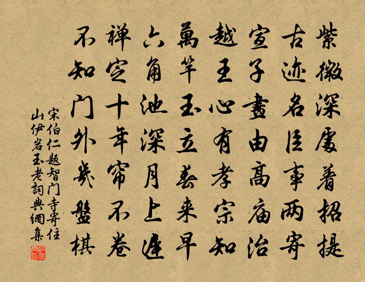 詩詞名句歷史字典書法欣賞書法字典國語詞典說文解字康熙字典古漢語字典標 題 作 者 詩 句 題智門寺寄住山伊岩玉老作者:宋伯仁 朝代:宋代題智門寺寄住山伊岩玉老原文紫微深處著招提,古蹟名臣事兩寄。宣子畫由高廟治,越王心有孝宗知。萬竿玉立春來早,六角池深月上遲。禪定十年簾不捲,不知門外幾盤棋。詩詞問答問:題智門寺寄住山伊岩玉老的作者是誰?答:宋伯仁問:題智門寺寄住山伊岩玉老寫於哪個朝代?答:宋代宋伯仁題智門寺寄住山伊岩玉老書法欣賞題智門寺寄住山伊岩玉老書法作品詩詞推薦將入匡山宿韓判官宅貫休〔唐代〕一宿蘭堂接上才,白雪歸去幾裴回。黛青峰朵孤吟後,雪白猿兒必寄來。簾卷茶煙縈墮葉,月明棋子落深苔。明朝謝趙周錫制乾和篇袁說友〔宋代〕甫擲拋磚句,俄驚翻水成。源泉夸敏思,擊缽噤無聲。白玉雕鐫巧,黃金煅煉精。我慚非腹稿,不復敢披呈。郊廟歌辭享太廟樂章大定舞李回〔唐代〕受天明命,敷佑下土。化時以儉,衛文以武。氛消夷夏,俗臻往古。億萬斯年,形於律呂。蟾宮曲·贈名姬玉蓮徐再思〔元代〕荊山一片玲瓏。分付馮夷,捧出波中。白羽香寒,瓊衣露重,粉面冰融。知造化私加密寵,為風流洗盡嬌紅。月對蒲萄岳珂〔宋代〕當年博望奏邊功,異種曾攜苜蓿同。摘乳那煩挏馬令,引須聊愜好龍公。頗憐漢地離宮在,未許涼州酒瓮空。回紇舟中戲書陸游〔宋代〕平生萬事付之天,百折猶能氣浩然。試問軟塵金絡馬,何如柔櫓月侵船?英雄到底是痴絕,富貴但能妨醉眠。三百陝下投姚諫議李頻〔唐代〕舊業在東鄙,西遊從楚荊。風雷幾夜坐,山水半年行。夢永秋燈滅,吟孤曉露明。前心若不遂,有恥卻歸耕。偈頌六十七首釋原妙〔宋代〕巴陵設忌三轉語,西峰單單只一句。{上浙下耳},逢人切忌錯舉。郡以閔雨勞民曹顏若春有禱於仰山塔誠念感格程公許〔宋代〕鵲尾爐香半未灰,古潭瞥地撼風雷。腳踏車陟降固勞止,萬壑喧豗亦壯哉。高廩正須端策驗,應門已報送詩來。憂時將至敘州范成大〔宋代〕亂山滿平野,漲水豪大川。仄徑無轍跡,疏林有炊煙。山農旦燒畲,蠻賈暑荷氈。窮鄉足荒怪,打鼓催我船。跋劉溪翁題韓府詩趙蕃〔宋代〕何人詠出韓家府,是我建陽劉叔通。盡道唐人工樂府,罕能褒貶似渠工。遣興七首李流謙〔宋代〕水竹扶疎地,前人卜築勞。草荒煩仆豎,果熟戒兒曹。穴蟻生涯陋,冥鴻境界高。洗心觀萬物,至理寓秋毫。東庵陳舜俞〔宋代〕已憐門巷林中出,況復軒窗水畔開。冷淡山光明枕簟,動搖波影上樽罍。坐看天際孤舟失,慣見桑陰五馬來。長恨田鶴司空曙〔唐代〕散下渚田中,隱見菰蒲里。哀鳴自相應,欲作凌風起。女冠子·其一李珣〔唐代〕星高月午,丹桂青松深處。醮壇開,金磬敲清露,珠幢立翠苔。步虛聲縹緲,想像思徘徊。曉天歸去路,指蓬萊。和元守重陽和韻郭印〔宋代〕空樽獨把送斜陽,九日何憂酒中傷。客里吟情尤寞寞,夢中歸意亦茫茫。楓飄丹葉隨流水,菊吐黃花犯早霜。惟有夜意陸游〔宋代〕孤夢初回夜氣清,世塵掃盡覺心平。月沉洲渚漁歌遠,人語比鄰績火明。獨汲寒泉鳴細綆,靜聽漏鼓下高城。悠然送段覺歸東陽兼寄竇使君許渾〔唐代〕山水引歸路,陸郎從此諳。秋茶垂露細,寒菊帶霜甘。台倚烏龍嶺,樓侵白雁潭。沈公如借問,心在浙河南。和張民朝謁建隆寺二次用寫望試筆韻梅堯臣〔宋代〕躍馬侵星去,啼鴉未出巢。春裘風易裂,從騎鐙相敲。紅日雙行柳,黃金一抹梢。乾坤功力大,默誦易中爻。郊廟歌辭。享惠昭太子廟樂章。亞獻終獻裴度〔唐代〕重輪始發祥,齒胄方興學。冥然升紫府,鏗爾薦清樂。奠斝致馨香,在庭紛羽籥。禮成神既醉,仿佛緱山鶴。名句推薦霜天秋曉,正紫塞故壘,黃雲衰草。蔡挺《喜遷鶯·霜天秋曉》 聞誅一夫紂矣,未聞弒君也。孟子《孟子·梁惠王章句下·第八節》 床前明月光,疑是地上霜。李白《靜夜思》 竹塢無塵水檻清,相思迢遞隔重城。李商隱《宿駱氏亭寄懷崔雍崔袞》 楊柳回塘,鴛鴦別浦。綠萍漲斷蓮舟路。賀鑄《芳心苦·楊柳回塘》 悽惻近長沙,地僻秋將盡楊冠卿《卜運算元·秋晚集杜句吊賈傅》 門外平橋連柳堤,歸來晚樹黃鶯啼。溫庭筠《春洲曲》 獸爐沉水煙,翠沼殘花片。一行寫入相思傳。張可久《塞鴻秋·春情》 只有天在上,更無山與齊寇準《詠華山》 苦心中常得悅心之趣;得意時便一失意之悲。洪應明《菜根譚·概論》