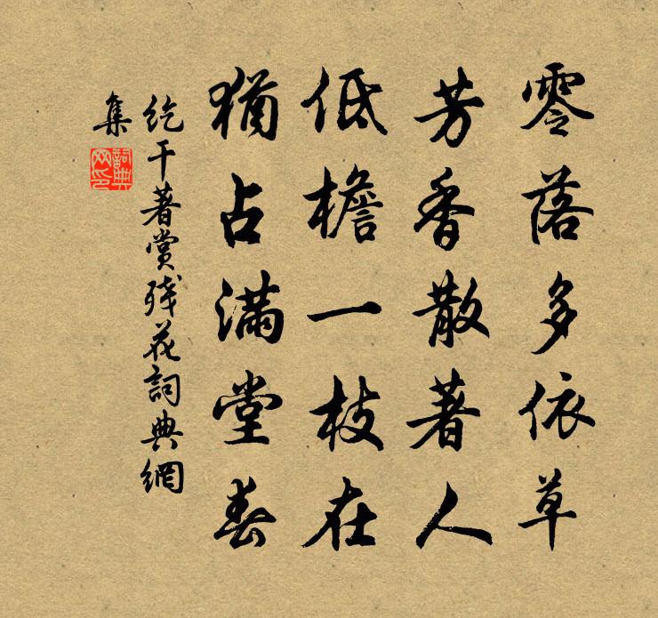 詩詞名句歷史字典書法欣賞書法字典國語詞典說文解字康熙字典古漢語字典標 題 作 者 詩 句 賞殘花作者:紇乾著 朝代:唐代賞殘花原文零落多依草,芳香散著人。低檐一枝在,猶占滿堂春。詩詞問答問:賞殘花的作者是誰?答:紇乾著問:賞殘花寫於哪個朝代?答:唐代紇乾著賞殘花書法欣賞賞殘花書法作品注釋全唐詩:卷769-22詩詞推薦會王侍中座上詩孫楚〔魏晉〕顯允君子。時惟英邵。玄貂左移。華蟬增曜。晚春方岳〔宋代〕倦眼忽驚三月暮,杜鵑啼處綠陰多。春今且住為佳耳,雨不能晴將奈何。紅紫只催人老大,蒼浪莫怨命蹉跎。貧中月夜觀雪三首楊萬里〔宋代〕仙人愛雪不嫌寒,挈月來看夜不眠。游遍瓊樓霜欲曉,卻將玉鏡掛青天。游山五題贈青林庵主余靖〔宋代〕佛性深如海,中邊見各異。道在有無間,語論皆兒戲。幾多名利僧,妄習諸家氣。貪嗔尚纏牽,生滅何由離。三世行叟權秋掾比回正老以詩寄之因次韻奉和強至〔宋代〕郡獄乏掾屬,君才盛府依。犴牢煩暫掌,鸞枳復卑飛。盡室輕裝去,新吟滿篋歸。風流傷別處,粉淚灑紅衣。內閣春帖子夏竦〔宋代〕銀箭初傳暖律延,微和漸扇物華妍。彩幡紅鏤宜春字,永奉宸慈億萬年。雨後釋行海〔宋代〕雨過山林近暮鍾,片懷寂寂對孤松。夜深笛怨梅花落,月照人間睡正濃。滿庭芳(西園月夜賞花)毛滂〔宋代〕馬絡青絲,障開紅錦,小晴初斷香塵。芳醪滿載,持燭有佳人。飛蓋西園午夜,花梢冷、雲月朧明。折還惜,留花送王識游洛陽宋祁〔宋代〕上京漫客刺,西道摻離裾。天倚呼嵩外,川橫斗穀餘。敝襓琴晦軫,行笈簡聯書。卻見槐花候,期君促計車。游慈雲陳著〔宋代〕微吟歡人步,不覺到禪關。植杖若痕上,敲門竹影閒。樹高風韻葉,人靜鳥呼山。安得長留此,分僧一半閒。送梁伯暘歸括蒼三首劉宰〔宋代〕城關美少年,三五事遊冶。明璫燭綺疏,寶香籠舞樹。一朝黃金盡,帷蓋羞狗馬。短檠有真樂,行矣遴取捨。憶王孫(集句數首,甚婉娩,情至可觀)汪元量〔宋代〕漢家宮闕動高秋。人自傷心水自流。今日晴明獨上樓。恨悠悠。白盡梨園子弟頭。次韻和長文禖祀郊外見寄並呈韓子華梅堯臣〔宋代〕鵓鴣知雨在桑中,雄逐雌飛自不同。胡粉未生輕蝶白,燕脂先綻野櫻紅。高高樹里鞦韆月,獵獵牆頭蓓蕾風。曉下寓言九首王安石〔宋代〕婚喪孰不供,貸錢免爾縈。耕收孰不給,傾粟助之生。物贏我收之,物窘出使營。後世不務此,區區挫兼併。後漢門魏博妻周曇〔唐代〕蘿掛青松是所依,松凋蘿更改何枝。操刀必割腕可斷,磐石徒堅心不移。河滿子·正是破瓜年紀和凝〔唐代〕正是破瓜年紀,含情慣得人饒。桃李精神鸚鵡舌,可堪虛度良宵。卻愛藍羅裙子,羨他長束纖腰。熙寧蜡祭十三首佚名〔宋代〕禮文備矣,肅肅無嘩。金石諧節,圭壁光華。粢以告禮,本以告嘉。錫茲福祉,以澤幽遐。蕭相公宅遇自遠禪師,有感而贈白居易〔唐代〕宦途堪笑不勝悲,昨日榮華今日衰。轉似秋蓬無定處,長於春夢幾多時。半頭白髮慚蕭相,滿面紅塵問遠師。應是入喬口(長沙北界)杜甫〔唐代〕漠漠舊京遠,遲遲歸路賒。殘年傍水國,落日對春華。樹蜜早蜂亂,江泥輕燕斜。賈生骨已朽,悽惻近長沙。題金牛洞范成大〔宋代〕故鄉江吳多好山,筍輿篾舫相窮年。春風吹入江南陌,疊障雙峰如舊識。聞道金牛更孱顏,古來鐵鎖高難攀。自從名句推薦憐不可存,憐人者無證其忠。友宜重懲,援友者惟其害。來俊臣《羅織經·問罪卷第十》 金風飄菊蕊,玉露泫萸枝。韋安石《奉和九日幸臨渭亭登高應制得枝字》 蜀江水碧蜀山青,聖主朝朝暮暮情。白居易《長恨歌》 停車數行日,勸酒問回期。王建《送人游塞》 酒逢知己飲,詩向會人吟。佚名《增廣賢文·上集》 公生明,偏生暗荀子《荀子·不苟》 借得山東煙水寨,來買鳳城春色施耐庵《念奴嬌·天南地北》 正不容邪,邪復妒正。曹雪芹《紅樓夢·第二回》 公子王孫逐後塵,綠珠垂淚滴羅巾。崔郊《贈去婢》 秋至搗羅紈,淚滿未能開。江淹《悼室人》