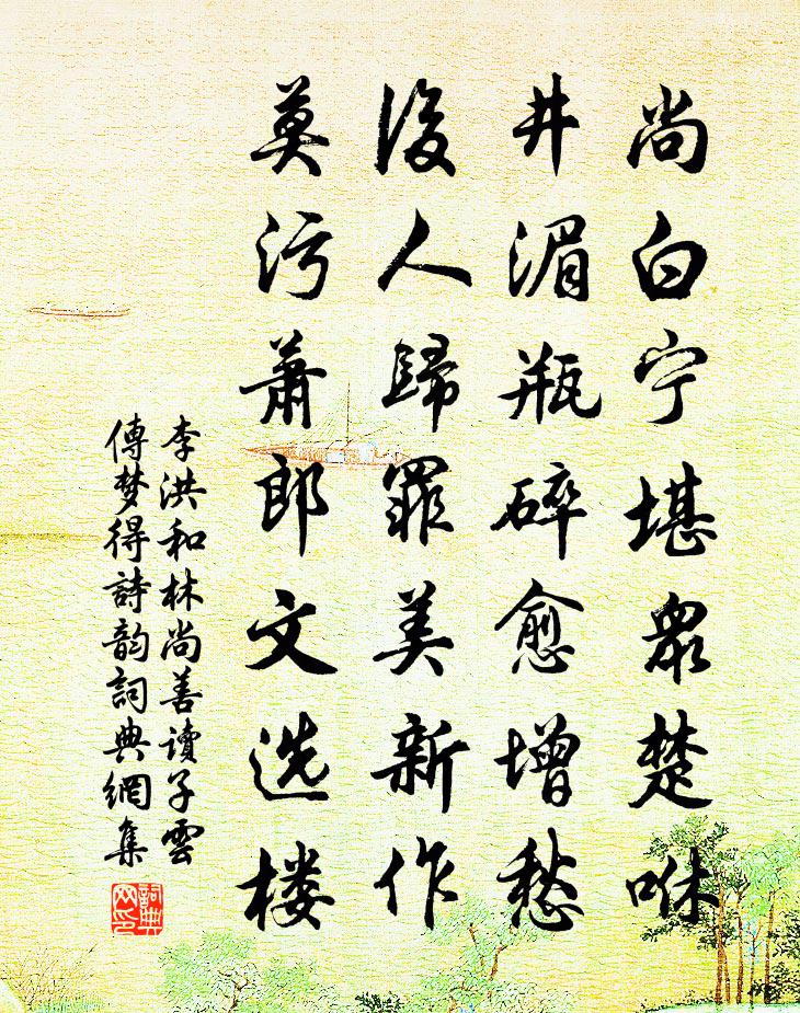 詩詞名句歷史字典書法欣賞書法字典國語詞典說文解字康熙字典古漢語字典標 題 作 者 詩 句 和林尚善讀子云傳夢得詩韻作者:李洪 朝代:宋代和林尚善讀子云傳夢得詩韻原文尚白寧堪眾楚咻,井湄瓶碎愈增愁。後人歸罪美新作,莫污蕭郎文選樓。詩詞問答問:和林尚善讀子云傳夢得詩韻的作者是誰?答:李洪問:和林尚善讀子云傳夢得詩韻寫於哪個朝代?答:宋代李洪和林尚善讀子云傳夢得詩韻書法欣賞和林尚善讀子云傳夢得詩韻書法作品詩詞推薦和徐發承議懷歸李復〔宋代〕駸駸長路倦羸驂,搔首飛塵苦戰酣。猿過故山驚曉帳,苔生舊釣暗秋潭。土風膏潤田耕熟,物意清幽井汲甘。一別題金州西園九首松壇姚合〔唐代〕盤盤松上蓋,下覆青石壇。月中零露垂,日出露尚漙。山翁稱絕境,海橋無所觀。幽草二首張耒〔宋代〕幽草堂軒秀,盆池遇雨添。新晴雀哺子,永日燕穿簾。世事休驚目,閒中且養恬。黃公有美酒,時得醉厭厭。岳陽早霽南樓張說〔唐代〕山水佳新霽,南樓玩初旭。夜來枝半紅,雨後洲全綠。四運相終始,萬形紛代續。適臨青草湖,再變黃鶯曲。地穴歸彭城韓愈〔唐代〕天下兵又動,太平竟何時。訏謨者誰子,無乃失所宜。前年關中旱,閭井多死飢。去歲東郡水,生民為流屍。上天風入松趙聞禮〔宋代〕麴塵風雨亂春晴。花重寒輕。珠簾卷上還重下,怕東風、吹散歌聲。棋倦杯頻晝永,粉香花艷清明。十分無處著閒閒居雜詠三十二首禮陳淳〔宋代〕禮者人之門,節文自中根。所主一以敬,出入無不存。季冬桃花鄭俠〔宋代〕真宰終無妄,元和豈有偏。如何洞天蕊,開向雪花前。游騎雖然闃,紅芳亦自鮮。惟應祝融氏,偷竊玩餘年。聽友人談蜀道事樂雷發〔宋代〕石棧天梯盪戰塵,誰驅哨馬滿峨岷。盡看烏石為君子,誰問沙蟲化小人。韃豈豈應強兀朮,蜀材正自欠吳璘。細吟送龐子肅沈亞之〔唐代〕三年遊宦也迷津,馬困長安九陌塵。都作無成不歸去,古來妻嫂笑蘇秦。筠溪喻良能〔宋代〕精舍仍幽處,深溪冒淺篁。寒聲隨浪起,翠影共流長。斷岸通秋月,虛檐受夏涼。雖無杜陵韻,絕勝贊公房。道上雜花盛開王之道〔宋代〕涓涓流水雨晴初,夾道山花簇彩輿。千騎不辭迎候遠,物情春意竟何如。憶王子正王冕〔元代〕雨重楊花落,春深杜宇悲。交情惟有我,朋友更言誰?雲冷東山屐,塵埋北海碑。夜來茅屋下,酸淚為君垂。明堂慶成詩文天祥〔宋代〕清廟嚴更夜未央,珠星璧月璨殊光。香飄黃道移天步,燭引紅紗轉殿廊。祼薦交神諸室醉,駿奔執豆庶羞芳。都人病減逢春,期白二十二、辛大不至十韻元稹〔唐代〕病與窮陰退,春從血氣生。寒膚漸舒展,陽脈乍虛盈。就日臨階坐,扶床履地行。問人知面瘦,祝鳥願身輕。風暖豐年行陸游〔宋代〕秋風蕭蕭秋日薄,築場獲稻方竭作。志士雖懷晚歲悲,農家自足豐年樂。撥醅白酒喚鄰曲,啄黍黃雞初束縛。長魚玉闌乾朱彝尊〔清代〕玉闌乾外秋蛩語,一架豆花清露。蘭湯浴罷納新涼,攜縴手夜深爾汝。綠窗人遠紗空護,網暗塵,蛛絲無數。舊時洛中寓居張詠〔宋代〕風塵籍籍伴窮迷,旋賃高齋洛水西。綠樹不知遊子恨,夕陽閒引杜鵑啼。苔侵舊徑來人絕,花滿南軒翠竹低。自笑挽考亭陳居士二首劉宰〔宋代〕八十人稀有,君年又過之。康強由學力,孝友自天資。瑞世芝三秀,承家桂一枝。萬山圍隴首,昌大看他時。漁家傲葛勝仲〔宋代〕疊疊雲山供四顧。簿書忙裡偷閒去。心遠地偏陶令趣。登覽處。清幽疑是斜川路。野蔌溪毛供飲具。此身甘被煙霞名句推薦飲酒莫辭醉,醉多適不愁。高適《淇上送韋司倉往滑台》 為誰醉倒為誰醒,到今猶恨輕離別。呂本中《踏莎行·雪似梅花》 蘇小門前柳萬條,毿毿金線拂平橋。溫庭筠《楊柳八首·其三》 形勝三分國,波流萬世功。潘大臨《江間作四首·其三》 莎衫筠笠。正是村村農務急。盧炳《減字木蘭花·莎衫筠笠》 綠池落盡紅蕖卻,荷葉猶開最小錢。楊萬里《秋涼晚步》 麥浪翻晴風颭柳,已過傷春候。納蘭性德《四和香·麥浪翻晴風颭柳》 來是春初,去是春將老。曾允元《點絳唇·一夜東風》 善謀生者,但令長幼內外,勤修恆業,而不必富其家王永彬《圍爐夜話·第九則》 木從繩則正,後從諫則聖。佚名《尚書·商書·說命上》