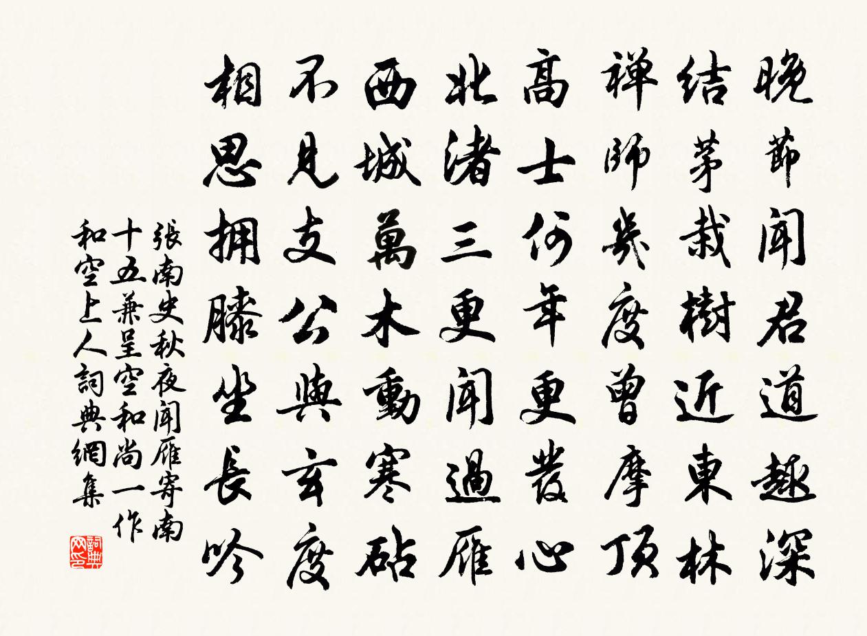 詩詞名句歷史字典書法欣賞書法字典國語詞典說文解字康熙字典古漢語字典標 題 作 者 詩 句 秋夜聞雁寄南十五兼呈空和尚(一作和空上人)作者:張南史 朝代:唐代原文晚節聞君道趣深,結茅栽樹近東林。禪師幾度曾摩頂,高士何年更發心。北渚三更聞過雁,西城萬木動寒砧。不見支公與玄度,相思擁膝坐長吟。詩詞問答問:《秋夜聞雁寄南十五兼呈空和尚(一作和空上人)》的作者是誰?答:張南史問:該詩寫於哪個朝代?答:唐代書法欣賞秋夜聞雁寄南十五兼呈空和尚(一作和空上人)書法作品注釋全唐詩:卷296_21詩詞推薦臘梅鄭剛中〔宋代〕縞衣仙子變新裝,淺染春前一樣黃。不肯皎然爭臘雪,只將孤艷付幽香。高士詠龐德公吳筠〔唐代〕龐公棲鹿門,絕跡遠城市。超然風塵外,自得丘壑美。耕鑿勤厥躬,耘鋤課妻子。保茲永無患,軒冕何足紀。期友人阻雨不至魚玄機〔唐代〕雁魚空有信,雞黍恨無期。閉戶方籠月,褰簾已散絲。近泉鳴砌畔,遠浪漲江湄。鄉思悲秋客,愁吟五字詩。偈頌一百二十三首釋普度〔宋代〕 * 眼,破沙盆。零敲碎打,不直分文。一一銀山鐵壁,一一電掣雷奔。醉吟軒鄧肅〔宋代〕淵明句法古無有,頭上幅巾供漉酒。李白豪篇驚倒人,舉目望天不計斗。二子風流不可追,公作幽軒為喚回。長鯨答陳述古二首蘇軾〔宋代〕漫說山東第二州,棗林桑泊負春遊。城西亦有紅千葉,人老簪花卻自羞。小桃破萼未勝春,羅綺叢中第一人。聞道和商守雪霽對月邵雍〔宋代〕雪滿群山霜滿庭,光寒月碾一輪輕。羈懷殊少向時樂,皓彩空多此夜明。竹近簾櫳饒碎影,風涵台榭有餘清。恨無昔柳柳州作永州山水諸記泉石之狀如在目前茲張嵲〔宋代〕山磎犖确冒荒筠,石溜涓涓盡日聞。微水寒來渾見底,峽山雪後欲侵雲。深溪春動梅爭發,絕壑林高日易曛。應似對月了殘經贊釋紹曇〔宋代〕是甚經,欠翻譯。用盡心,看不出,月掛松梢,煙籠蘚石。摸魚兒(紫雲山房擬賦蓴)王易簡〔宋代〕怪鮫宮、水晶簾卷,冰痕初斷香縷。澄波盪槳人初到,三十六陂煙雨。春又去。伴點點荷錢,隱約吳中路。相思日寄四明山子施肩吾〔唐代〕高棲只在千峰里,塵世望君那得知。長憶去年風雨夜,向君窗下聽猿時。長安春日曹松〔唐代〕浩浩看花晨,六街揚遠塵。塵中一丈日,誰是晏眠人。御柳舞著水,野鶯啼破春。徒雲多失意,猶自惜離秦。送趙主簿之任惠安寇準〔宋代〕蕭蕭征騎立長亭,遙指天涯萬里程。尊酒欲闌人慾別,夕陽絲管盡離聲。初夏同孝叔游朱氏園張伯玉〔宋代〕凍醪盧橘助登臨,此地相逢舊有音。石潤自知梅信蚤,池方應為玉流深。詩成千色排清砌,話久花枝轉夕陰。不見別江上一二友生譚用之〔唐代〕國風千載務重華,須逐浮雲背若耶。無地可歸堪種玉,有天教上且乘槎。白綸巾卸蘇門月,紅錦衣裁御苑花。他日贈樗野白玉蟾〔宋代〕不嘆勞生行路難,自憐雲水許間關。別來五載多懷感,待有尺書無往還。微白一鉤天外月,淡青數點海邊山。襟情寓江州分司衙隨筆五首董嗣杲〔宋代〕掀簾掣吾肘,偶牽衫袖裂。腐縷積汗垢,欲紉向誰說。忙起易衣披。不暇惜疊雪。試新反相惱,轉覺身觸熱。天涼道中即事姚勉〔宋代〕橘累金印楓錦衣,夾路相照生光輝。我非買臣與季子,但有菊佩芳菲菲。如夢令沈端節〔宋代〕雨後輕寒天氣,玉酒中人小醉。乍報一番秋,晚簟清涼如水。忺睡,忺睡,窗在芭蕉葉底。師警維那請贊釋崇岳〔宋代〕冤有頭,債有主。鱉鼻蛇,白額虎。活捉生擒,當陽直舉,發楊須是千鈞弩。名句推薦片雲天共遠,永夜月同孤。杜甫《江漢》 何處飛來林間鵲,蹙踏松梢微雪。辛棄疾《賀新郎·把酒長亭說》 試玉要燒三日滿,辨材須待七年期。白居易《放言五首·其三》 枕上詩書閒處好,門前風景雨來佳。李清照《攤破浣溪沙·病起蕭蕭兩鬢華》 三年不上門,當親也不親。吳承恩《西遊記·第四十回》 雨橫風狂三月暮,門掩黃昏,無計留春住。歐陽修《蝶戀花·庭院深深深幾許》 枕前淚共階前雨,隔個窗兒滴到明。聶勝瓊《鷓鴣天·別情》 人犯一苟字,便不能振;人犯一俗字,便不可醫。王永彬《圍爐夜話·第一二九則》 醉別復幾日,登臨遍池台。李白《魯郡東石門送杜二甫》 燕子欲歸時節,高樓昨夜西風。晏殊《破陣子·燕子欲歸時節》
