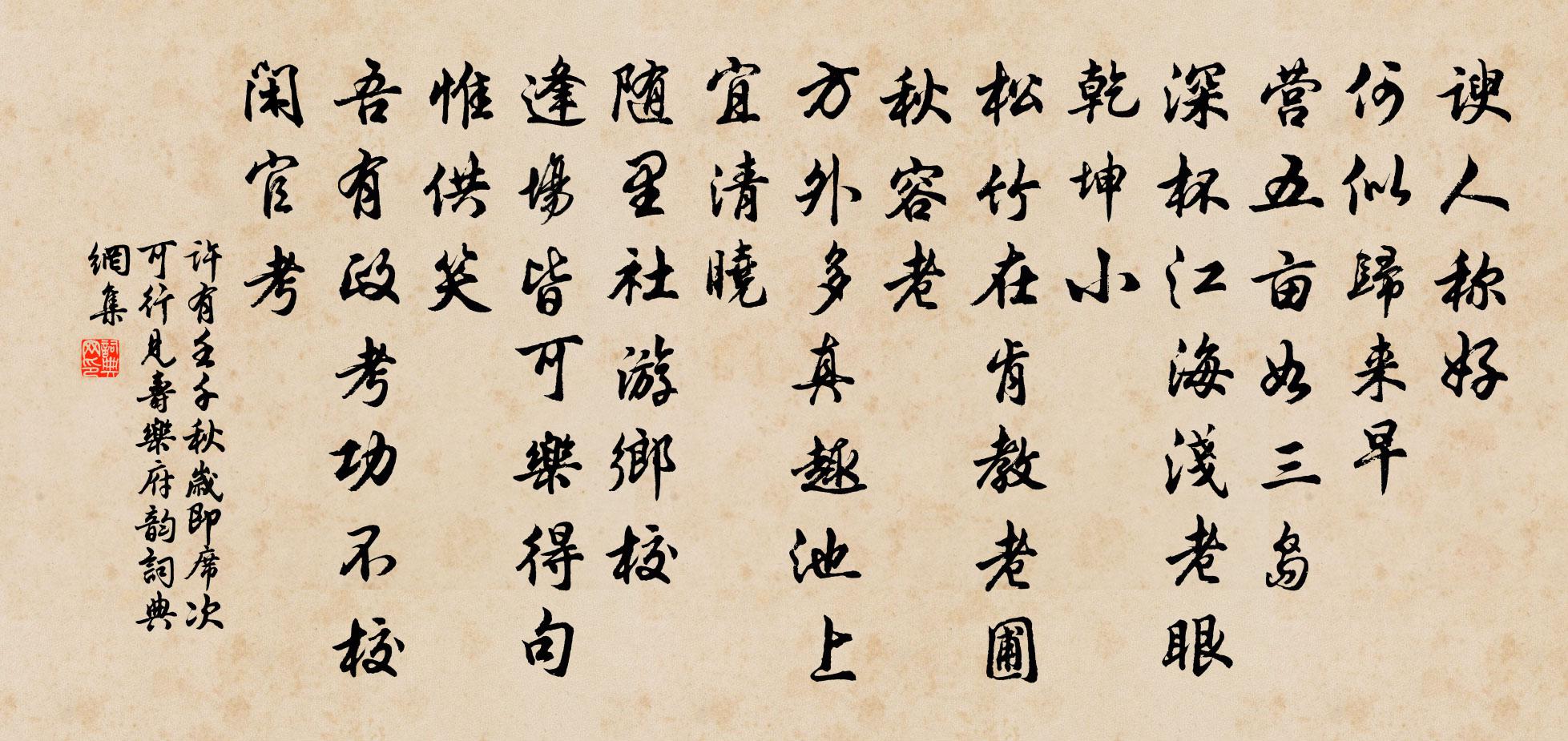 詩詞名句歷史字典書法欣賞書法字典國語詞典說文解字康熙字典古漢語字典標 題 作 者 詩 句 千秋歲 即席次可行見壽樂府韻作者:許有壬 朝代:元代原文諛人稱好。何似歸來早。營五畝,如三島。深杯江海淺,老眼乾坤小。松竹在,肯教老圃秋容老。方外多真趣,池上宜清曉。隨里社,游鄉校。逢場皆可樂,得句惟供笑。吾有政,考功不校閒官考。詩詞問答問:《千秋歲 即席次可行見壽樂府韻》的作者是誰?答:許有壬問:該詩寫於哪個朝代?答:元代問:該詩是什麼體裁?答:詞書法欣賞千秋歲 即席次可行見壽樂府韻書法作品詩詞推薦清平樂韋莊〔唐代〕瑣窗春暮,滿地梨花雨。君不歸來情又去,紅淚散沾金縷。夢魂飛斷煙波,傷心不奈春何。空把金針獨坐,鴛鴦愁和朱簿對雪韓維〔宋代〕公堂寂無事,默會擁重裘。余霰竹上集,寒風日颼颼。哀鴻不停徵,好鳥鳴相求。君能於此時,為我發新謳。上言池上雨過宋庠〔宋代〕蕭蕭殘雨過橫塘,翠幕生波入坐涼。淡日映雲微透腳,暖風翻葉更成光。牆頭早杏青丸小,水面新蒲紺尾長。魚鳥題城南書院三十四詠張栻〔宋代〕莫道閒中一事無,閒中事業有工夫。閉門清晝讀書罷,掃地焚香到日晡。詩贈寶應禪老溢公強至〔宋代〕或來丈室問師禪,師解臨機示意筌。雲在虛空寧有礙,月當陰晦亦長圓。更無餘事牽塵想,猶有能醫結世緣。瓶錫題館中直舍壁陸游〔宋代〕幾年憔悴去清班,敢辱君恩誤賜環。但厭軟麈隨倦馬,不愁弱水隔神山。下帷寢飯群書里,退食雍容眾雋間。行矣丙辰歲八月中於下[氵巽]田舍獲陶淵明〔魏晉〕貧居依稼穡,戮力東林隈。不言春作苦,常恐負所懷。司田眷有秋,寄聲與我諧。飢者歡初飽,束帶候鳴雞。揚楫雲門過何山陸游〔宋代〕漠漠稻滿陂,蒙蒙雨沾衣。林花落更新,溪鳥止復飛。我作山中行,十日未擬歸。思酒過野店,念茶叩僧扉,眠枕詩招南陽秀才林逋〔宋代〕莫因公薦偶失意,便擬飄蓬作旅人。志壯任存題柱事,病多爭向倚門親。危堤柳色休傷別,上苑杏花長自春。況有孫景赴懷寧尉宋祁〔宋代〕一行為吏日,千里背淮人。蘭助朝昏膳,絲垂宛轉綸。雲容侵驛曉,江熊引帆春。靜治龍舒邑,氂生盜向秦。途中一絕杜牧〔唐代〕鏡中絲髮悲來慣,衣上塵痕拂漸難。惆悵江湖釣竿手,卻遮西日向長安。瓶中淮陽紅牡丹落盡有嘆三首楊萬里〔宋代〕只愁風雨妒花枝,翦入瓷瓶養卻伊。更下重簾深閉合,忽然花落又關誰。詩挽史魏公釋寶曇〔宋代〕一語回天力,終年困五丁。時方相司馬,吾不愧玄齡。遞奏逾金石,斯文粲日星。幡然霖雨手,猶帶御爐馨。謫居黔南十首黃庭堅〔宋代〕老色日上面,歡悰日去心。今既不如昔,後當不如今。秦淮張榘〔宋代〕往在秦淮問六朝,江樓只有女 * 。昭陽太極無行路,歲歲鵝黃土柳條。挽趙少卿劉黻〔宋代〕班升金掌擢清才,苦欲歸田挽不回。浙右尚思菩薩去,荊南空望使星來。苔侵書閣秋山靜,竹鎖吟庭夜鶴哀。路出頌古一百首釋智愚〔宋代〕收放隨時雖有淮,出門入戶恐難論。長安路子君須到,莫向深村草里蹲。蓬萊閣閒望寫懷張伯玉〔宋代〕越絕開 * ,姚虞啟後昆。昔聞句允霸,今作帝王藩。地得東南重,山侔岳瀆尊。平湖來萬壑,翠袖列千門。市井二賀詩佚名〔唐代〕學行可師賀德基,文質彬彬賀德仁。贈顧令文為宜春令詩陸機〔魏晉〕藹藹芳林。有集惟岳。亹亹明哲。在彼鴻族。淪心渾無。游精大朴。播我徽猷。□彼振玉。彼玉之振。光於厥潛。名句推薦春江潮水連海平,海上明月共潮生。張若虛《春江花月夜》 檳榔無柯,椰葉無陰。左思《三都賦》 春日載陽,有鳴倉庚。佚名《七月》 我所居兮,青埂之峰。我所游兮,鴻蒙太空。誰與我游?兮,吾誰與從。曹雪芹《紅樓夢·第一百二十回》 夫以奢侈之君,御好淫僻之民,欲國無亂,不可得也。墨子《墨子·06章 辭過》 山遠天高煙水寒,相思楓葉丹。李煜《長相思·一重山》 何時更杯酒,再得論心胸。李白《魏郡別蘇明府因北游》 轉眼葵肌初繡,又紅欹欄角。陳維崧《好事近·分手柳花天》 日暮蒼山遠,天寒白屋貧。劉長卿《逢雪宿芙蓉山主人》 聞道故林相識多,罷官昨日今如何李頎《送陳章甫》