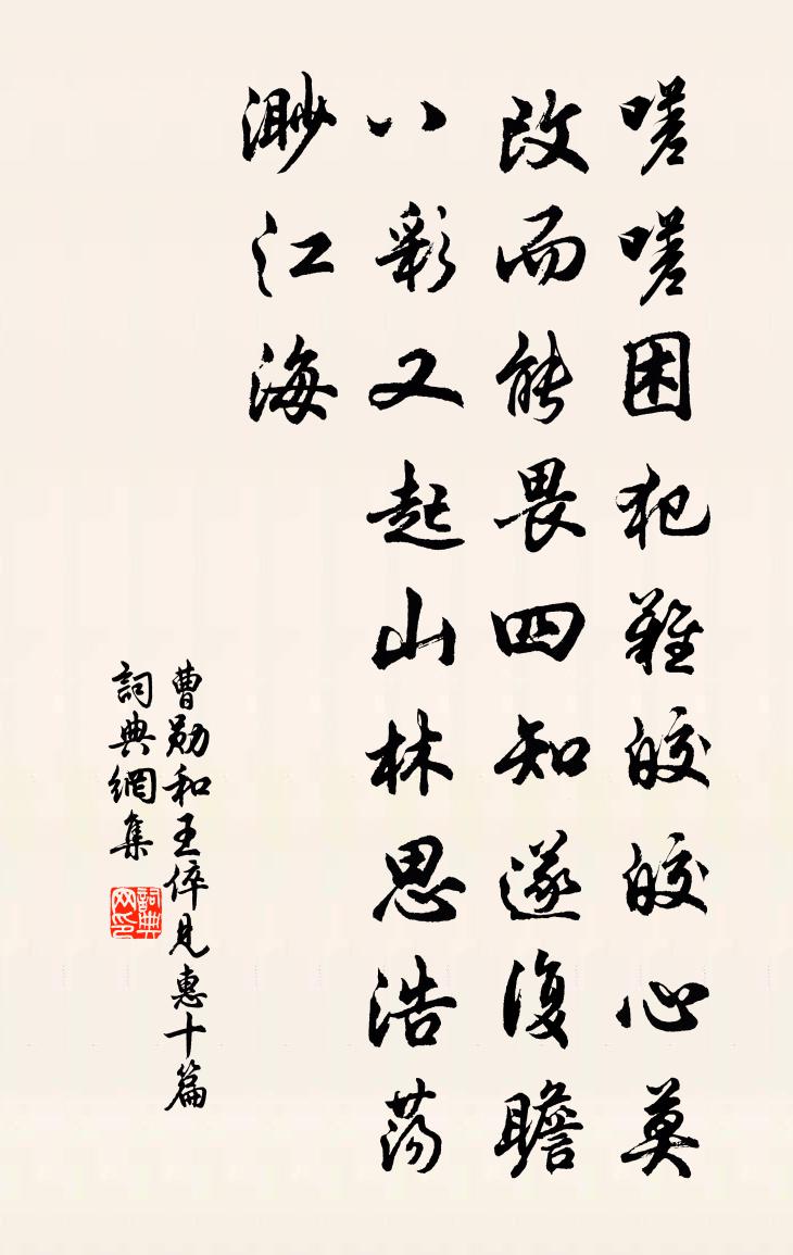 詩詞名句歷史字典書法欣賞書法字典國語詞典說文解字康熙字典古漢語字典標 題 作 者 詩 句 和王倅見惠十篇作者:曹勛 朝代:宋代和王倅見惠十篇原文嗟嗟困犯難,皎皎心莫改。而能畏四知,遂復瞻八彩。又起山林思,浩蕩渺江海。詩詞問答問:和王倅見惠十篇的作者是誰?答:曹勛問:和王倅見惠十篇寫於哪個朝代?答:宋代曹勛和王倅見惠十篇書法欣賞和王倅見惠十篇書法作品詩詞推薦寒食節有感汪莘〔宋代〕江南兒女尚多情,為愛芳晨載酒行。幸自不知惆悵事,鳥啼花落是清明。謝潘端叔惠紅梅樓鑰〔宋代〕不學江頭玉樹寒,壽陽紅粉舊妝殘。嬋娟可是慙隨俗,莫作金沙鎖骨看。孟子大勇陳普〔宋代〕大勇非由血氣充,性情義命本來公。至剛至直純天道,逆理其間何所容。已亥雜詩 213龔自珍〔清代〕此閣宜供天人師,檀香三尺博士為。阮公施香孰施字,徐公字似蕭梁碑。寓言六首王安石〔宋代〕父母子所養,子肥父母充。欲富搉其子,惜哉術之窮。霸者擅一方,窘彼足自豐。四海皆吾家,奈何不知農。賢者之孝二百四十首劉苞林同〔宋代〕扇席更溫枕,古人誰與同。一心奉二母,自是勝黃童。次喻景山韻陳宓〔宋代〕眼前兒輩謾嘈嘈,癢處憑誰著手搔。堪恨紫陽雙鬢白,閉門吮筆自箋騷。當塗界寄裴宣州張九齡〔唐代〕故人宣城守,亦在江南偏。如何分虎竹,相與間山川。章綬胡為者,形骸非自然。含情津渡闊,倚望脰空延。遠近鵲橋仙 壽王趙公時八十張野〔元代〕鸞台鐘呂,瀛州房杜。榮貴康寧天付。三公勳業四朝臣,不勝似、*溪漁父。朝廷尊敬,君王知遇。香滿春風玉樹【商調】梧葉兒_佩解螭文玉李致遠〔元代〕佩解螭文玉,衾閒鴛序錦,釵折鳳頭金。夜雨留荷淚,西風吼樹音,秋月弄桐陰,梅花謝別來到今。徐少卿輓詞樓鑰〔宋代〕聖主一言寤,長淮千耦耕。山川皆在目,草木尚知名。盍被腰金寵,徒為攬轡行。諸郎襲餘慶,定自不慙卿。山茶花二首陶弼〔宋代〕淺為玉茗深都勝,大曰山茶小樹紅。名譽漫多朋援少,年年身在雪霜中。別趙信州趙蕃〔宋代〕拍拍桃花水,輕輕蓮葉舟。生憎沖野馬,失喜見沙鷗。漫浪端如此,饑寒信有不。未探懷玉蘊,且訪九華幽。離京後作七首張耒〔宋代〕苹芷江邊已五年,厭聞風浪打船舷。南風蕭艾荒涼野,時望高丘一慨然。落花十絕馮時行〔宋代〕瘦筇隨意步晴沙,困臥江頭野老家。桃李盈門春寂寂,鶯驚睡覺一床花。悲哉孔子沒王安石〔宋代〕悲哉孔子沒,千歲無麒麟。蚩蚩盡鉏商,此物誰能珍。漢武得一角,燔烹誣鬼神。更以鑄黃金,傳夸後世人。金陵雜興二百首蘇泂〔宋代〕琪樹三朝種已成,綠陰回合囀宮鶯。傷心輦路生春草,不見素娥花底行。十三日吉祥探花蔡襄〔宋代〕花未全開月未圓,看花候月思依然。明知花月無情物,若使多情更可憐。滿江紅(席上答葉憲)洪适〔宋代〕百計留春,春不住、愁懷填溢。爭如對、寶梳壓鬢,翠環鋪碧。紫綬金章都是夢,雲廬花塢如何覓。勸金杯、淺笑十日徐璣〔宋代〕十日清溪路,新春細雨天。綠波隨棹起,白鳥望舟眠。麥秀初如草,雲濃半是煙。明朝可遵陸,還憶此江邊。名句推薦玉樓天半起笙歌,風送宮嬪笑語和。顧況《宮詞五首·其二》 北極懷明主,南溟作逐臣。宋之問《途中寒食題黃梅臨江驛寄崔融》 雪後燕瑤池,人間第一枝。趙令畤《菩薩蠻·春風試手先梅蕊》 漢臣曾此作縲囚,茹血衣毛十九秋。汪遵《詠北海》 別離在今晨,見爾當何秋。韋應物《送楊氏女》 坐到三更盡,歸仍萬里賒。戎昱《桂州臘夜》 受人之託,忠人之事馮夢龍《警世通言·卷三十四》 得言不可以不察。數傳而白為黑,黑為白。呂不韋《呂氏春秋·論·慎行論》 蓮朝開而暮合,至不能合,則將落矣王永彬《圍爐夜話·第六九則》 惟有今宵,皓彩皆同普。郭應祥《醉落魄·丙寅中秋》
