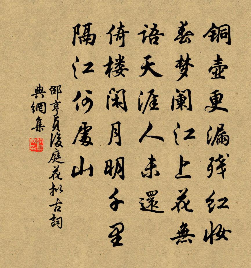 銅壺更漏殘,紅妝春夢闌,江上花無語,天涯人未還。倚樓閒,月明千里,隔江何處山。