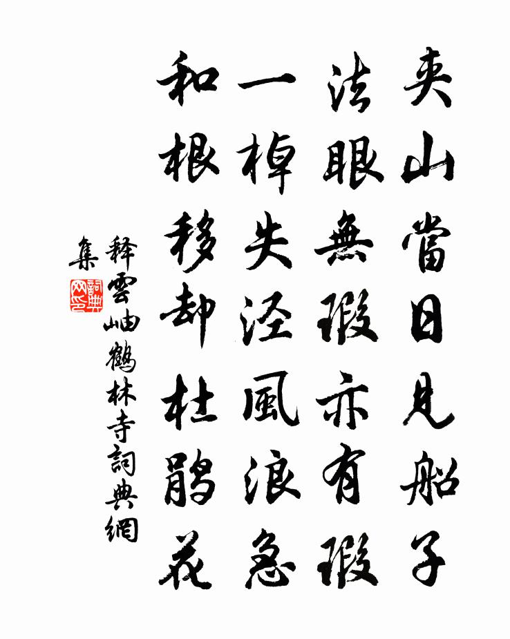 詩詞名句歷史字典書法欣賞書法字典國語詞典說文解字康熙字典古漢語字典標 題 作 者 詩 句 鶴林寺作者:釋雲岫 朝代:宋代鶴林寺原文夾山當日見船子,法眼無瑕亦有瑕。一棹失涇風浪急,和根移卻杜鵑花。詩詞問答問:鶴林寺的作者是誰?答:釋雲岫問:鶴林寺寫於哪個朝代?答:宋代釋雲岫鶴林寺書法欣賞鶴林寺書法作品詩詞推薦立春日邂逅周文顯於子暢兄許飲酒論文歡有餘趙蕃〔宋代〕文字追秦漢,簞瓢保賤貧。延英空側席,下里老斯人。傾蓋寧嗟晚,推門莫厭頻。罷談芻狗用,且看土牛春。代嘲張耒〔宋代〕過作拋人去,非真我獨知。如何立不定,卻有獨來時。和董令升舍人夢中得句王之道〔宋代〕早晚天書下紫泥,如今人物擅三擠。才華好自鑾坡進,詩思休從蝶夢迷。深院日遲黃鳥囀,長橋風軟綠楊低。春容十七夜待月虞儔〔宋代〕青天遙望片雲無,坐待冰輪出海隅。沆瀣已垂梧葉重,嬋娟猶惜桂華孤。夜闌紅燭休更秉,春滿香醑不用沽。且放春初晁說之〔宋代〕春初未有象,幽興一何深。細雨能輸酒,輕風不隔琴。無煩問北信,且強學南音。白髮寧欺客,愁來處處侵。題義門胡氏華林書院孫邁〔宋代〕潯陽風景接洪都,傳說胡君四世居。詩句滿朝皆育詠,君王旌孝表門閭。數聞過客談多惠,秘欲憑僧去借書。若把姑蘇館上元前一夕陪使客觀燈之集楊萬里〔宋代〕節物催人又一年,銀花蓮炬照金尊。麝鎚官樣陪公讌,粉繭卿風憶故園。何似兒孫談草草,不妨燈火半昏昏。人生臨江仙·試問梅花何處張孝祥〔宋代〕試問梅花何處好,與君藉草攜壺。西園清夜片塵無。一天雲破碎,兩樹玉扶疏。誰擫昭華吹古怨,散花便滿衣裾。春宵燕萬年吉少府中孚南館韋應物〔唐代〕始見斗柄回,復茲霜月霽。河漢上縱橫,春城夜迢遞。賓筵接時彥,樂燕凌芳歲。稍愛清觴滿,仰嘆高文麗。欲去宿巴江棲蟾〔唐代〕江聲五十里,瀉碧急於弦。不覺日又夜,爭教人少年。一汀巫峽月,兩岸子規天。山影似相伴,濃遮到曉船。雷鳴不雨潘牥〔宋代〕海激天翻電雹真,蒼枝十丈擘為薪。須臾龍捲他山去,誤殺田頭望雨人。古田縣行覽呈劉無競戴復古〔宋代〕客游花縣自逍遙,百里風光在兩橋。語出桑陰鳩婦喜,身穿麥秀雉雛嬌。青山一任雲來去,綠水多為風動搖。上下游江令舊宅許渾〔唐代〕身沒南朝宅已荒,邑人猶賞舊風光。芹根生葉石池淺,桐樹落花金井香。帶暖山蜂巢畫閣,欲陰溪燕集書堂。閒愁武昌江漢亭章雲心〔宋代〕江漢亭前江漢浮,岷嶓萬里會吳頭。江穿南北天心落,漢接東西地脈流。水上龍爭方一夢,山中鵲起已千秋。張劉往體趙崇鉘〔宋代〕皓彩青雲端,飛光落溟渤。渾河與清沚,同受明月魄。勿以清濁殊,天光本無隔。至夜讀子肅詩卷帖趙蕃〔宋代〕應接有不暇,幽憂能頓除。明當增短日,後且愴離居。恨我平生友,翻成咫尺疏。為生端不易,作客又何如。醉落魄/一斛珠楊無咎〔宋代〕雙心小萼。瑞爐慢炷輕煙初著。清香已透紅綃幄。底事多情,玉筍更輕掠。鬢雲側畔□眉角。妝成曾印鉛華薄。幾雜詠一百首司空圖劉克莊〔宋代〕節將飛颺去,牙郎賣弄餘。唐臣不負國,惟有一尚書。三學士圖仇遠〔宋代〕三賢品坐一枰棋,日永官閒對紫薇。好袖玉堂揮翰手,不爭勝負是知幾。偈頌五首釋亮〔宋代〕參學事,絕商量,急著眼,快承當,處處無非安樂鄉。呵呵呵,好快活,萬兩黃金也消得。名句推薦笙歌散盡遊人去,始覺春空。歐陽修《採桑子·群芳過後西湖好》 千里馬常有,而伯樂不常有。韓愈《馬說》 元嘉草草,封狼居胥,贏得倉皇北顧。辛棄疾《永遇樂·京口北固亭懷古》 甘受人欺,定非懦弱;自謂予智,終是糊塗。王永彬《圍爐夜話·第一二五則》 霾兩輪兮縶四馬,援玉枹兮擊鳴鼓。屈原《國殤》 昔日橫波目,今成流淚泉。李白《長相思三首·其二》 古戍蒼蒼烽火寒,大荒沈沈飛雪白。李頎《聽董大彈胡笳聲兼寄語弄房給事》 百二禁兵辭象闕,三千宮女下龍舟。許渾《汴河亭》 楓落河梁野水秋。淡煙衰草接郊丘。蘇庠《鷓鴣天·楓落河梁野水秋》 聞道黃龍戍,頻年不解兵。沈佺期《雜詩三首·其三》