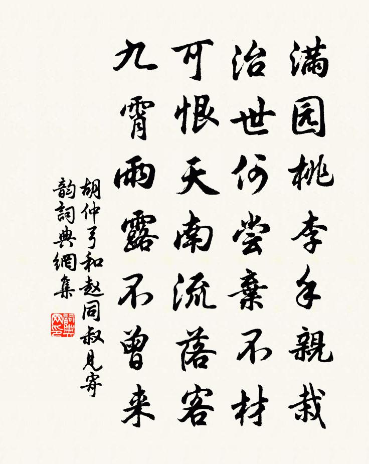 詩詞名句歷史字典書法欣賞書法字典國語詞典說文解字康熙字典古漢語字典標 題 作 者 詩 句 和趙同叔見寄韻作者:胡仲弓 朝代:宋代和趙同叔見寄韻原文滿園桃李手親栽,治世何嘗棄不材。可恨天南流落客,九霄雨露不曾來。詩詞問答問:和趙同叔見寄韻的作者是誰?答:胡仲弓問:和趙同叔見寄韻寫於哪個朝代?答:宋代胡仲弓和趙同叔見寄韻書法欣賞和趙同叔見寄韻書法作品詩詞推薦元日陪早朝歐陽詹〔唐代〕斗柄東回歲又新,邃旒南面挹來賓。和光仿佛樓台曉,休氣氛氳天地春。儀籥不唯丹穴鳥,稱觴半是越裳人。江皋庚子三月二十七日又易守當塗四月十一日發辭岳珂〔宋代〕九重旒冕真知己,幾度弓旌憶款門。素志不為溫飽計,赤心未報聖明恩。鶴汀雲雨暮應卷,牛渚風煙秋欲昏。休向句張俞〔宋代〕昔乃荊棘荒,今為蕙蘭襲。嘉泰二年恭上太皇太后尊號八首佚名〔宋代〕煌煌玉書,玉篆金縷。曷為來哉,自天子所。自天子所,以燕文母。婉嬗祥雲,日正當午。小市暮歸陸游〔宋代〕愛酒行行訪市酤,醉中亦有稚孫扶。林梢殘葉吹都盡,煙際孤舟遠欲無。野餉每思羹苜蓿,旅炊猶得飯雕胡。青山送僧歸護國寺舒雅〔宋代〕偶思皇澤來丹闕,卻為禪齋返舊琳。嶺上白雲終掛念,人間餘事不關心。澄潭雨過秋涵月,古檜風生夜對琴。聞道題水西寺杜牧〔唐代〕三日去還住,一生焉再游。含情碧溪水,重上粲公樓。寄答潘文叔並屬恭叔五首趙蕃〔宋代〕人生無友朋,何以攻短闕。我交君弟兄,意合非固結。奈何不須臾,已復經歲月。葉落政和秋,竹新還縹節。詠史下蘇東坡陳普〔宋代〕方朔優旃豈舜徒,南來謾喜落蒼梧。天津醉裹乾坤眼,只見雙程不見蘇。田間辭三首崔敦禮〔宋代〕朝余往兮蒼東疇,景翳翳兮雲油油。牛驅耕兮載泥重,鞭不前兮挽犁用。歲雲暮兮暮維何,倉庚鳴兮布穀和。疾吾惜分飛·淚濕闌乾花著露毛滂〔宋代〕淚濕闌乾花著露。愁到眉峰碧聚。此恨平分取。更無言語。空相覷。 短雨殘雲無意緒。寂寞朝朝暮暮。今夜山深【越調】憑闌人 題情_翰墨空題鸞吳西逸〔元代〕翰墨空題鸞鳳箋,雲水虛勞魚雁傳。些情鐵石堅,鐵石知幾年? 棲燕樓台詩思迷,睡鴨池塘春漏遲。滿身花影乞櫻桃齊己〔唐代〕去年曾賦此花詩,幾聽南園爛熟時。嚼破紅香堪換骨,摘殘丹顆欲燒枝。流鶯偷啄心應醉,行客潛窺眼亦痴。聞說送牟太素山人文同〔宋代〕山人高跡若孤雲,聊問太虛求所止。昨因隨風起西北,翩然遠墮三隅里。攬之不住瞥爾去,瞬息誰知幾千里。東遊秋日西湖朱浚〔宋代〕幾州陵變谷,經月雨為霖。世事今如此,西風動客心。沈朝議輓詞林季仲〔宋代〕擢第繇元佑,封侯迨紹興。曠懷初不競,薄俗漫多能。勳業一壺酒,交遊八尺藤。諸生話鄉老,揮淚溼寒燈。閱書庫孫應時〔宋代〕寒儒事業趁三餘,細字篝燈手自書。眼底牙籤富連屋,妙年公子意何如。秋氣尚高涼林披〔唐代〕秋氣尚高涼,寒笛吹萬木。故人入我庭,相照不出屋。山川雖遠觀,高懷不能掬。忘機台何耕〔宋代〕太虛生微雲,機事日夕繁。兼忘豈不佳,尚有忘者存。稽首老龐翁,妙處布一言。請觀台上月,萬古無昭昏。詠史詩牛渚胡曾〔唐代〕溫嶠南歸輟棹晨,燃犀牛渚照通津。誰知萬丈洪流下,更有朱衣躍馬人。名句推薦今年海角天涯。蕭蕭兩鬢生華。李清照《清平樂·年年雪裡》 人閒桂花落,夜靜春山空。王維《鳥鳴澗》 芄蘭之葉,童子佩韘。佚名《芄蘭》 風暖有人能作伴,日長無事可思量。楊基《浣溪沙·上巳》 故山知好在,孤客自悲涼。蘇軾《臨江仙·送王緘》 無執滯心,才是通方士;有做作氣,便非本色人。王永彬《圍爐夜話·第八六則》 君子不蔽人之美,不言人之惡。韓非及後人《韓非子·內儲說上七術》 要問相思,天涯猶自短。晏幾道《清商怨·庭花香信尚淺》 婦姑相喚浴蠶去,閒看中庭梔子花。王建《雨過山村》 秋天一夜靜無雲,斷續鴻聲到曉聞。張仲素《秋閨思二首》