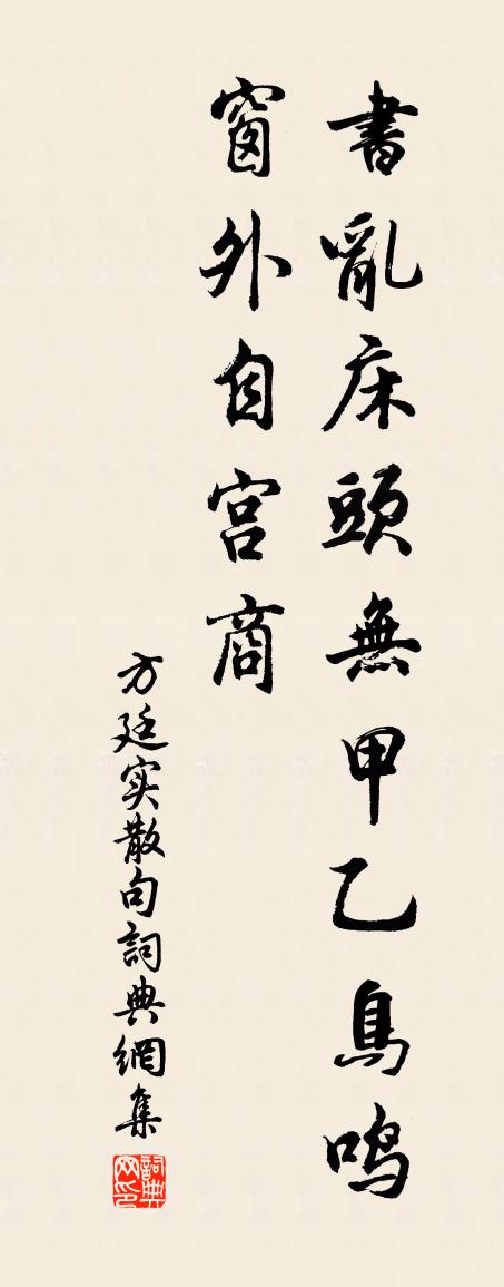 詩詞名句歷史字典書法欣賞書法字典國語詞典說文解字康熙字典古漢語字典標 題 作 者 詩 句 句作者:方廷實 朝代:宋代句原文書亂床頭無甲乙,鳥鳴窗外自宮商。詩詞問答問:句的作者是誰?答:方廷實問:句寫於哪個朝代?答:宋代方廷實句書法欣賞句書法作品詩詞推薦送知府滕光祿朱長文〔唐代〕榜登龍虎亞倫魁,一紀橫飛長憲台。謨議軒昂開日月,辭章雄偉鼓風雷。朝端已慶明良會,廟論鹹推將相才。一跌謝富丞相招出仕二首邵雍〔宋代〕相招多謝不相遺,將謂胸中有所施。若進豈能禁吏責,既閒安用更名為。願同巢許稱臣日,甘老唐虞比屋時。滿眼綠野亭鄭伯玉〔宋代〕路出煙村俗駕少,江天落莫憎寒威。依依壺嶠草樹變,藹藹海門煙火微。日腳下時一雁度,風頭起處雙鴉歸。卻擁出遊不果陸游〔宋代〕天柱峰前水亂流,石棋渡口葉飛秋。青鞋已是前身事,縱有籃輿亦嬾游。八月六日寄鄰幾諸君劉敞〔宋代〕謬為天官屬,得與選事親。略計三百州,綠衣九千人。較材迷長短,守法愧因循。救末知不足,澄源力難伸。諸君山居雜詩九十首曹勛〔宋代〕我生不僥福,始終躬純臣,雖更齊楚偽,常障西風塵。耳順早引年,掛冠逾八春。甘與田畯游,遂予胸次真。瑞鶴仙(元日朝回)史浩〔宋代〕霽光春未曉。擁絳蠟攢星,霜蹄輕裊。皇居聳雲杪。靄祥煙瑞氣,青蔥繚繞。金門羽葆。聽臚唱、千官併到。慶三有觸述懷華岳〔宋代〕英雄還要識英雄,不識英雄總是空。投鼠在人當忌器,見鴻非我獨彎弓。情從忠佞分輕重,事戒恩威戾始終。說與藕花華岳〔宋代〕惜絲不肯織宮鞋,花月仙人謫不來。河伯借泥封玉腕,風神翻流沃香腮。無房不許蜂留宿,有蓋嘗令鷺自開。何事丁未立春張鎡〔宋代〕今歲春從底處回,非關緹室動葭灰。幽人昨夜池塘夢,已見新春草際來。送君晁補之〔宋代〕送君上馬時,不道朝壚燠。春風入木心,皮肌發紅綠。春風良易暮,那得勤行路。且莫望南窗,胡蝶飛無數。郊居五首李復〔宋代〕歲回秋向閏,九日菊未華。青青東籬下,強起折還家。豈無樽中酒,對這空嘆嗟。後日開已晚,棄置今如何。遣懷釋紹嵩〔宋代〕學懶真成懶,龍鍾志未酬。此生多轗軻,何處不遲留。勳業頻看鏡,寒盟得問鷗。羈愁難盡遣,愁儘自無愁。書紅香堂壁喻良能〔宋代〕瓦影鱗鱗蔭曲塘,疏簾不下縱荷香。綠波乍識紅妝面,未忍輕將比六郎。為農陳杰〔宋代〕去國已為農,憂時但願豐。目光牛背上,世呈草廬中。絕異炰羔惲,聊如藝黍通。新來詩亦變,稍稍近豳風。次韻楊宰捕蝗宿競岩四首陳造〔宋代〕去為民勞走險艱,停驂幾問具茨山。只今欲致賢勞謝,詩債徒能準數還。送從弟赴上都劉商〔唐代〕車騎秦城遠,囊裝楚客貧。月明思遠道,詩罷訴何人。雨夜宿龍門曉登靈光台禮佛眼塔釋正覺〔宋代〕一躍龍門適舊懷,稜稜浪級向人開。洗塵雲陣澆華雨,借力天衢破蟄雷。略彴駕溪桃水滿,浮屠瘞骨玉山頹。欲知峴山送張去非游巴東(一題作峴山亭送朱大)孟浩然〔唐代〕峴山南郭外,送別每登臨。沙岸江村近,松門山寺深。一言予有贈,三峽爾將尋。祖席宜城酒,征途雲夢林。蹉跎田父吟五首葉茵〔宋代〕往來雞酒樂村村,一稔允忘大造恩。糶谷可酬婚嫁願,今年好事屬柴門。名句推薦劍外忽傳收薊北,初聞涕淚滿衣裳。杜甫《聞官軍收河南河北》 苦心豈免容螻蟻,香葉終經宿鸞鳳。杜甫《古柏行》 馬穿楊柳嘶,人倚鞦韆笑,探鶯花總教春醉倒。王磐《清江引·清明日出遊》 青山綠水,白草紅葉黃花。白樸《天淨沙·秋》 鴻羽難憑芳信短,長安猶近歸期遠。盧祖皋《倦尋芳·香泥壘燕》 無半點閒愁去處,問三生醉夢何如。喬吉《折桂令·七夕贈歌者》 小童疑是有村客,急向柴門去卻關。崔道融《溪居即事》 丈夫處世兮立功名;立功名兮慰平生。慰平生兮吾將醉;吾將醉兮發狂吟!羅貫中《三國演義·第四十五回》 去年東武今夕,明月不勝愁。蘇轍《水調歌頭·徐州中秋》 仁人之所以為事者,必興天下之利,除去天下之害,以此為事者也。墨子《墨子·15章 兼愛(中)》