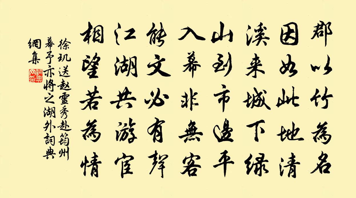 詩詞名句歷史字典書法欣賞書法字典國語詞典說文解字康熙字典古漢語字典標 題 作 者 詩 句 送趙靈秀赴筠州幕予亦將之湖外作者:徐璣 朝代:宋代原文郡以竹為名,因如此地清。溪來城下綠,山到市邊平。入幕非無客,能文必有聲。江湖共遊宦,相望若為情。詩詞問答問:《送趙靈秀赴筠州幕予亦將之湖外》的作者是誰?答:徐璣問:該詩寫於哪個朝代?答:宋代書法欣賞送趙靈秀赴筠州幕予亦將之湖外書法作品詩詞推薦和陶淵明二十首陳造〔宋代〕作計憂患場,賢聖頗中之。淮鄉酒價賤,希復獨醒時。齒髮變今昔,撫己萬負茲。清坐挹飲客,辭費未免疑。客歡送楊氏女韋應物〔唐代〕永日方戚戚,出行復悠悠。女子今有行,大江溯輕舟。爾輩苦無恃,撫念益慈柔。幼為長所育,兩別泣不休。對此洪福寺藤架孔武仲〔宋代〕生長應毫末,敷腴忽十尋。繁花春不歇,密葉書長陰。風過龍蛇動,雲開洞府深。時來學晏坐,朝市不關心。鳥夜啼 月下用前韻劉敏中〔元代〕夜深誰伴中庵。太初岩。滿酌一杯,和月吸濃嵐。瓊露滴。霜鬢濕。興方酣。不覺河傾東北,月西南。寄王季夷陸游〔宋代〕平生吾子最知心,巴隴飄零歲月侵。萬里喜聞身尚健,五更惟有夢相尋。插花意氣狂如昨,中酒情懷病至今。共約飲酒陸游〔宋代〕六十四民安在哉?千八百國俱煙埃。世人一漚寄巨海,對酒不醉吁可哀!平生清狂今白首,芒屨布裘稱野叟。晨興江梅蠟梅同賦項安世〔宋代〕淡白輕黃著絳跗,截肪蒸栗玉肌膚。品題道骨誰高下,著莫清香似有無。野服黃冠離世土,縞裙瑤佩列仙儒。春風和黃秋韻趙必象〔宋代〕騷壇分戍打愁城,奏凱梅邊緩轡行。詩債填償難一頓,酒緣結習是三生。未能范蠡浮輕舸,且學靈均賦落英。落魄絕句二首劉克莊〔宋代〕枝上好花無十日,松梢老葉有千年。靜中勘破人間世,醒者常愚醉者賢。晨起有感張耒〔宋代〕故歲如曉客,行意不可留。新春如美人,含笑未舉頭。定知當粲然,有待姑少留。山川諜光景,梅柳露風流。惟有摸魚兒(壽覺非居士)葛長庚〔宋代〕雨肥梅、亭台初夏。曇花開向前夜。純陽鶴會先三日,何處神仙降駕。知得也。□□是、西山彭抗來胎化。平生性行小圃偶成唐律呈直翁自昭叔夏吳潛〔宋代〕今年花信已成空,白白紅紅苦雨中。老境摧頹春更好,愁城高聳酒難攻。一生當號知非子,萬事都歸亡是公。巴得緣識宋太宗〔宋代〕庶事情多感,光陰自古長。貪痴何意遣,愚輩為誰忙。紅葉隨時變,白頭最易傷。世途能及物,善德遠馨香。武三思徐鈞〔宋代〕群賢逐去在朝空,宮禁潛歸掌握中。若使當時誅不早,崇恩廟貌又興隆。蜀州西湖范成大〔宋代〕閒隨渠水來,偶到湖光里。仍呼水月舟,徑度雲錦地。誰雲不解飲,我已荷香醉。湖陰玉嬋娟,敻立紅妝外。何須隱侍者游乳峰釋智愚〔宋代〕竇深惟古雪,霄岸更危巒。到者難披頂,尋師多賣單。無時雲氣重,長帶瀑聲寒。挨得入門句,歸來示我看。嘲少年李賀〔唐代〕青驄馬肥金鞍光,龍腦如縷羅衫香。美人狹坐飛瓊觴,貧人喚雲天上郎。別起高樓臨碧筱,絲曳紅鱗出深沼。有時淳熙十五年上高宗徽號三首真宗〔宋代〕中興之烈,高掩商宗。揖遜之美,放動比隆。字十有六,擬諸形容。威靈在天,裕後無窮。古意二首王阮〔宋代〕西風策策翻葉鳴,錦機停梭人暗驚。歸心俗附潮頭去,潮頭不肯到湓城。送范仲訥往合肥三首 其一姜夔〔宋代〕壯志只便鞍馬上,客夢長到江淮間。誰能辛苦運河裡,夜與商人爭往還。名句推薦淑氣催黃鳥,晴光轉綠蘋。杜審言《和晉陵陸丞早春遊望》 橫看成嶺側成峰,遠近高低各不同。蘇軾《題西林壁》 松下問童子,言師採藥去。賈島《尋隱者不遇 / 孫革訪羊尊師詩》 日斜江上孤帆影,草綠湖南萬里情。劉長卿《別嚴士元》 二月黃鶯飛上林,春城紫禁曉陰陰。錢起《贈闕下裴舍人》 戰陣之間,不厭詐偽。韓非及後人《韓非子·難一》 雨雪自飛千嶂外,榆林只隔數峰西。朱彝尊《出居庸關》 雨後寒輕,風前香軟,春在梨花。仲殊《柳梢青·吳中》 一壺酒,一竿身,快活如儂有幾人。李煜《漁父·浪花有意千里雪》 隔戶楊柳弱裊裊,恰似十五女兒腰。杜甫《絕句漫興九首·其一》