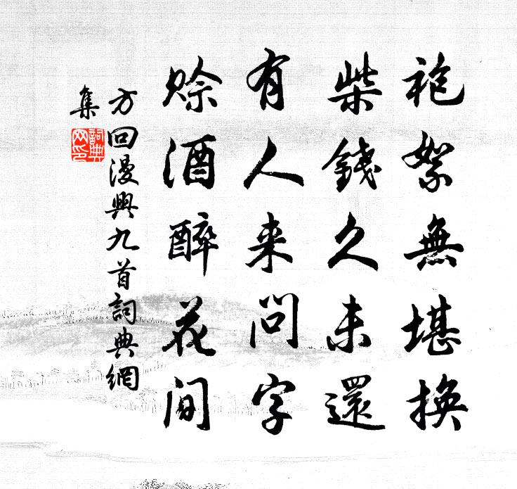 詩詞名句歷史字典書法欣賞書法字典國語詞典說文解字康熙字典古漢語字典標 題 作 者 詩 句 漫興九首作者:方回 朝代:宋代漫興九首原文袍絮無堪換,柴錢久未還。有人來問字,賒酒醉花間。詩詞問答問:漫興九首的作者是誰?答:方回問:漫興九首寫於哪個朝代?答:宋代方回漫興九首書法欣賞漫興九首書法作品詩詞推薦清醇酒頌黃庭堅〔宋代〕清如秋江寒月,風休波靜而無雲。醇如春江永日,遊絲落花之困人。借之以涪翁清閒,鑒此杯麵淥。本之以李叟孝遂初泉趙蕃〔宋代〕荊溪溪水清無底,下有亂石白齒齒。東坡先生所止居,想像神遊應不死。後來高躅嗣者誰,東門孫氏賢塤篪。不惟雙雁兒佚名〔宋代〕這心事、倚他誰。偈頌六十首釋曇華〔宋代〕識得橙子,周匝有餘。識得橙子,天地懸殊。若向周匝有餘處會,理上偏枯。若向天地懸殊處會,事上偏枯。七言二首奉答簽判學士蘇頌〔宋代〕兩篇華藻敵南金,辱贈應憐舊賞音。平日所知誰莫逆,老年於事已無心。雲霄路在看君上,詩酒盟寒且共尋。屈指南軒曾極〔宋代〕劍磨驢膊倦征途,三歲南軒客寓居。建業水甘供日飲,波間亦有武昌魚。壬戌立冬十朋十一日陪路文周朋攜提祖同訪後王洋〔宋代〕養生無欠亦無餘,種竹圈籬草結廬。鑒地覓甘分乳脈,鋤田得實飽新蔬。壁間數本空王像。架上都無養性書。我自壽傅守釋若芬〔宋代〕教令浮民一歲期,只將平易抗澆漓。朝廷若用循良課,換取樵川老吏歸。飲潤父家黃庭堅〔宋代〕齋合寒麝薰,書帙映斜景。偶來樽俎同,延此笑言頃。宮線添尺余,朝來日未永。一醉解語花,萬事畫地餅。要似題余仲祥松齋裘萬頃〔宋代〕芳妍桃李場,紛趨欻成蹊。長松坐偃蹇,遂爾不見知。平生異時人,不與俗轉移。蕭然塵埃中,擅此丘壑奇。窗空寄貫休裴說〔唐代〕憶昔與吾師,山中靜論時。總無方是法,難得始為詩。凍犬眠乾葉,飢禽啄病梨。他年白蓮社,猶許重相期。和江鄰幾見寄梅堯臣〔宋代〕清風當晝起,吹我庭下槐。軒軒枝上葉,碎影亂綠苔。左右無人聲,時有啼禽來。啼禽感所懷,其音一何哀。思歸送李梁山之官二首魏了翁〔宋代〕質行疑似鈍,至論本亡奇。一寸虛靈地,千年德政碑。更窮山犖确,毋嘆路逶遲。官職時來作,天公自已知。賀新郎(又有實告以九月二十七日者,因和葉少蘊縷字韻並寄)陳亮〔宋代〕昵昵駢頭語。笑黃花、重陽去也,不成分數。傾國容華隨時喚,依舊清歌妙舞。苦未冷、都無星暑。恰好良辰花共皇雅十首《大鹵》二章尹洙〔宋代〕冀州之疆,粵惟大鹵。俗忮而專,地扼而固。協比幽都,盪搖邊圉。三垂既夷,凶威弗沮。帝御六師,百萬貔虎。送顏主簿之懷安釋善珍〔宋代〕古廨大江邊,多閒少俸錢。鳳棲仇覽棘,虹貫米家船。心靜佛三昧,時來官九遷。外台兼督府,幕下正須賢。鵲踏枝·誰道閒情拋擲久馮延巳〔五代〕誰道閒情拋擲久?每到春來,惆悵還依舊。日日花前常病酒,不辭鏡里朱顏瘦。河畔青蕪堤上柳,為問新愁,何事縣君赴興慶宮朝賀載之奉行冊禮,因書即事權德輿〔唐代〕合卺交歡二十年,今朝比翼共朝天。風傳漏刻香車度,日照旌旗彩仗鮮。顧我華簪鳴玉珮,看君盛服耀金鈿。相期破虜凱歌二十四首周麟之〔宋代〕何事圖形到九墀,豈容鬼質近神奎。君王欲作諸戎戒,不惜雲章手自題。醉花陰(次韻印師)葛勝仲〔宋代〕東皇已有來歸耗。十里青山道。凍櫱萬株梅,一夜妝成,似趁鳴雞早。年時清賞曾同到。先仗游蜂報。抖擻舊心情名句推薦安居不用架高堂,書中自有黃金屋。趙恆《勸學詩》 醉別江樓橘柚香,江風引雨入舟涼。王昌齡《送魏二》 聚斂者,召寇、肥敵、亡國、危身之道也荀子《荀子·王制》 家國興亡自有時,吳人何苦怨西施。羅隱《西施》 行高者,名自高。人所重,非貌高。李毓秀《弟子規·泛愛眾》 古之人,得志,澤加於民;不得志,修身見於世。窮則獨善其身,達則兼善天下。孟子《孟子·盡心章句上·第九節》 寵柳嬌花寒食近,種種惱人天氣。李清照《念奴嬌·春情》 但憑闌無語,煙花三月春愁。鄭覺齊《揚州慢·瓊花》 將軍金甲夜不脫,半夜軍行戈相撥,風頭如刀面如割。岑參《走馬川行奉送出師西征 / 走馬川行奉送封大夫出師西征》 洛陽城東桃李花,飛來飛去落誰家?劉希夷《代悲白頭翁 / 白頭吟 / 有所思》